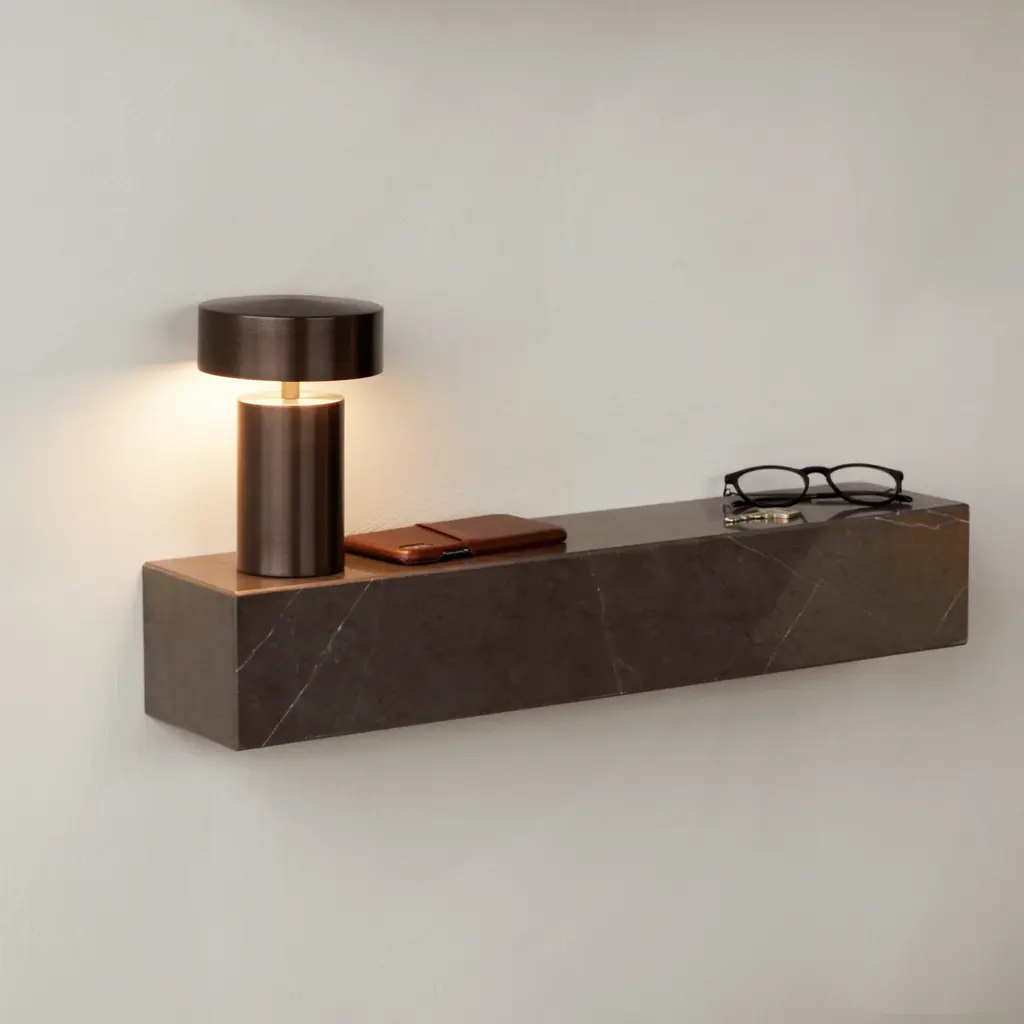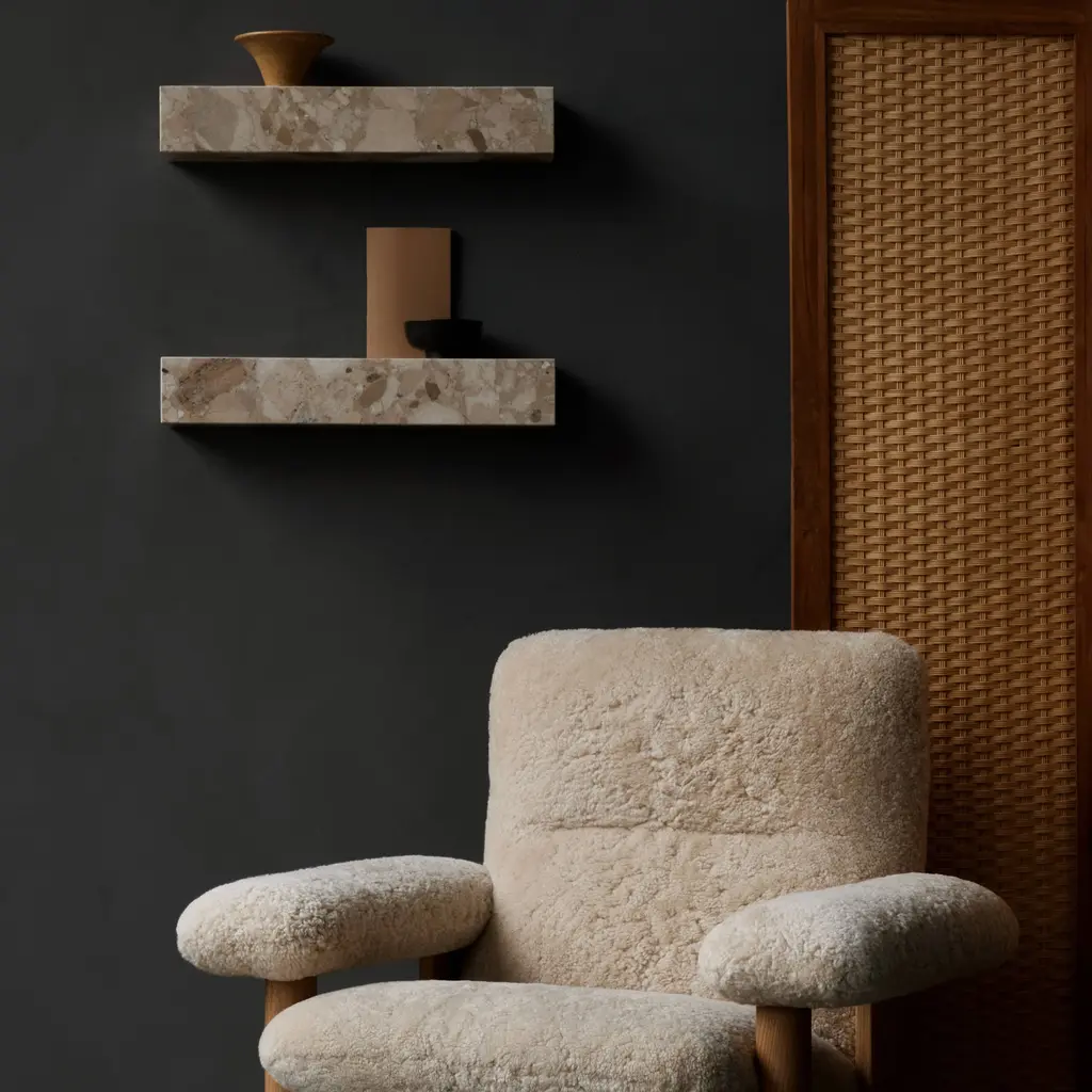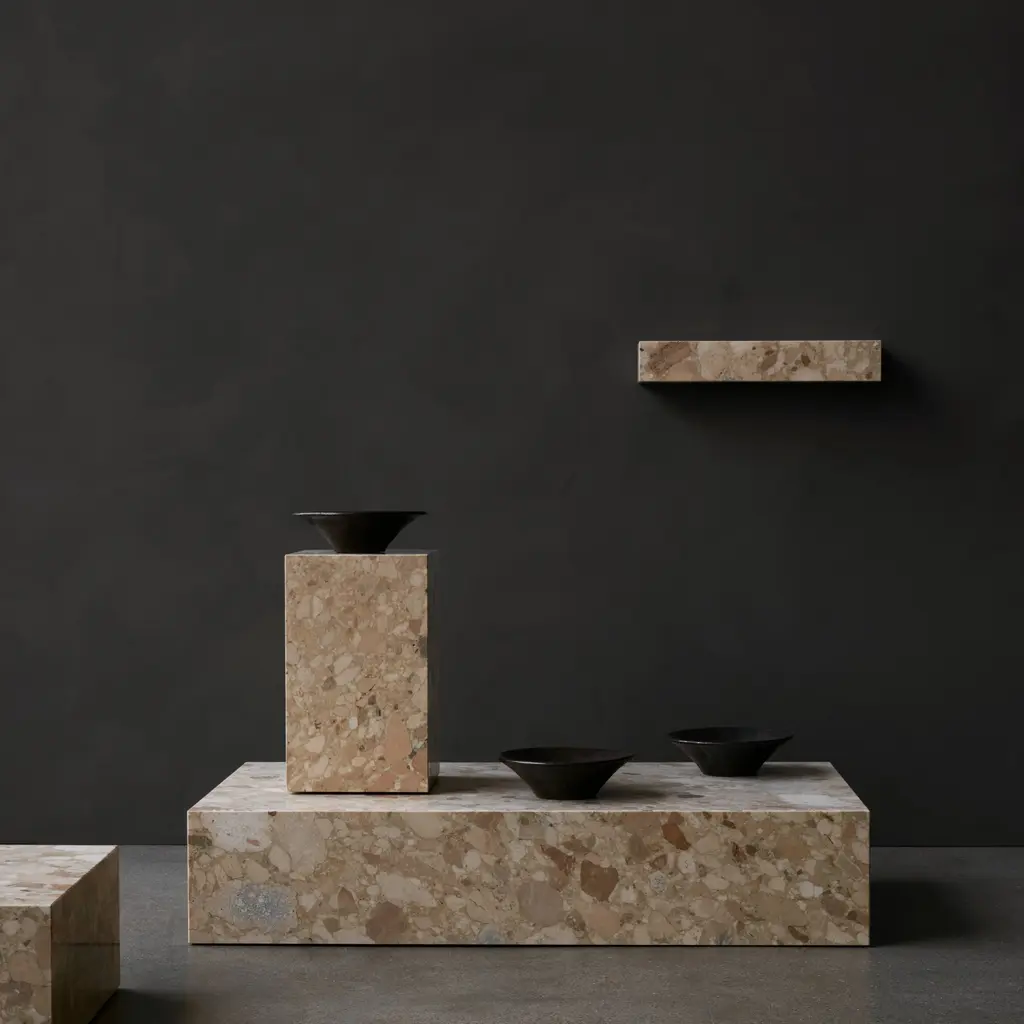 Design group Norm Architects shapes Plinth Shelf from Grey Kendzo, a rich midtone marble with brilliant white veining. Carefully selected for its inherent beauty and light-reflecting qualities, it makes for an elegantly minimal shelf to be attached horizontally to a wall as a display ledge or bookshelf or vertically as a wall-mounted platform on which to showcase a favorite object.