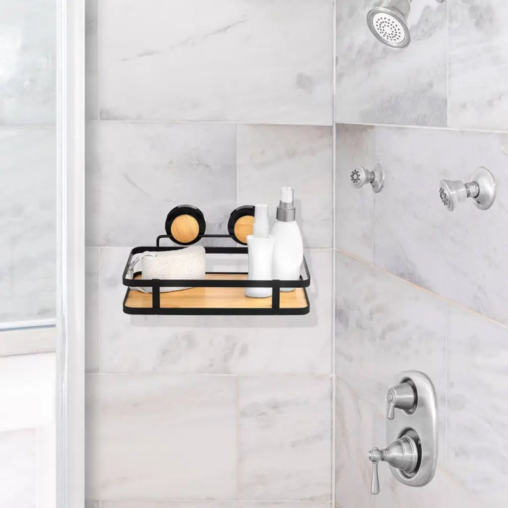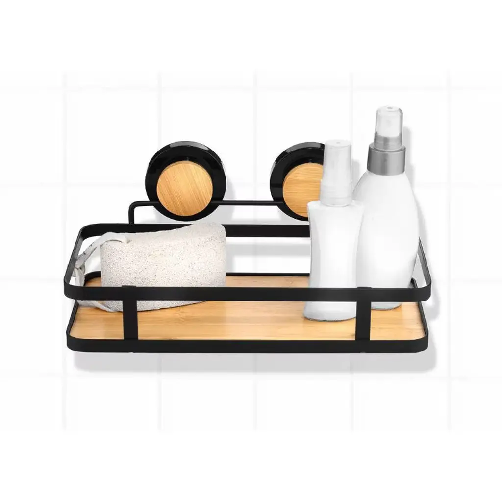 Maximize your bathroom storage with the Elmwood black Metal Suction Cup rectangular shelf with Bamboo. This stylish and practical corner caddy combines the strength of metal with the natural elegance of bamboo, offering a versatile storage solution for your shower or bathroom. Featuring a compact design, this metal corner caddy comes with powerful suction cups that firmly adhere to smooth surfaces like tiles and glass, ensuring that it stays securely in place.