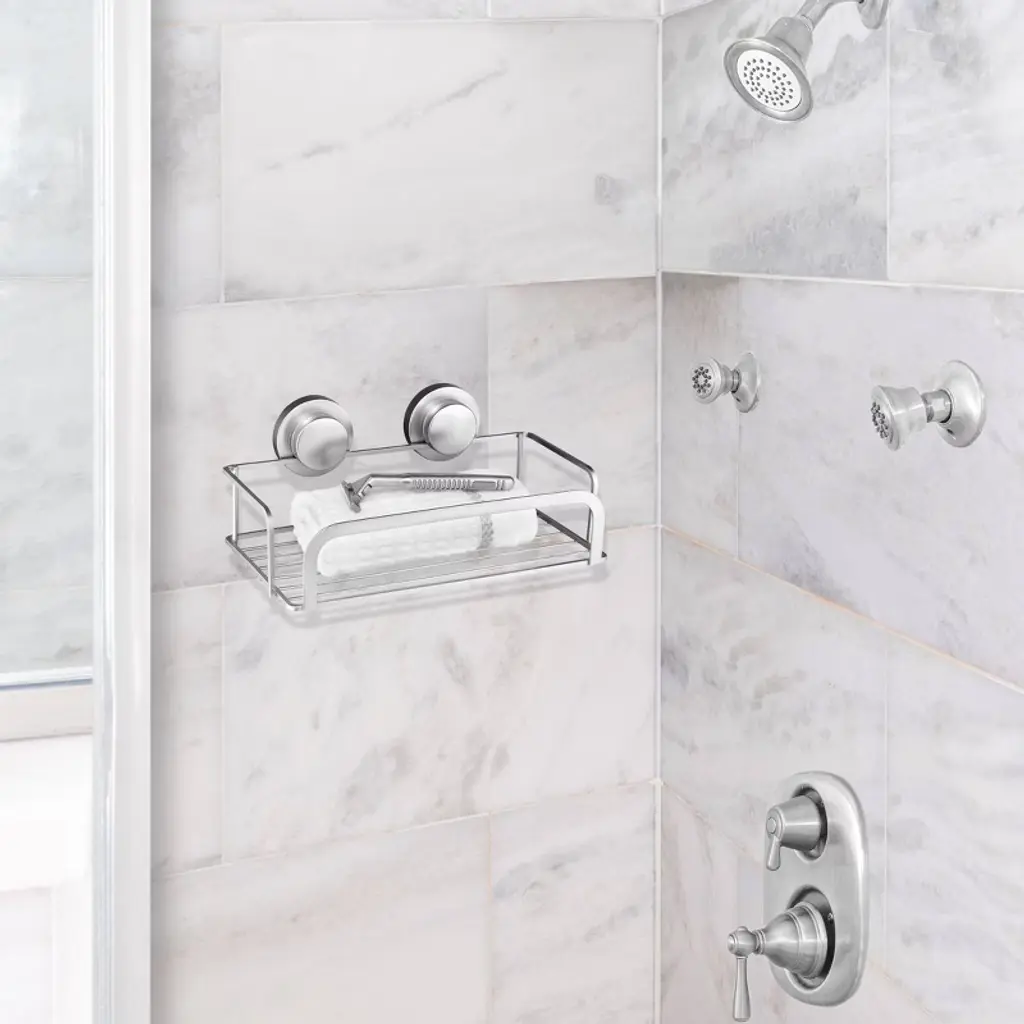 Maximize your bathroom storage with the Chelsea Nickel rectangular shelf w/ suction. This stylish and practical rectangular shelf combines the strength of metal with powerful suction cups that firmly adhere to smooth surfaces like tiles and glass, ensuring that it stays securely in place. Dimensions are 10.24” x 5.83” x 2.48”