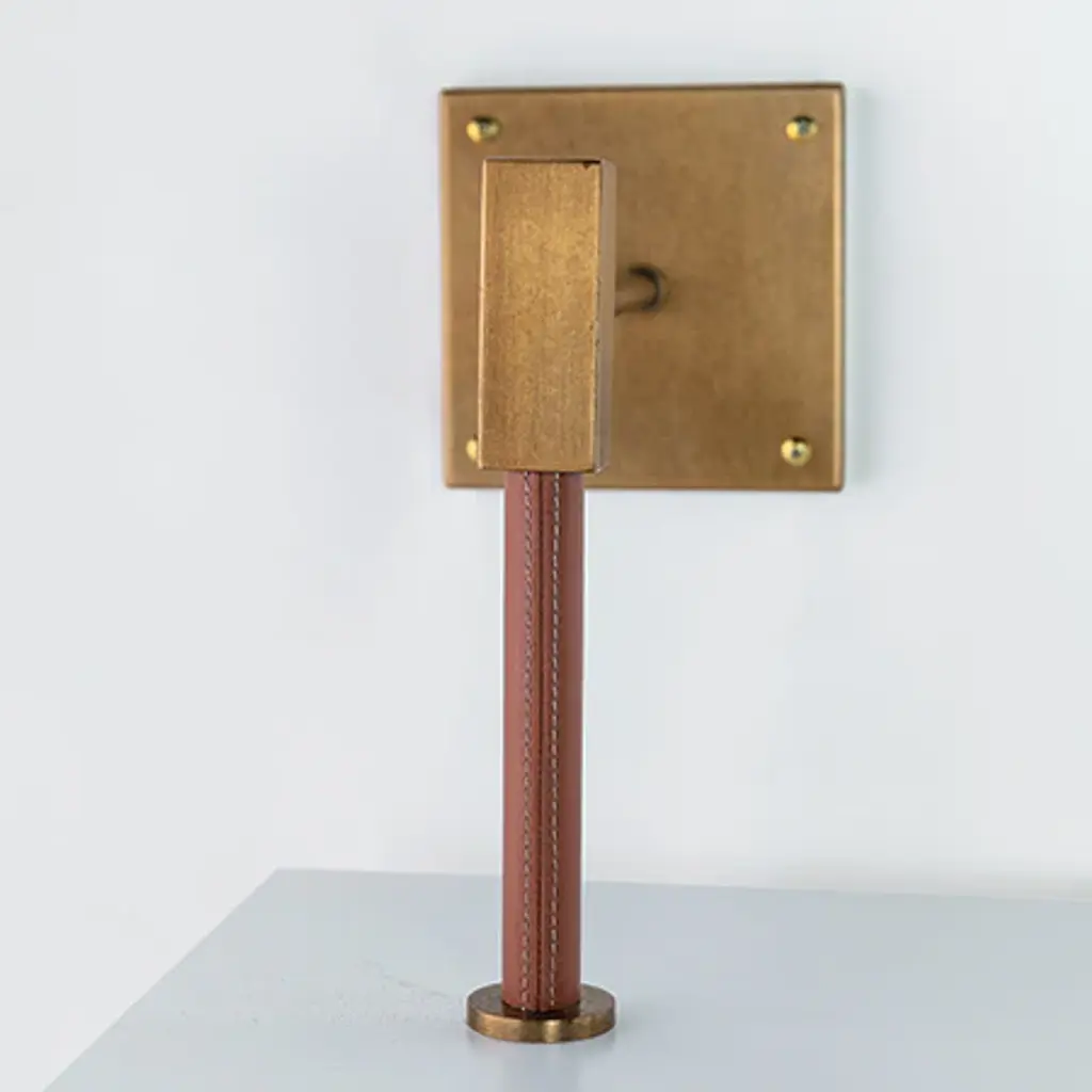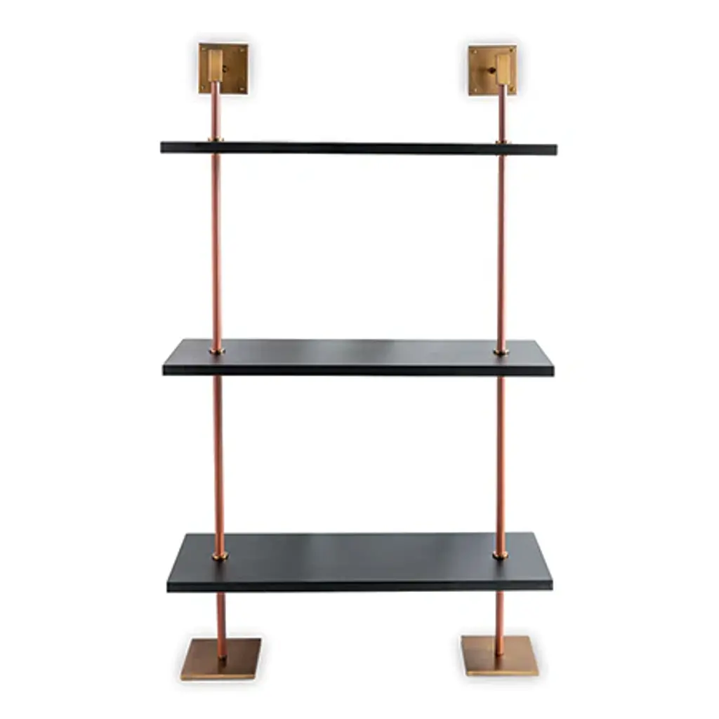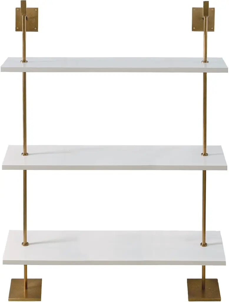 Keep organized in style with this three-tiered modern wall shelf, crafted of brown leather and aged brass with three stacked shelves finished in glossy white or black! T