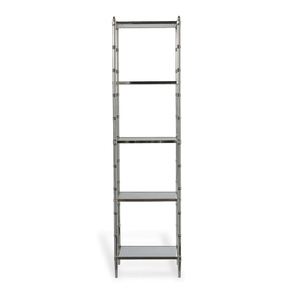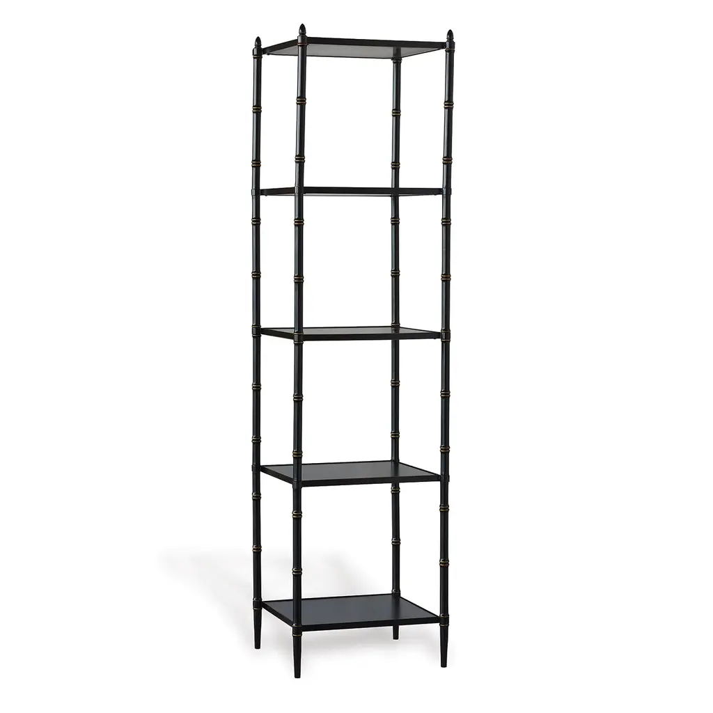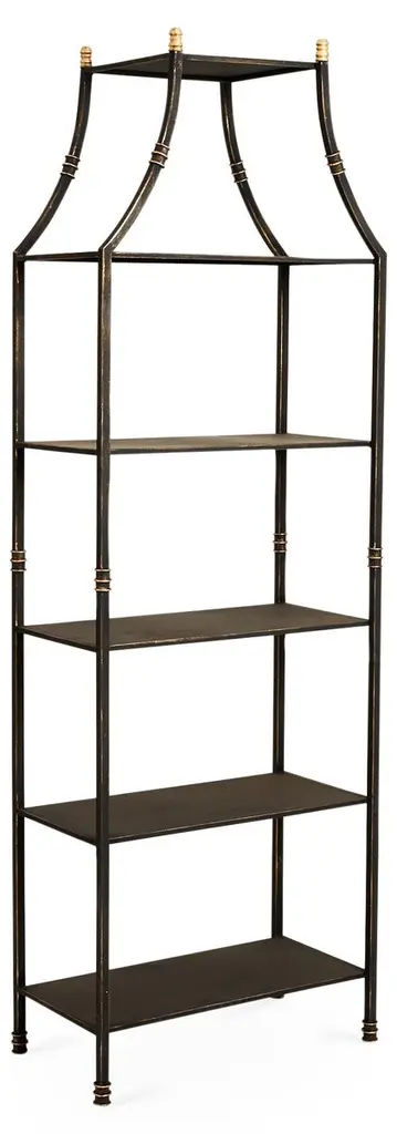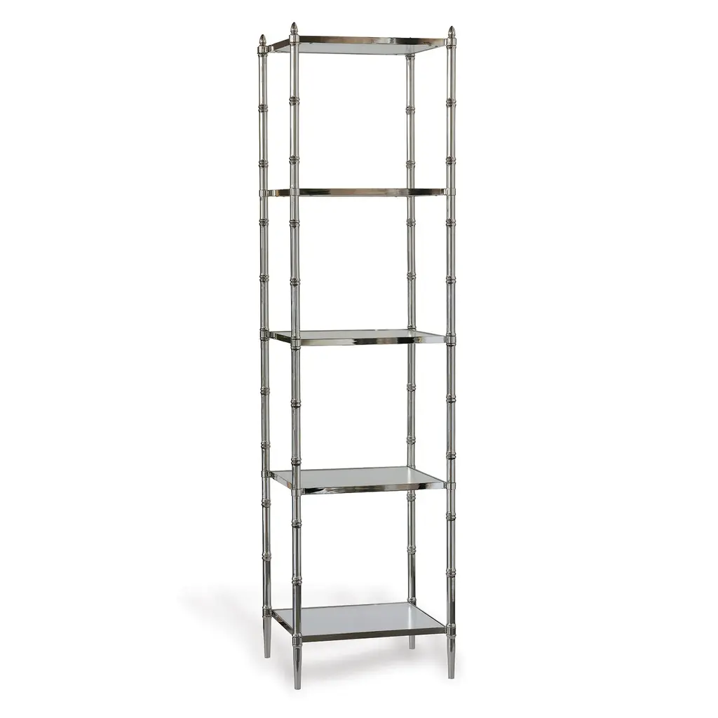 The Doheny bronze etagere by Port 68 is a timeless classic for any room. Used as pairs in the living or dining room, or in the master bath with thick towels stacked--- the etagere is a designer basic with its accents of bamboo. The trim and bamboo supports are made of steel and finished in an antiqued bronze, brass, or nickel finish. The MDF insert shelves secure to the metal shelf frame and are finished in gloss black. Ever so chic! Please note: the etagere is shipped knocked down. Minor assembly is required with easy assembly instructions. Our shelves may also attach to the wall for extra stability if required with a metal L clip. All instructions and hardware included. Shelf unit includes adjustable nylon glide feet. Material: Steel, MDF Finish: Antique Bronze, Nickel, or Brass Dimensions: 20" W x 78" H x 18" D Weight: 51 lbs. Ships Via: UPS Free shipping in the U.S.