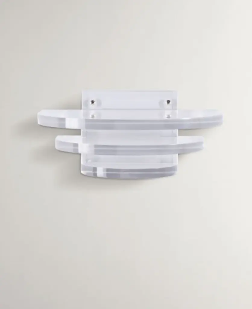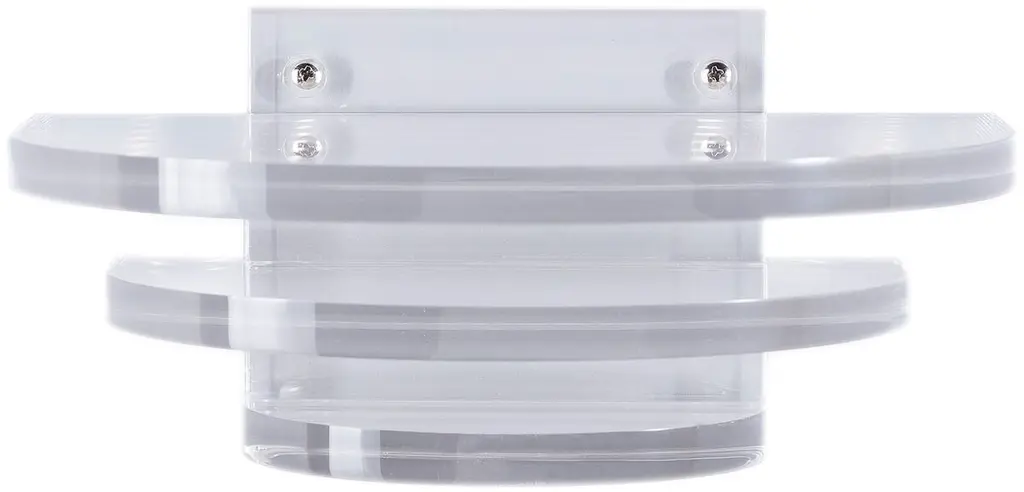 Modern deco inspired round shaped wall shelf in lucite. Two nickel finished screws allow you to easily mount this shelf to the wall. With a 11" width, the shelf will hold our jars and vases for a contemporary wall décor statement. Show in pairs or in multiples for a dramatic display of your collection of porcelains or objects. Material: Lucite Dimensions: 11" W x 5" H x 8.5" D Ships Via: UPS Free shipping in the U.S.