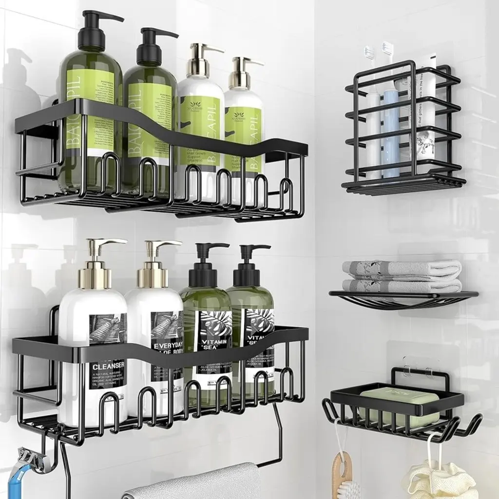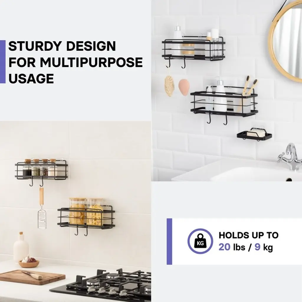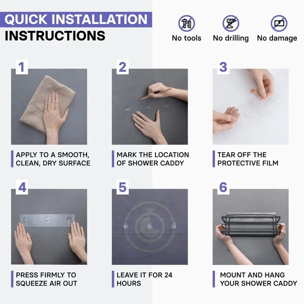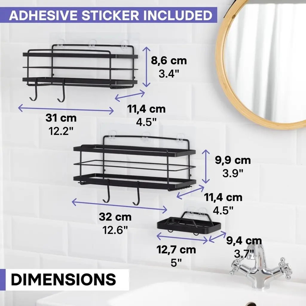3-PACK SPACE SAVER: These hanging shower caddies and soap holder can help you store daily products, and make your home tidier. The large storage capacity provides enough space to put items. And its depth prevents the items from crashing down. STRONG BEARING & FAST DRAINING: The magic traceless adhesive ensures a robust hold, supporting up to 15 pounds of heavy items for extended periods. The open bottom design allows for quick drainage and fast drying, making it an ideal choice for home storage. EASY TO INSTALL & NO DAMAGE: The transparent traceless adhesive is more durable and sturdier than suction cups, requiring no drilling or wall damage. The extra hooks are removable, allowing you to reposition them anywhere, anytime. SUS304 DURABLE & STURDY: Made from 100% rustproof 304 stainless steel, this caddy is non-fading, scratch-resistant, and built to last. Its smooth surface prevents scratches and ensures your items stay undamaged. Compartments: Includes 2 shower caddies, 1 soap holder, 1 user manual, 4 hooks, and 3 adhesives. Enjoy our friendly customer service for any assistance you need.