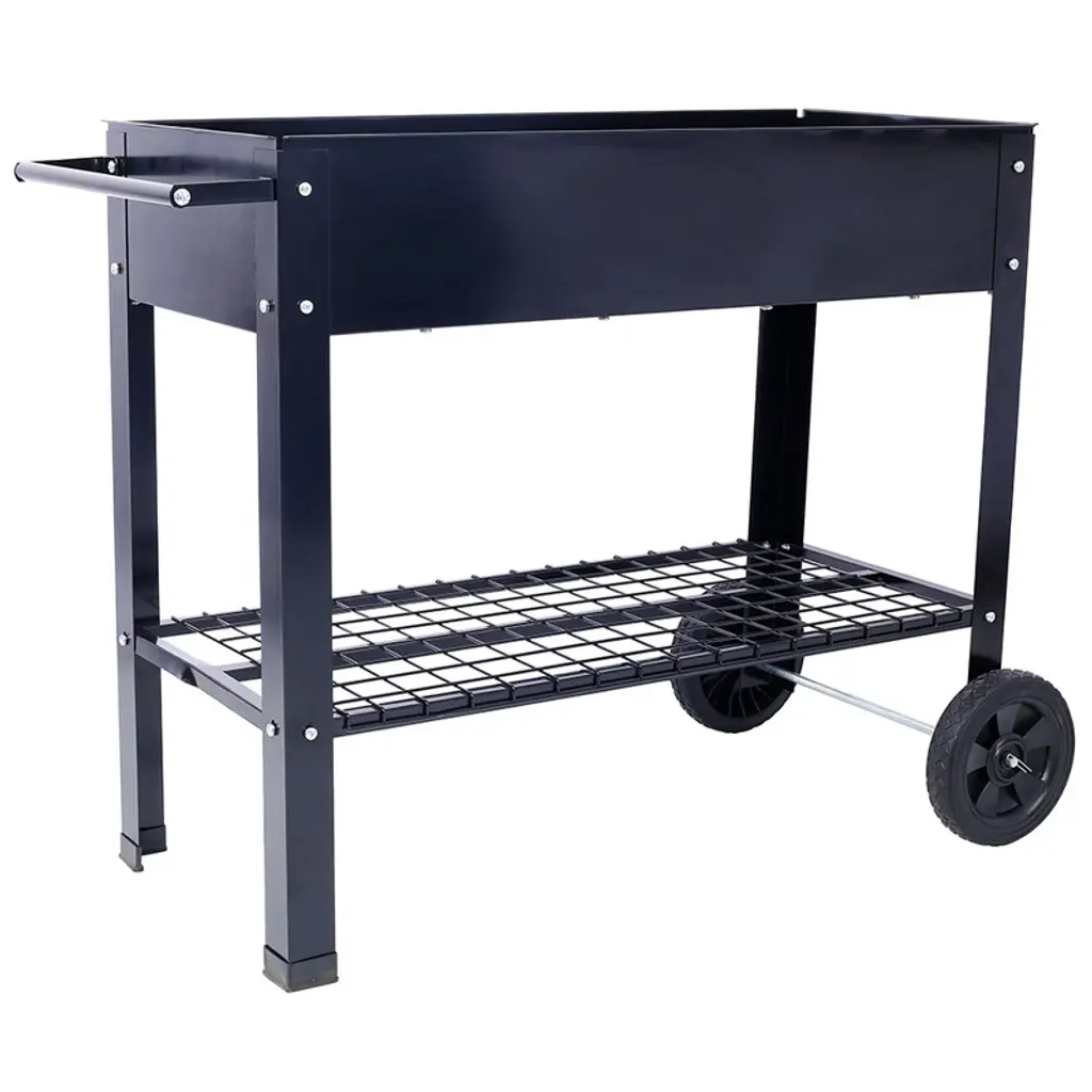 Products Elevated Mobile Raised Ergonomic Metal Planter Garden Bed For Backyard, Patio W/wheels, Lower Shelf, Black