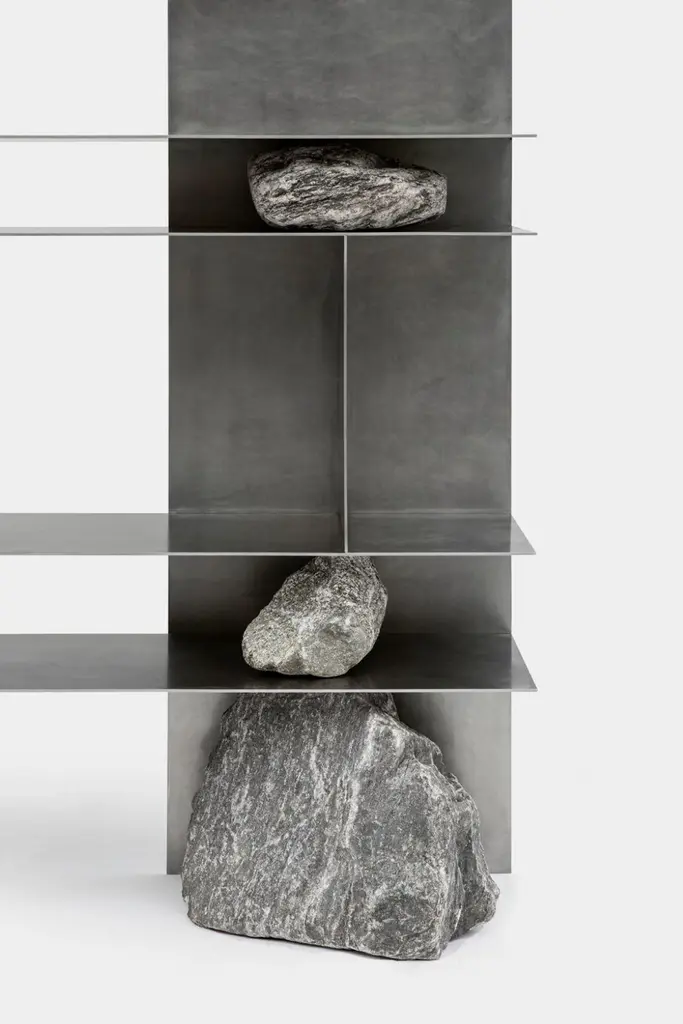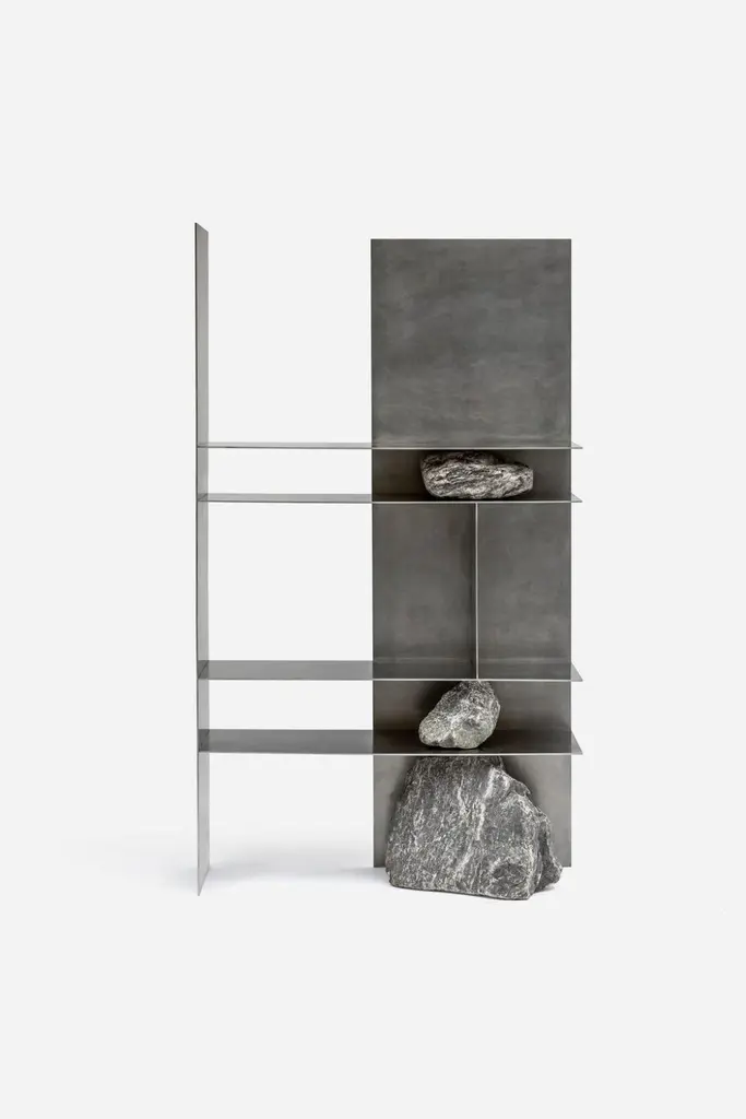 Proportions of Stone Shelf 03 by Lee SisanDimensions: W 120 x D 40 x H 200 cmMaterials: Stainless steel, natural stoneEach piece is made to order and uses natural stones, so please expect some variability in design."Proportions of stone" is a modeling experiment on the fundamentality of stone cast away by natural phenomena. Consisting of tables, chairs, and other functional furniture pieces, the dimensions of each piece were determined by the stones borrowed from nature. The shapes and functions of the designs were only formed after. Stones mounted on manufactured steel plates play both structural and aesthetic roles. These juxtaposed mediums are opposite, yet balanced - fulfilling the artist's desire to "balance the relationship between nature and artifact."Lee Sisan is a designer and artist based in Seoul, South Korea. He majored in interior design to explore the relationship between nature, artifact and humans. He identifies the essence of the material and make form of refined language. He conducts experiments in which man-made beings coexist in harmony with nature and maintain balance.