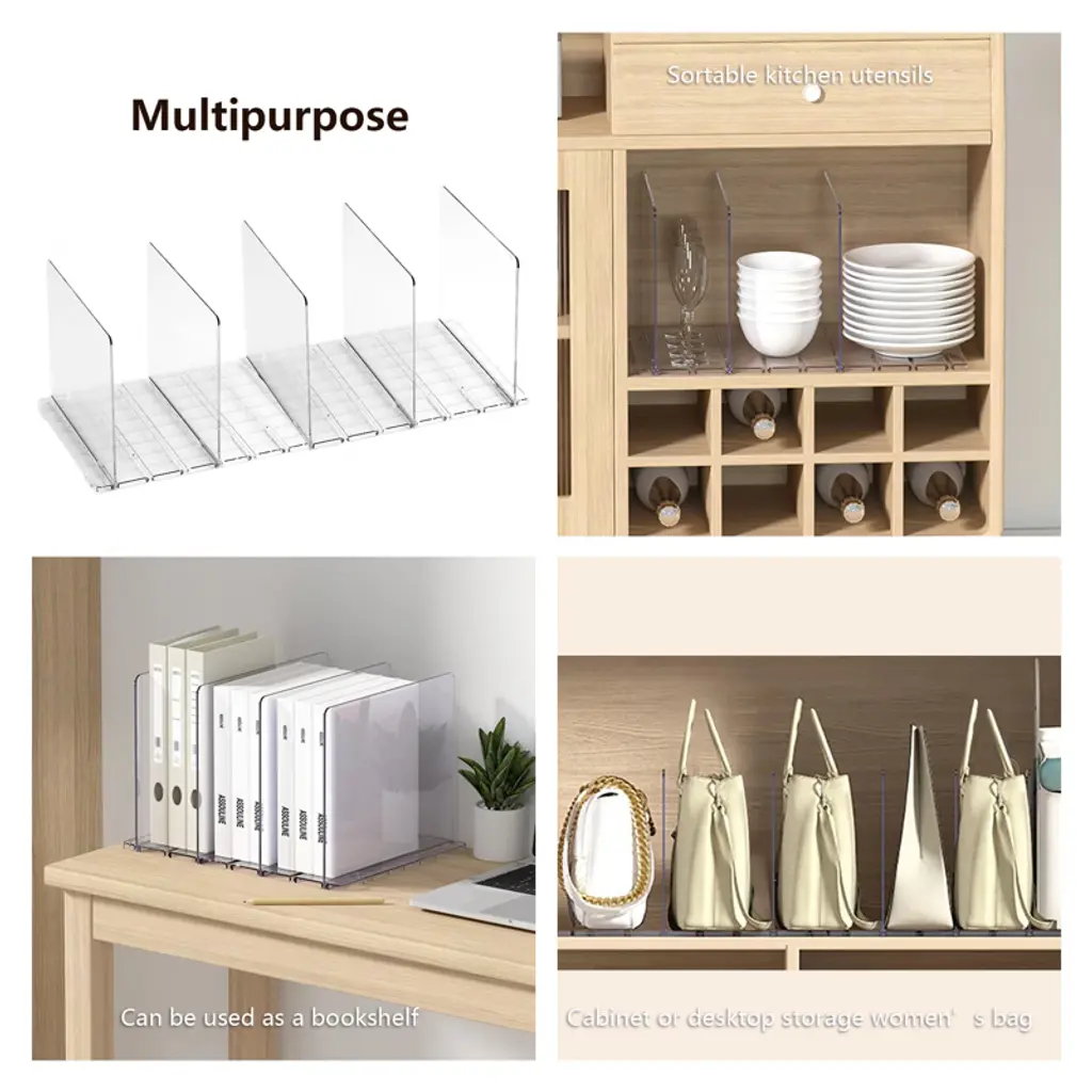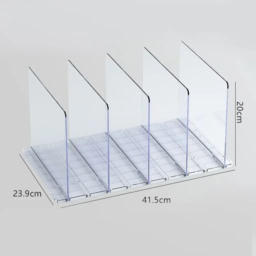 Description: Name: Divider Shelf Material: ABS Color: transparent Size: 41.5 x 23.9 x 20cm Specifications: 5 rows Suitable for: bedroom. kitchen. office Packing list: 1 x Base 5 x Divider Shelf Note: Different displays may cause the color of the item in the picture a little different from the real thing. Manual measuring,please allow 1~3mm error,thank you.