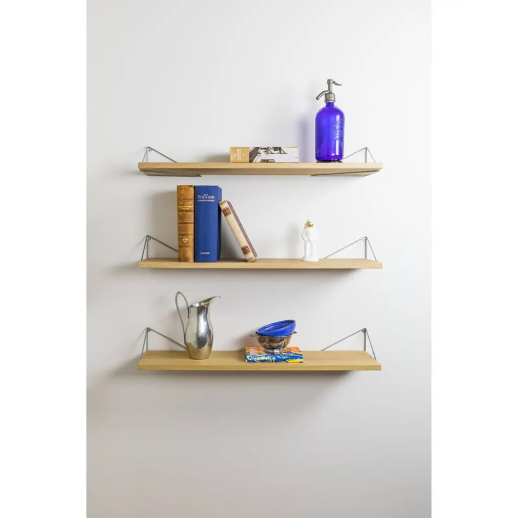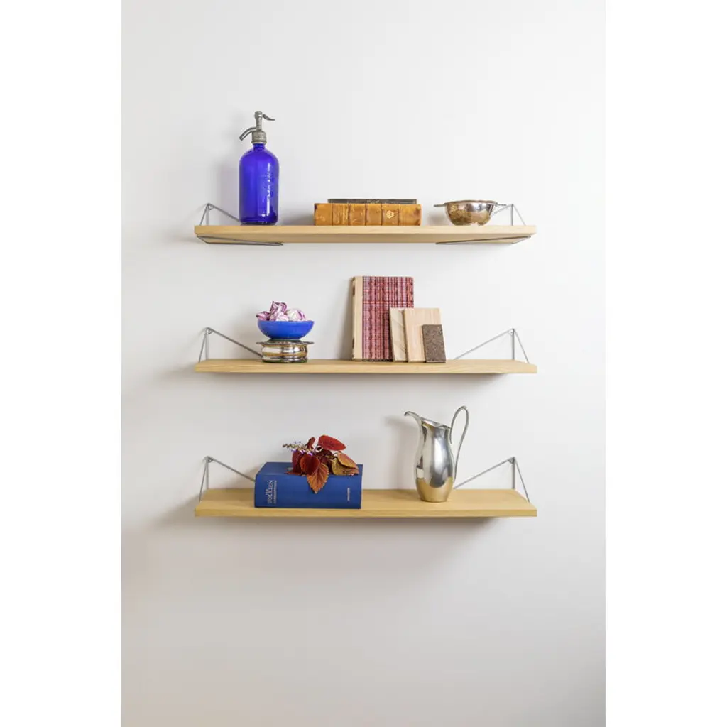 The Pythagoras shelf by the Swedish brand Maze is part of a unique shelving system which combines the preciseness of mathematics with the creative possibilities of design. Designed by Gustav Rosén, the Pythagoras collection was inspired by the Pythagoras' triangle theorem, making a triangle the base and most essential element of the shelving system. Pythagoras wall brackets, shelves, and drawers give you the freedom to create shelves of various sizes, colors and shapes in any space. Use them to build a single wall shelf, bedside table, corner shelf, set of kitchen drawers, or a large shelving module covering an entire wall. The wall brackets can be mounted either below or above the shelf or drawer in four different positions, and their airy design leaves room for blank space as well. Play, experiment, and create the perfect shelf for your own needs! The set includes three shelves, brackets are sold separately.