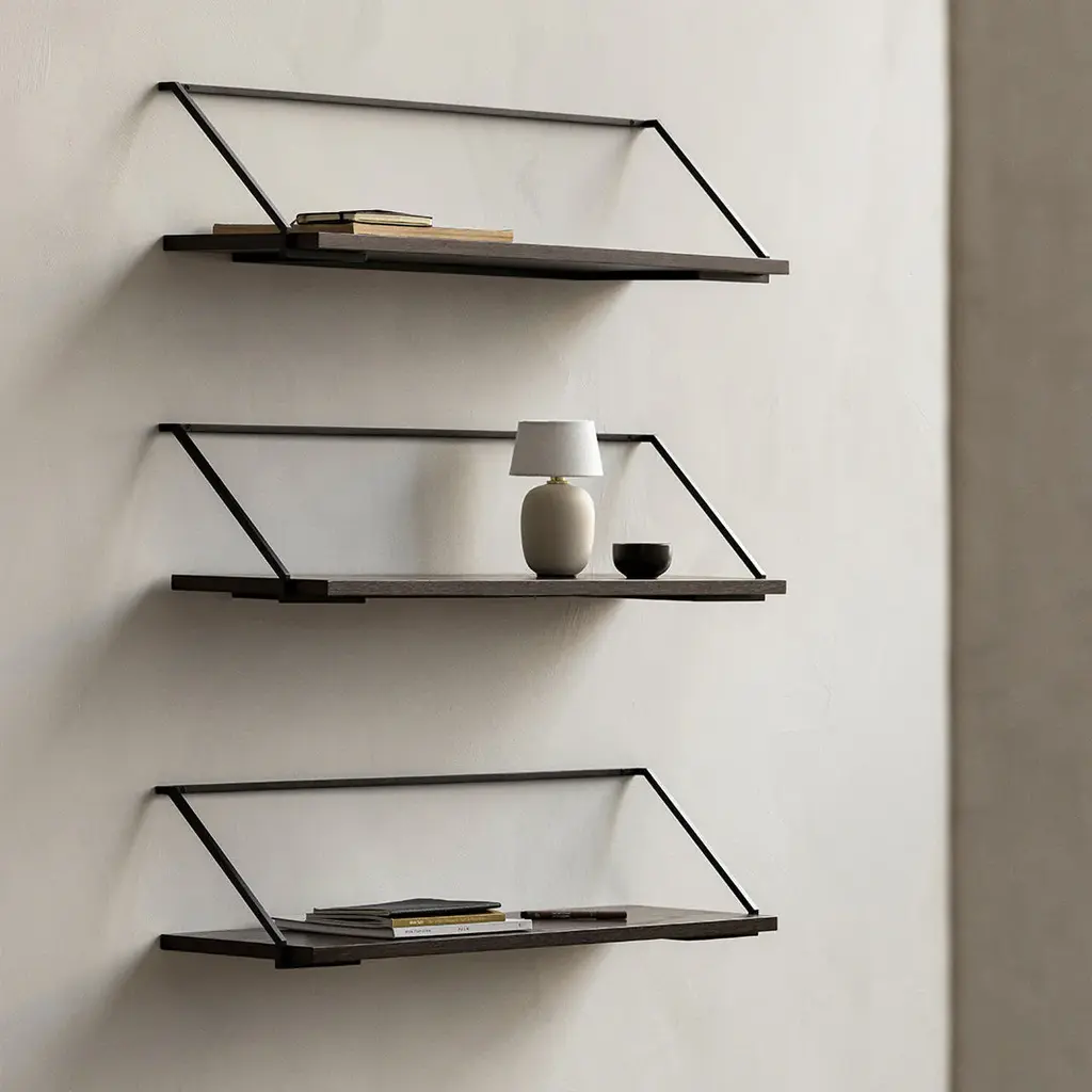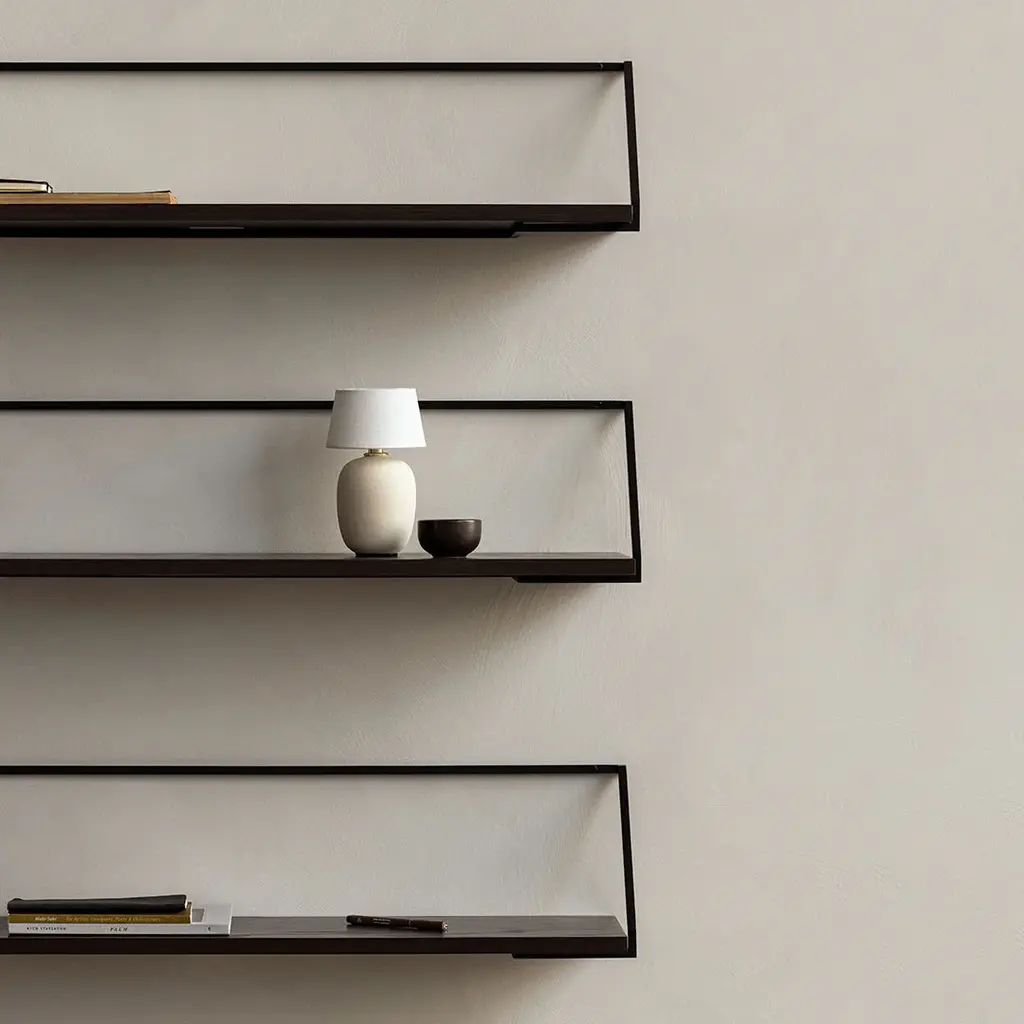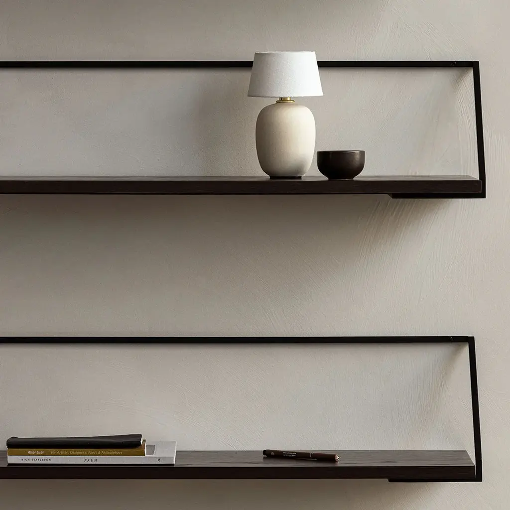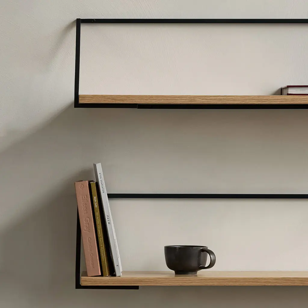 The Rail Shelf, created for MENU by Japanese designer Keiji Ashizawa, takes its cues from the world of architecture and the way in which we use space. The wall-mounted design features a lightweight steel bracket, inspired by metalwork handrails, and a tactile wooden shelf, offered in natural or dark stained oak. Elegantly minimal, Rail Shelf fits neatly into spaces to provide an understated backdrop for favorite objects.