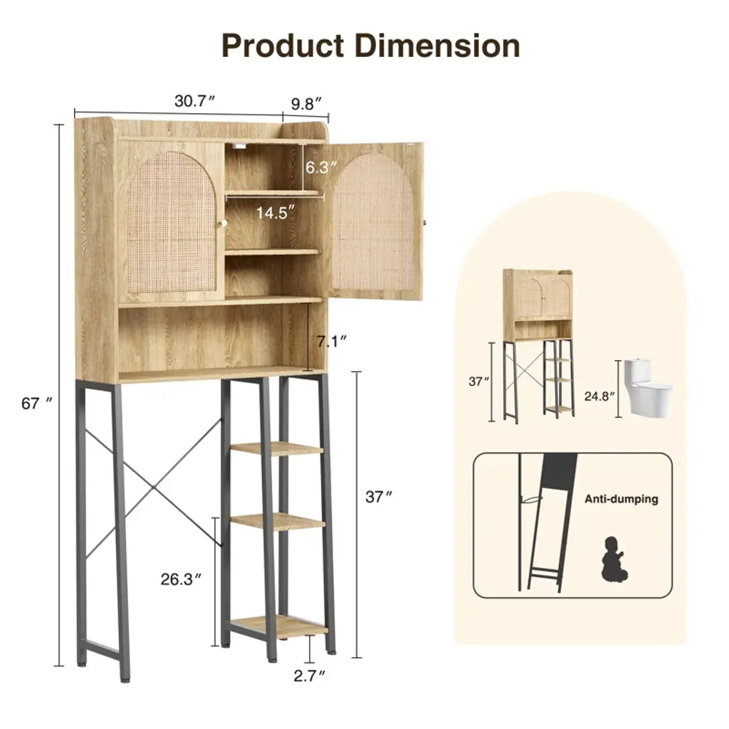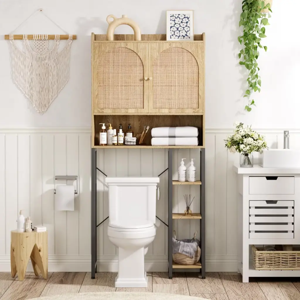 This over-the-toilet storage cabinet blends elegance and craftsmanship, featuring a wooden body with arched handmade rattan double doors and a black metal frame. The natural wave texture of the rattan, paired with wave wood grain and plant decorations, creates an ethnic, personalized vibe. It offers ample storage for towels, bath products, and more, with shelves perfect for displaying decor—just measure your bathroom space first. Made of sturdy P2 board, it has an X-type metal crossbar reinforcement, adjustable feet, and anti-tip accessories for stability. Silent hinges and magnetic door stops ensure durability and easy cleaning.