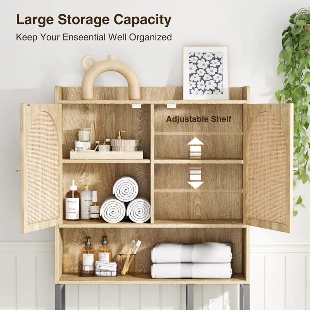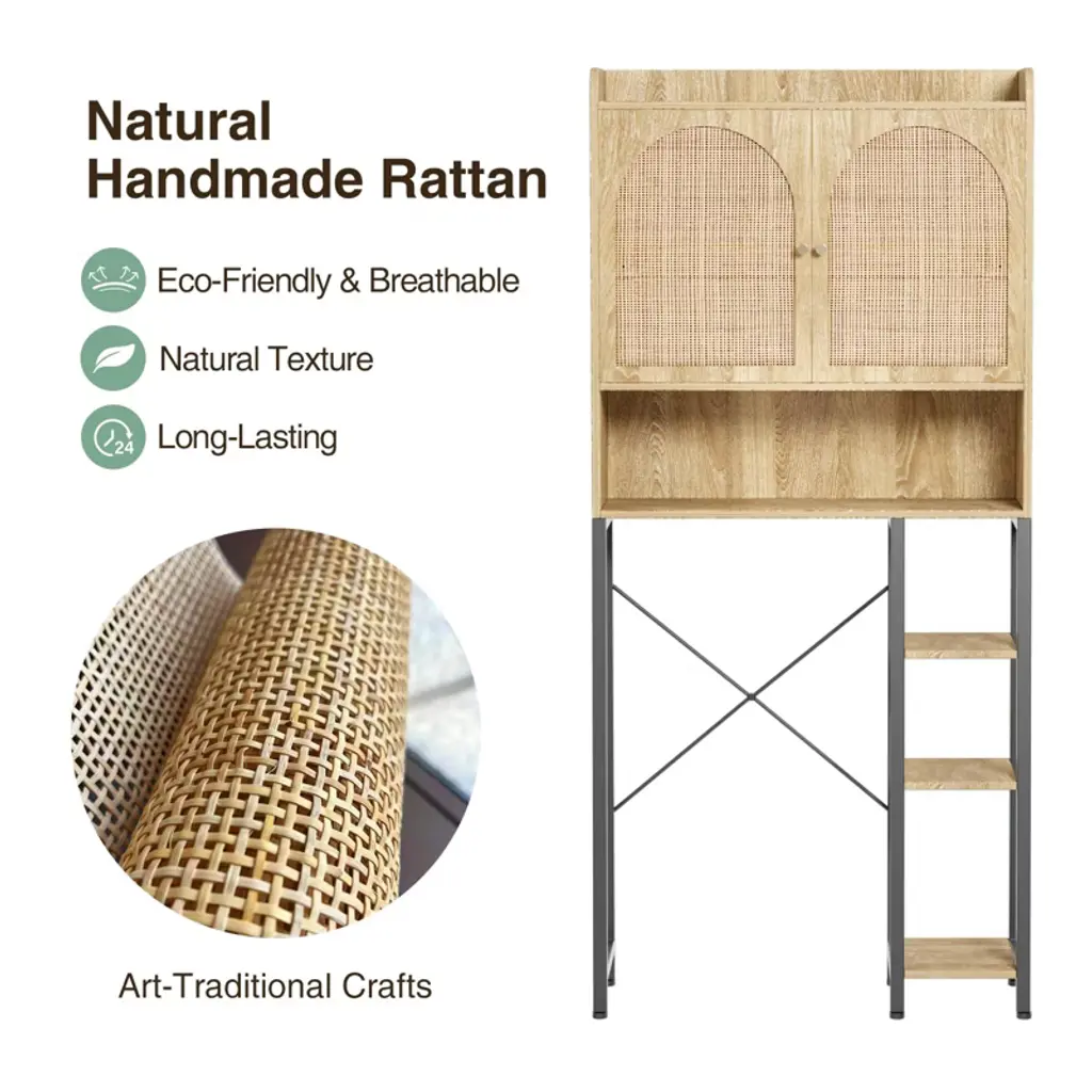 Rattan Over The Toilet Storage Cabinet With Adjustable Shelf And Wood Rack, Tall Storage Shelves, Natural
