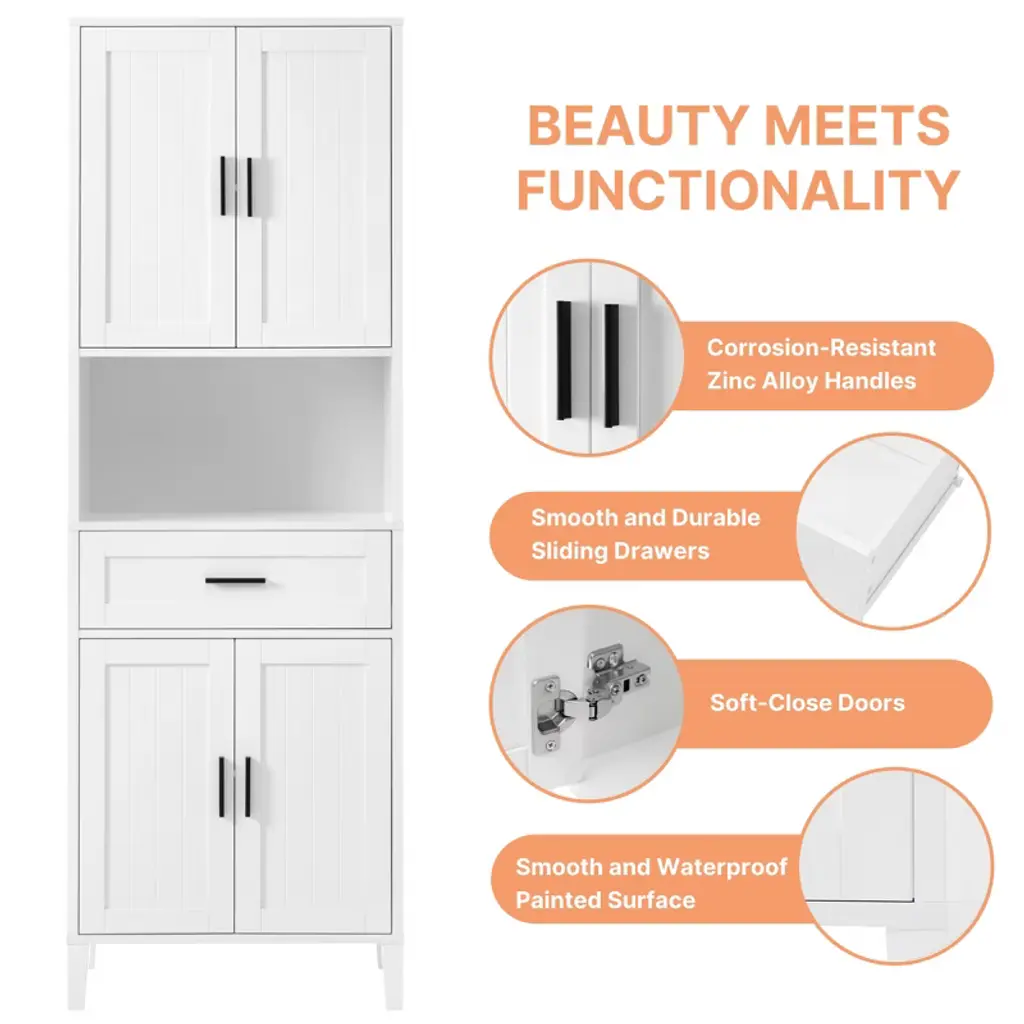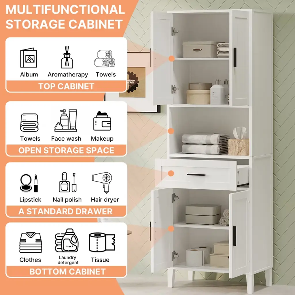With modern and elegant design and practical storage functions at its core, this versatile tall cabinet is easily adapted to the bathroom, living room or bedroom, adding storage convenience and visual style to any space. Its clean minimalist silhouette is matched with solid wood legs and high-quality MDF boards, which are both durable and load-bearing. The flexible internal layout includes 1 practical drawer, open middle shelf and adjustable cabinet space to meet the needs of classified storage from daily necessities to decorations. Whether it is to improve storage efficiency or create a modern aesthetic atmosphere, this tall cabinet is an ideal choice.