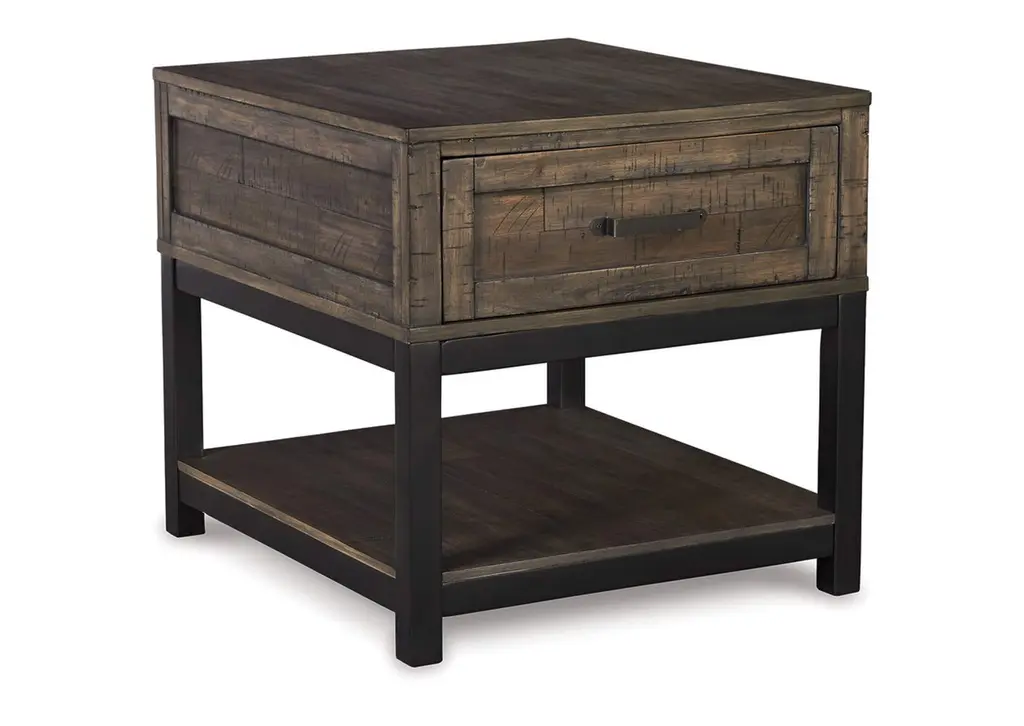 Crafted from Pine solids and Pewter hardware accents, this rustic end table adds a unique style accent to your home living room space. Showcasing four tall legs that culminate in a bottom shelf, the piece features an accommodating drawer and a beautiful top panel design. Completed with a weathered charcoal finish, this end table is perfect for magazines, drinks or other small items.