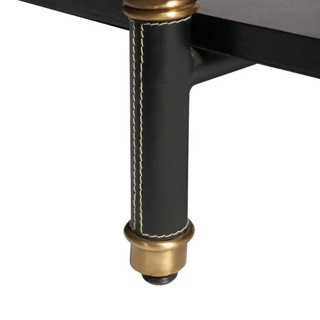 The Reneau Collection is a captivating reinterpretation of modern French furniture. Featuring three tiers of elegant shelving, this piece is a testament to refined craftsmanship. The corner posts are fully wrapped in leather with contrast stitching and accented by rings of antique brass to create a captivating visual appeal that mimics bamboo. The sleek lacquered shelves feature gracefully rounded edges and offer both style and durability. With its versatile charm, the Reneau Low Shelf effortlessly enhances any room, from offices to dining rooms to living spaces.