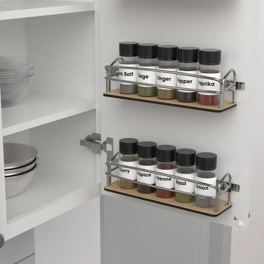 Store your spices right at your fingertips with the 54SR Series Steel Door or Wall Mount Organizer. By adding this kitchen accessory to your cabinets, all of your spices will stay neatly organized, allowing you to view your favorite spice to add to your favorite dish. Designed to hold up to 5 standard jars of spices, these can be used alone or stacked for more storage space. Each standard spice bottle measures 2.25''. No more digging through clutter cabinets; this organizer keeps everything neatly arranged and easily accessible. The wire holds the spice in place and provides a clear, easy view to see whether you're grabbing the salt or pepper. Whether dealing with limited space or ample room, this organizer effortlessly adapts to your needs. With a minimum opening requirement of 14.75'', it's the ideal fit for most kitchen cabinets, offering maximum storage without overcrowding. Built to withstand daily use, its heavy gauge powder-coated metal wire construction ensures lasting use. Installation is made easy and can be completed within minutes with just 2 screws that provide increased durability for easy-to-reach storage right on your kitchen cabinet door. This door bracket allows for up to 5'' of adjustability for maximum convenience, accommodating your kitchen storage space. Transform chaos into order with the Steel Door/Wall Mount Spice Rack Pantry Shelf Organizer from Rev-A-Shelf. Steel door storage organizer to streamline your home storage space by making everyday essentials more easily accessible and reducing clutter Full Product Dimensions: 13.25"W x 4"D x 3.72"H Minimum cabinet opening width for a face frame cabinet is 15"; Requires a minimum opening of 14-3/4" Features heavy gauge powder-coated metal wire construction designed for increased durability Unit is cabinet door mounted for effortless installation Product is designed to hold standard spice bottles measuring 2.25" Use as a spice rack or stack for easy access; Wires provide easy viewing of stored items Included door brackets allow for up to 5" of adjustability and are required for operation Warranty: Limited lifetime warranty Product Type: Door Mount Organizers Color: Silver Weight: 4 lb. Material: Steel Quantity: 2