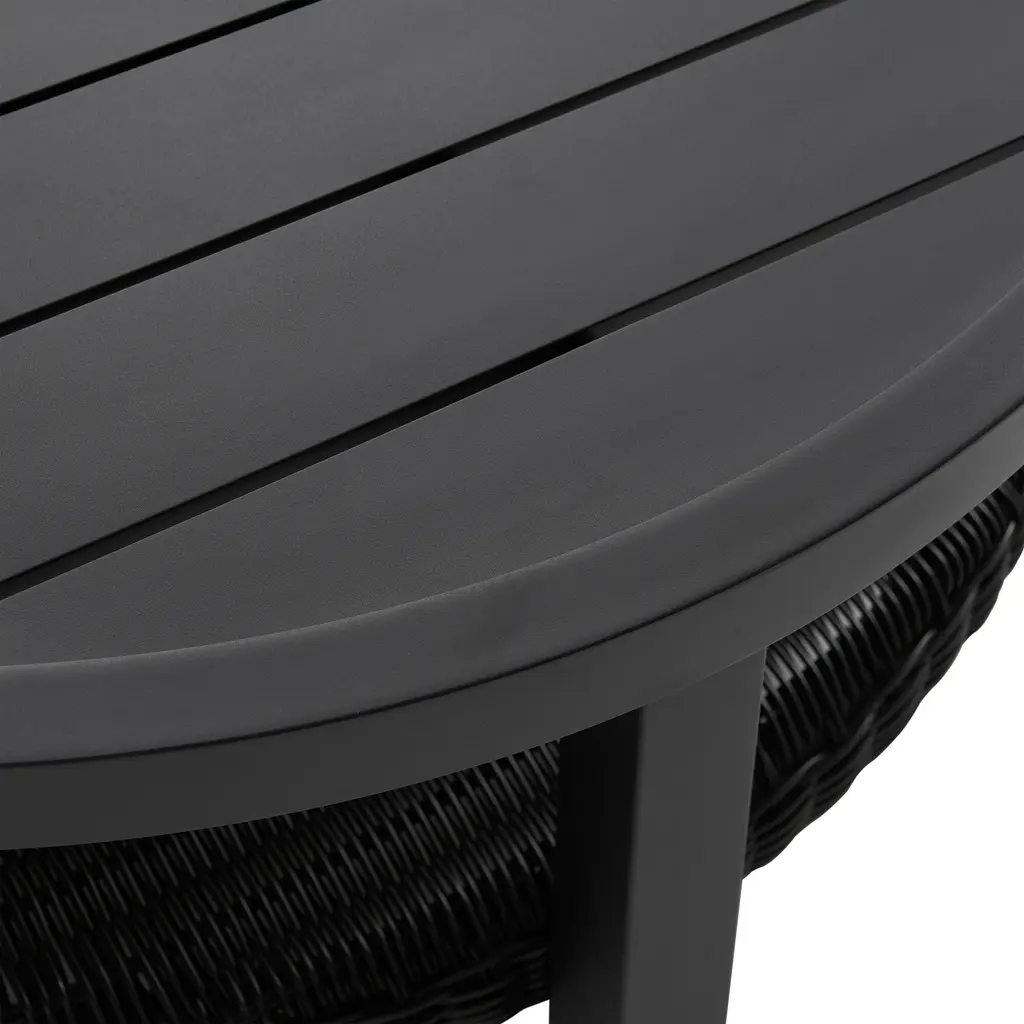 Made of lightweight black aluminum with an all-weather resin-wicker shelf, the Rhodes patio conversation table is a durable centerpiece for alfresco entertaining. Sleek and modern with a large round surface and substantial woven shelf, this 2-tier coffee table offers ample storage space for drinks, snacks and decor. Strong, sturdy and easy to reposition, this mixed-material chat table looks just as good indoors as it does on the deck or porch.