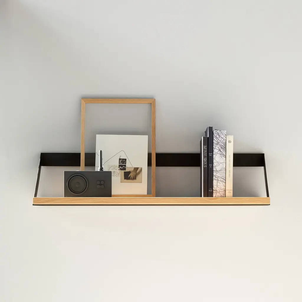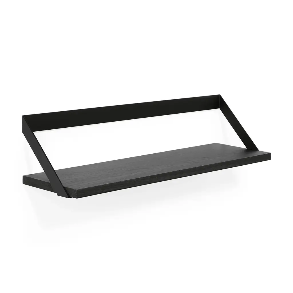Less is More. The Oak Ribbon Shelf by Ethnicraft is a modestly designed to allow your personal items to be the focal point of your display. The striking oak hangs from a black or white metal bracket. This Scandinavian style integrates easily into many decors. This shelf can be hung singularly or in multiples dependent upon the look you want to create. Why We Love It: Features