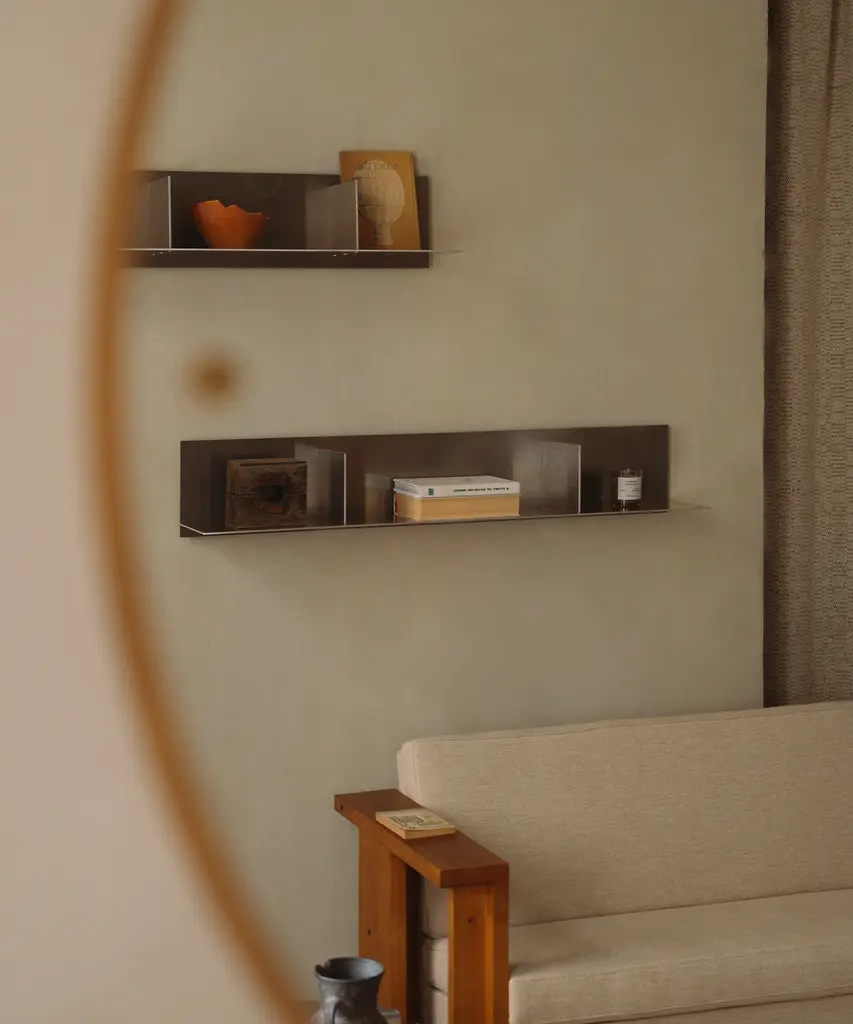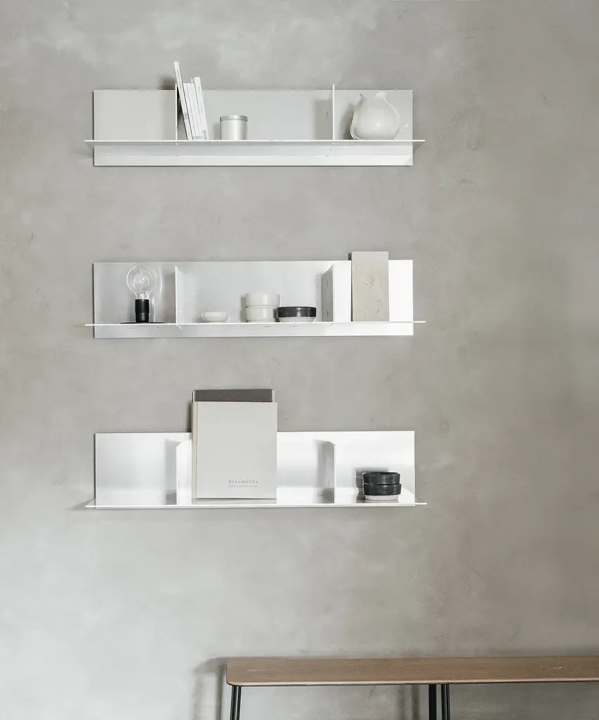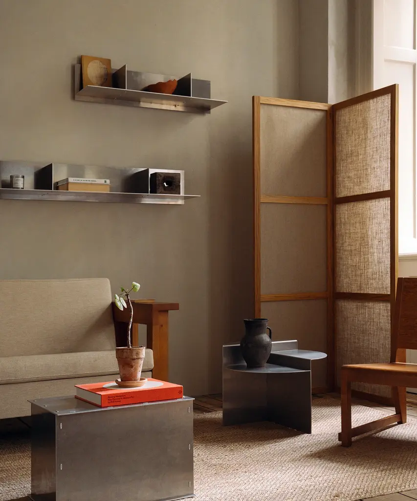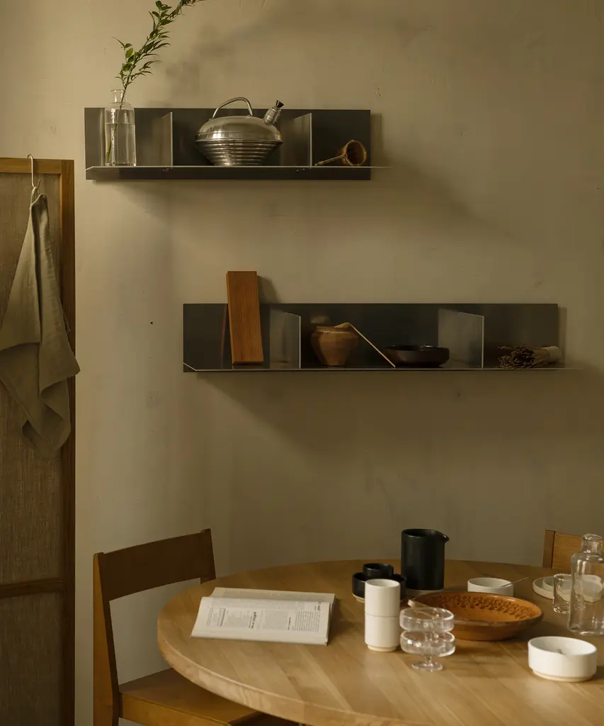 The Rivet Shelf explores basic storing facets within one shape while functioning as a storage and display platform. Based on a riveting technique suitable for making perpendicular joints between separate, laser-cut raw aluminum sheets, the shelf is put together by hand using a hammer in a cold-forming assembly process developed by designer Jonas Trampedach in 2011. Designed by Jonas Trampedach for Frama - an interior and product design studio based in Copenhagen. The studio is a dynamic testing ground for new designs and projects, embodying their classical, yet boundary-pushing approach.