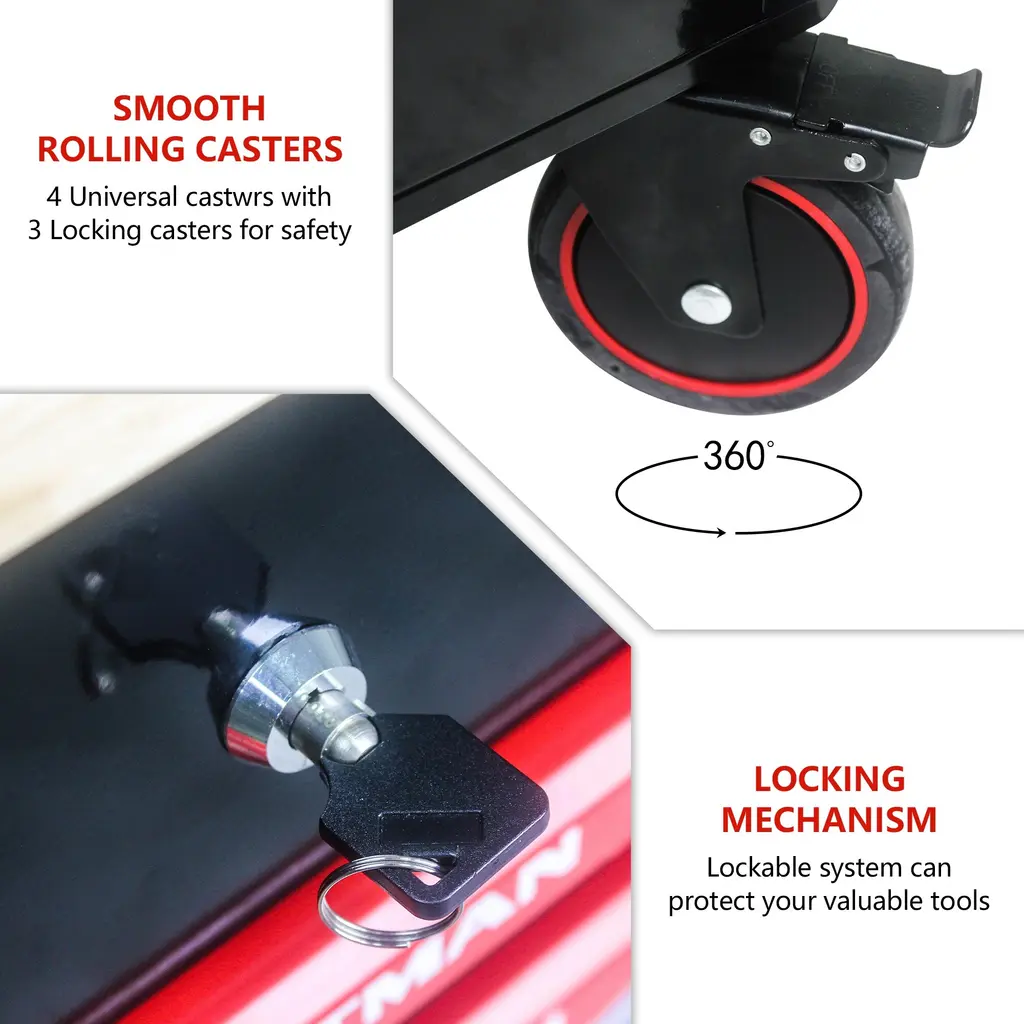 Utility Rolling Tool Cart: offering the perfect balance between the storage capacity of a cabinet and the portability of a toolbox, suitable for workshop, garage, warehouse and more.3 Drawers: This tool chest have 3 drawers that provide a convenient place where you can organize tools for ease of access.With 4 Wheels: The tool cabinet is designed with 4 wheels, which makes it easier for you to move it around.Large Storage Space: The rolling tool chest is designed with 3 drawers for storing tools, small equipment or other objects.Wide Application: With easy mobility and fair storage space, the tool storage chest can be utilized in various occasions like garage, warehouse, workshops, repair shops, etc.Description:Name: Rolling Tool CartMain Color: BlackMain Material: MetalPacking list:Rolling Tool Cart x 1+accessory bag x 1Note:Different displays may cause the color of the item in the picture a little different from the real thing. Manual measuring,please allow 1~3mm error,thank you.