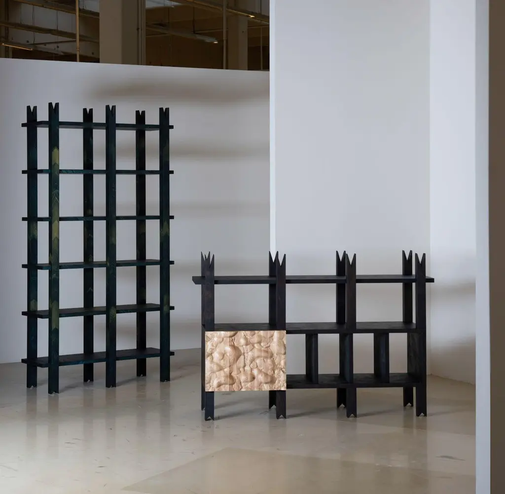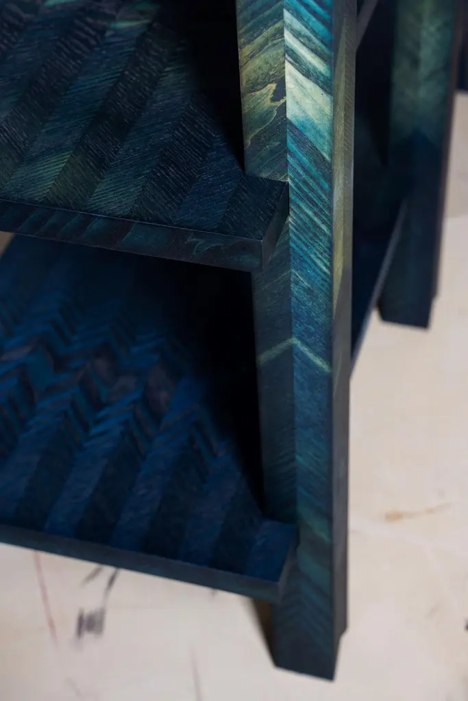 Roots Collection, aptly named for its detailed columns, pays homage to ancestral traditions, symbolizing the continuation initiated by both creators' grandfathers. This collection features six distinct root types, each unique character, alongside a truly exceptional variant. Every piece is a testament to meticulous craftsmanship, capturing the essence of delicate details that mirror the organic shapes found in nature.The nature-inspired mantle of the shelf unit, which is made of ash veneer arranged in a tree shape, provides a unique finish through a combination of several layers of paint and chemical reactions between them, resulting in a tropical plant leaf-like appearance.Continuing the artistic journey, the wooden veneer transforms pigmented dye application, resulting in mysterious and captivating patterns. The graceful integration of these elements yields a harmonious composition that not only serves as functional furniture but also stands as a work of art, blending tradition, history, and the beauty of the natural world.