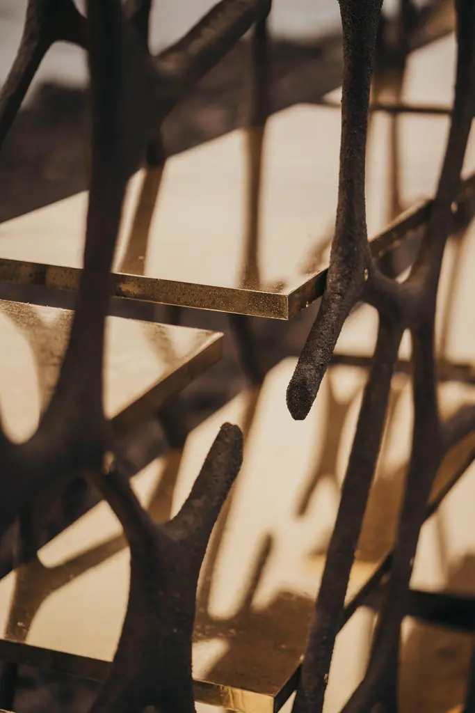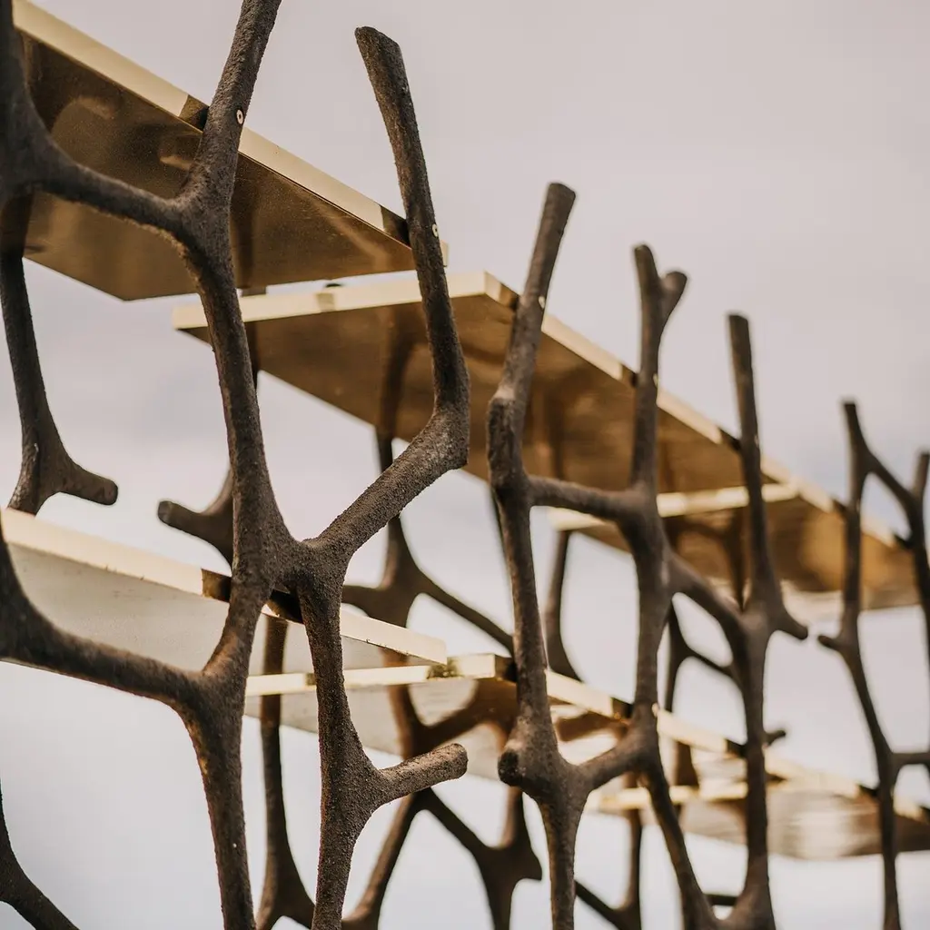 Designed by Francesco Maria MessinaThe collection is characterized by the use of two materials and two textures that are brought together to create a dialogue, mirroring the relationship between the ocean and the beaches that surround the island. In this design, we have the silver and gold mirrored-surfaces, which symbolize the ocean water and recreate the dialogue between the island shores and the open ocean.Sold as a singular element. This piece works well on its own, but also has an interlocking function that can be used to form an “infinite” pattern with 3 total elements. Please specify whether you'd like the singular element, two elements, or three to build the full interlocking shelf. This piece can also serve as a space divider. Bookshelf made of Gold Mirrored Acrylic & Aluminum lining with Lava Sand finish.Also available in silverLimited edition of 9 piecesCustomizable on request.