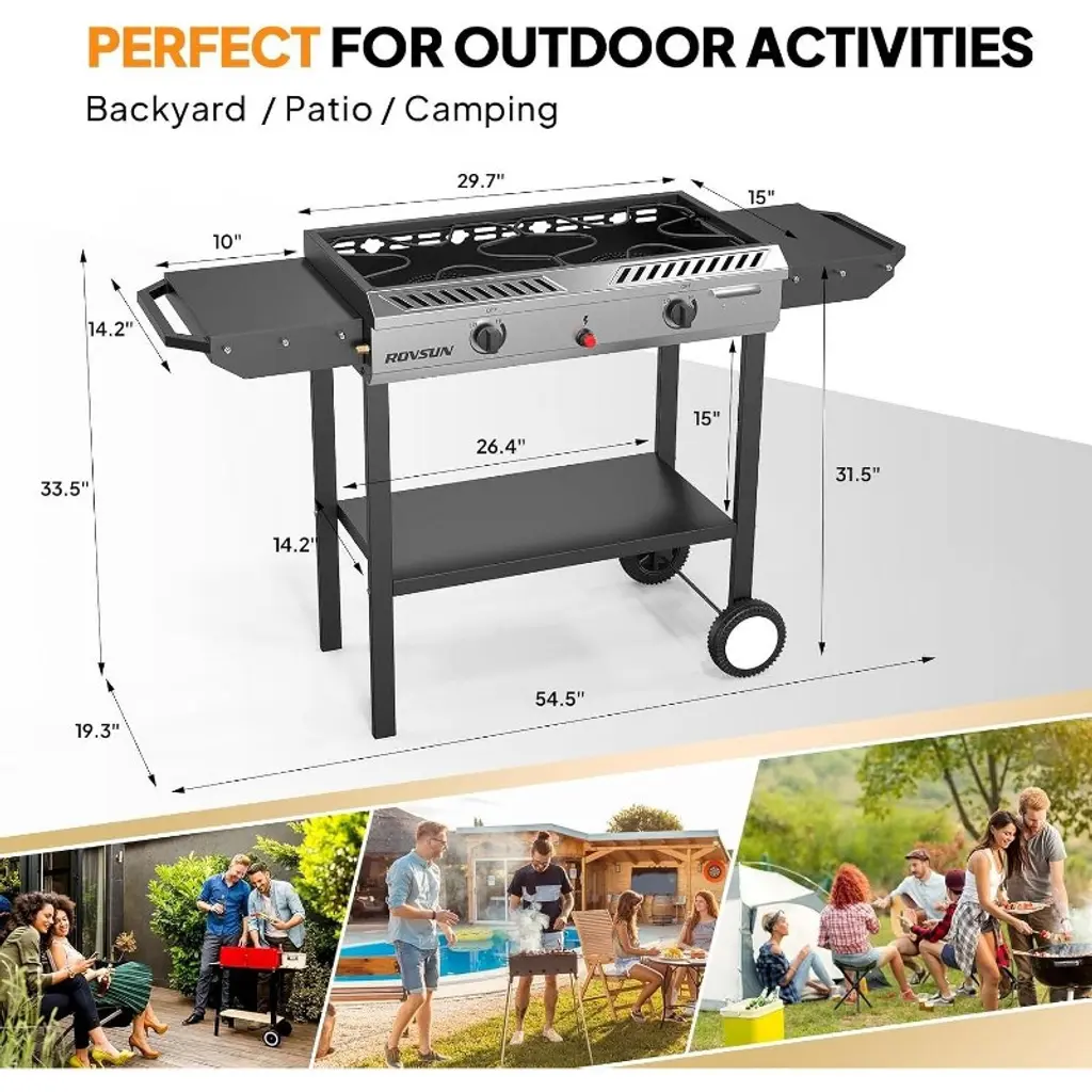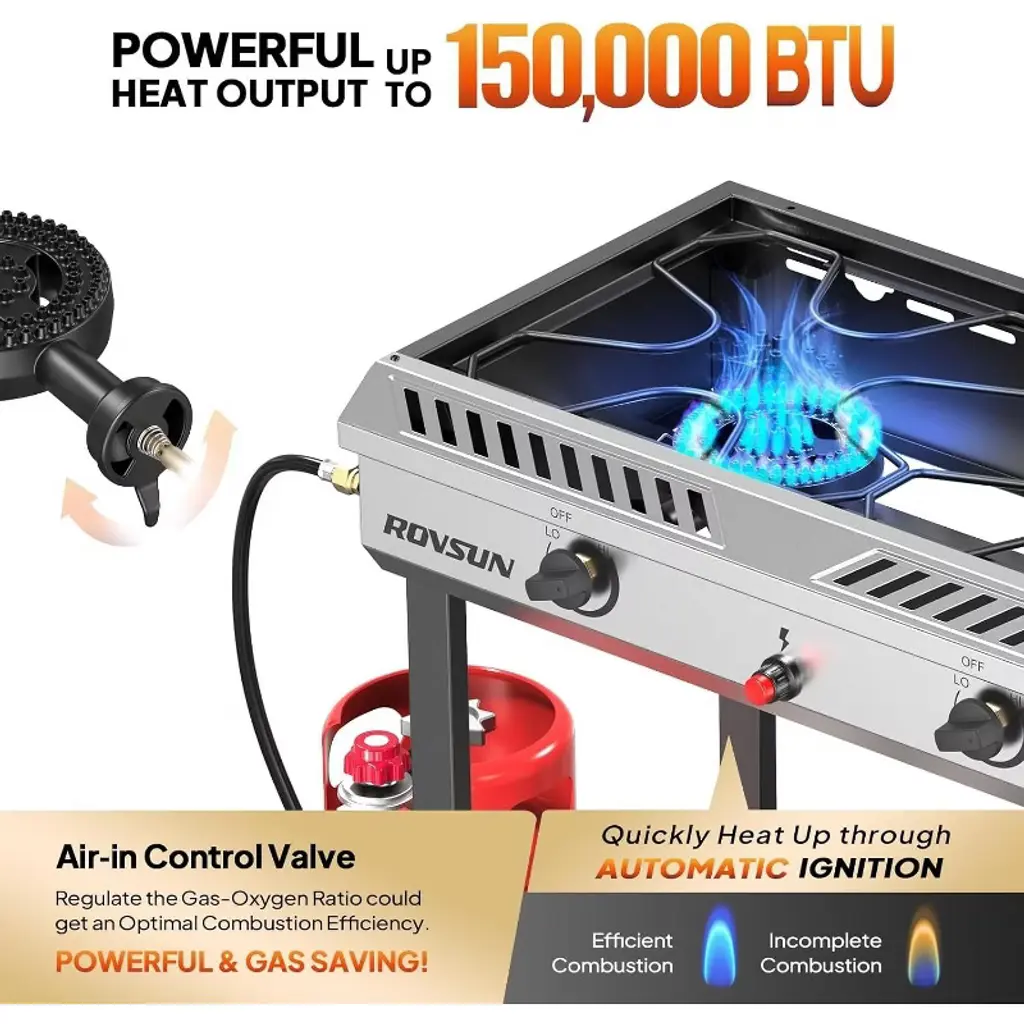 ROVSUN upgraded Propane Stove with auto ignition, a perfect companion for all your culinary adventures. Equipped with 2 independent cast iron burners, it delivers a powerful combined heat of up to 150,000 BTUs. The flame is adjustable, catering to diverse cooking needs. Crafted from sturdy metal material, it promises durability and lasting performance. It is equipped with bottom shelf for added convenience and storage. With built-in wheels, our freestanding stove can be easily moved in the yard or outdoors for easy mobility. Whether you're planning outdoor cooking, grilling, camping, or picnicking, our stove is your go-to choice. Feature: 2 burner stove for effective cooking 150,000 BTU power heats quickly and evenly Ignition design for simple lightening up Dual control knobs for easy temperature control Sturdy metal frame for long-term use Easy to assemble with a detailed instruction provided Suitable for outdoor, patio, backyard party camping, picnic, BBQ, , etc Specification Material: Cast Iron + Iron BTU of Cooking Burner : 2 x 75,000 Fuel Type: Propane Fuel: standard 20 lb propane tank (not included) Weight: 37 lbs /38 lbs / 67 lbs Ignition Type: Auto Overall Dimensions(stove): 29.7'' x 16.5'' x 33.5'' (L x W x H) Overall Dimensions(stove with side shelf): 54.3'' x 16.5'' x 33.5'' (L x W x H) Overall Dimensions(stove & griddle): 54.3'' x 16.5'' x 38.4'' (L x W x H) ; Optional Griddle Grilling Surface: 29.5'' x14.4 ''(L x W) Package includes: 1 x Propane Stove 1 x Regulator 1 x Instruction 2 x Side Shelf (Optional) 1 x Griddle (Optional)