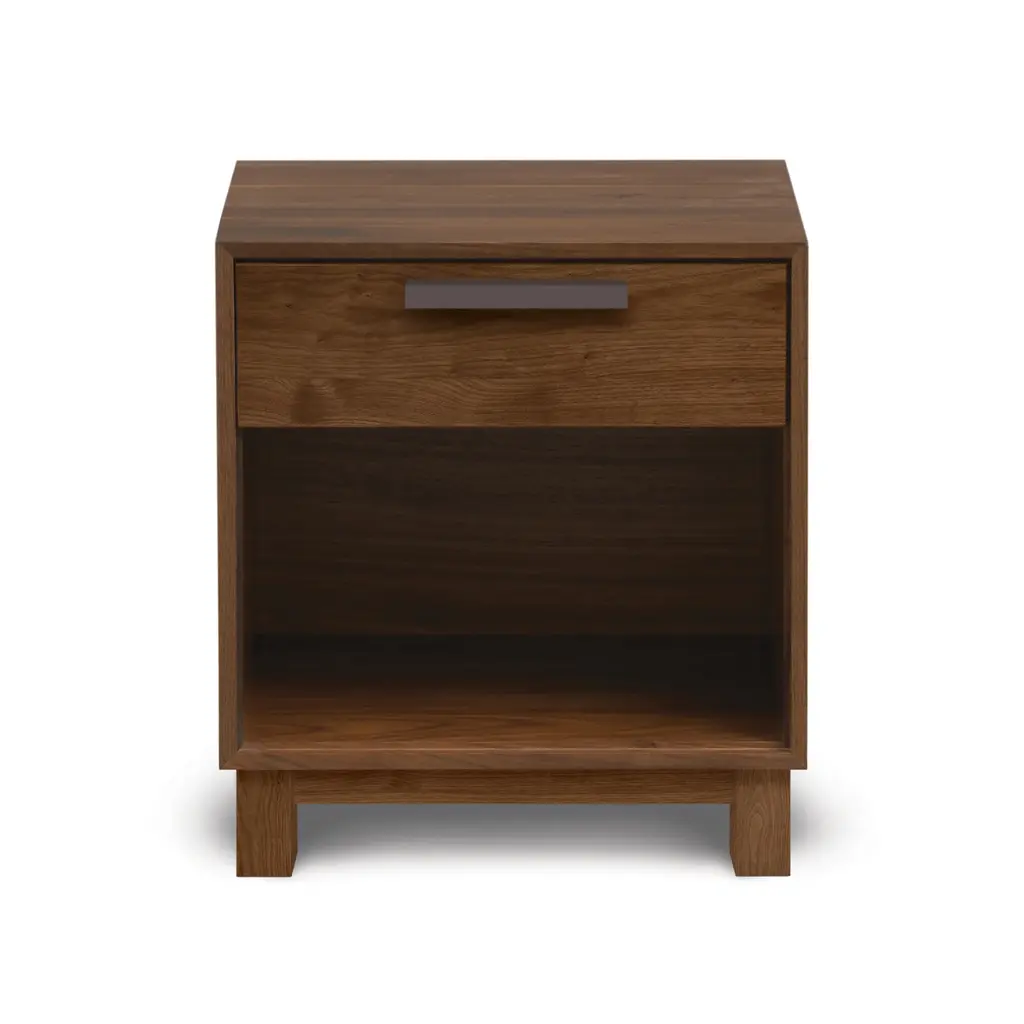 Modern sophistication for the modern bedroom. Our Savoy 1-Drawer Enclosed Shelf Nightstand by Copeland Furniture features sleek clean lines, a solid wood construction and effortless personality in every detail. From the crisp mitered corners to its grounded presence, marvel at the one-of-a-kind characteristics found in the natural hardwood construction. Instantly create a designer bedroom aesthetic with the addition of Savoy in your modern home. Base Price represents nightstand in natural walnutShown in natural walnutMatching furniture available in our Savoy Furniture Collection by Copeland