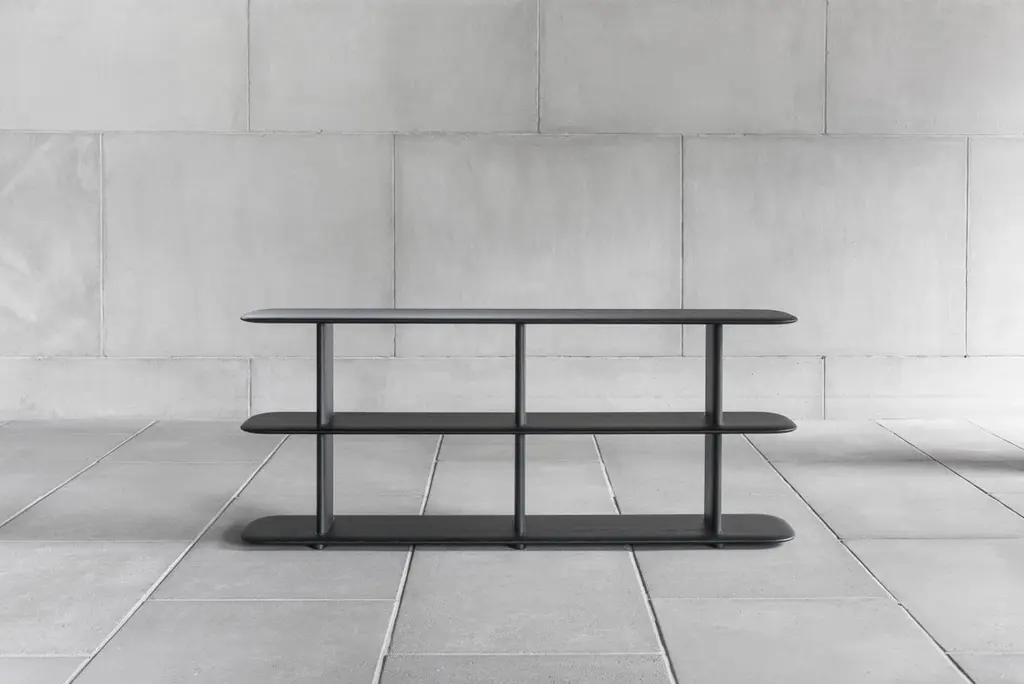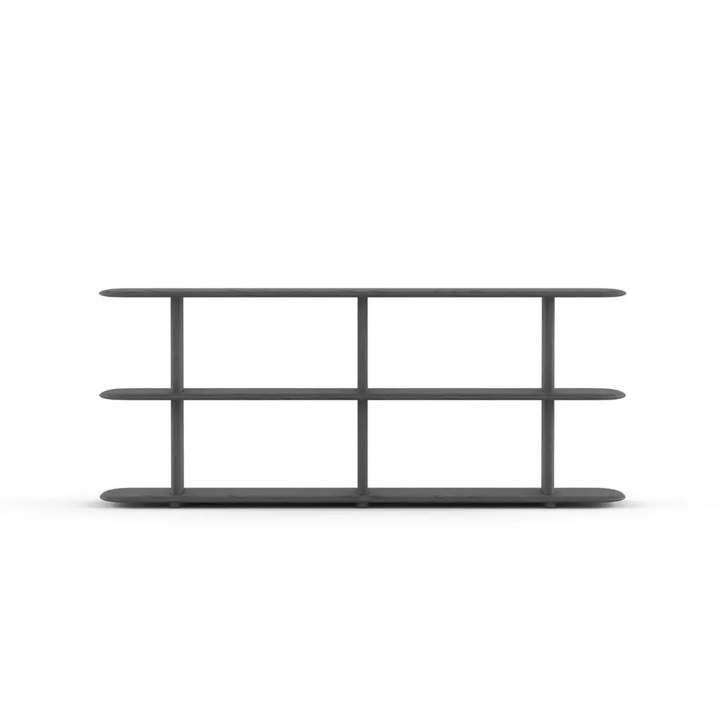 Shelf 'Poeme' designed by Timo Mikkonen & Antti Rouhunkoski for Poiat StudioDimensions : W. 181 x H. 74 x D. 37.5 cmModel shown :- Color black oak ----Graceful and poetic, yet robust, the Poeme Shelf comes in four different sizes, offering a flexible solution for diverse display and storage needs, including, for example, as a bookshelf, a TV stand or simply a frame for beautiful objects.Featuring a modular and minimal design, the Poeme Shelves are well-suited for both public and private spaces. The free-standing shelves are manufactured from solid oak in Finland and come in three colour variations — oak, dark oak, and black.The free-standing shelves are manufactured from solid oak in Finland.The founders Timo Mikkonen and Antti Rouhunkoski’s design philosophy builds on the following principle. To base all their creations on a profound interest in the details and a strong commitment to one’s vision that together create an enduring ambience with elegance and some modern quaintness.
