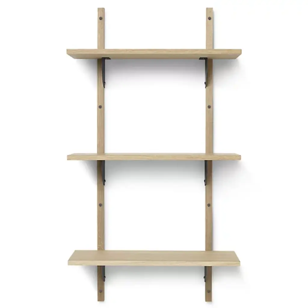 Sector calls to mind midcentury wall-hung shelves but Ferm Living's contemporary take on the storage concept adds a chic brass element. Defined by a sturdy but stylish simplicity, the shelves attach to a wall with the accompanying solid-wood uprights using visible screws. Available in 2 widths and either single- or triple-shelf units, choose from natural oak veneer or black-stained ash veneer shelves to pair with either polished or blackened brass brackets.