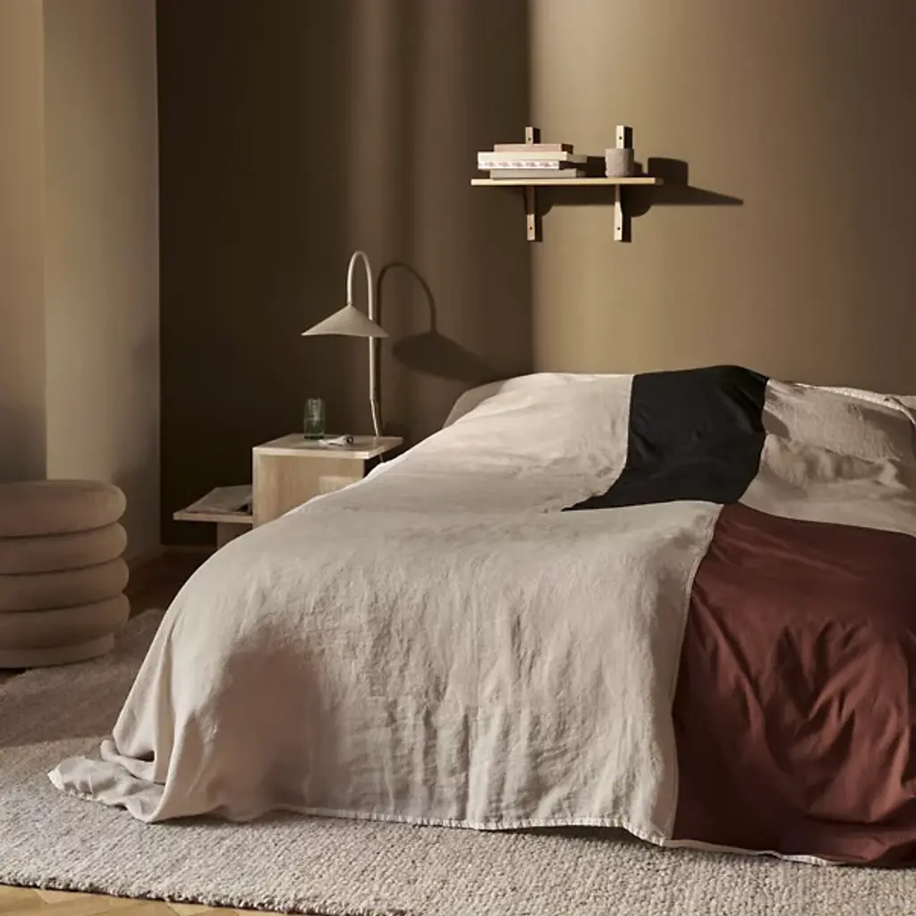 The Sector Single Wall Shelf from Ferm Living reinterprets midcentury modular shelving through exposed construction where solid ash uprights mount to the wall with visible screws. Brass brackets support the wood shelf from below, creating a three-part assembly where each component remains distinct. The design treats fasteners and structural logic as integral to the aesthetic rather than elements to conceal. The shelf can function independently as a single display surface or connect with other Sector elements to build more comprehensive wall-mounted storage systems.