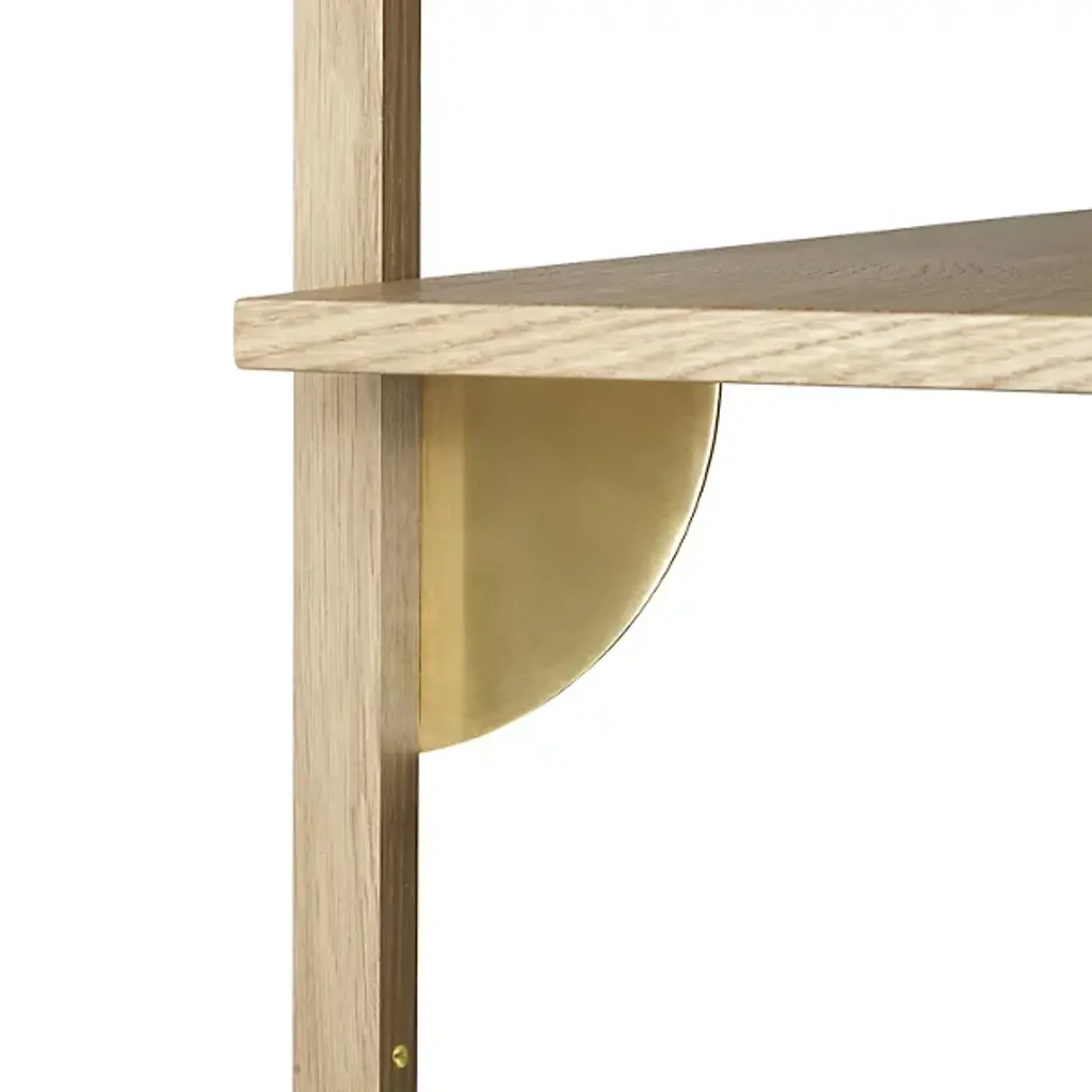 The Sector Single Wall Shelf from Ferm Living reinterprets midcentury modular shelving through exposed construction where solid ash uprights mount to the wall with visible screws. Brass brackets support the wood shelf from below, creating a three-part assembly where each component remains distinct. The design treats fasteners and structural logic as integral to the aesthetic rather than elements to conceal. The shelf can function independently as a single display surface or connect with other Sector elements to build more comprehensive wall-mounted storage systems.