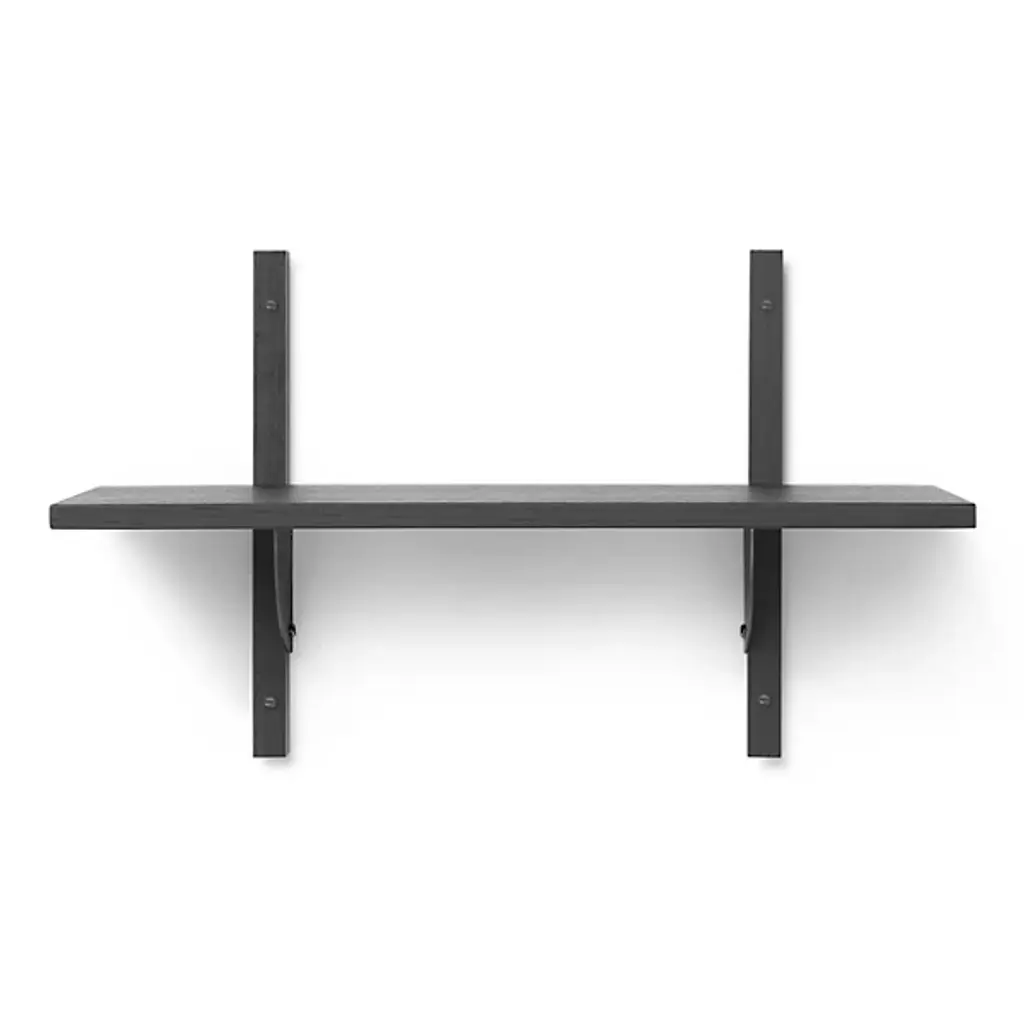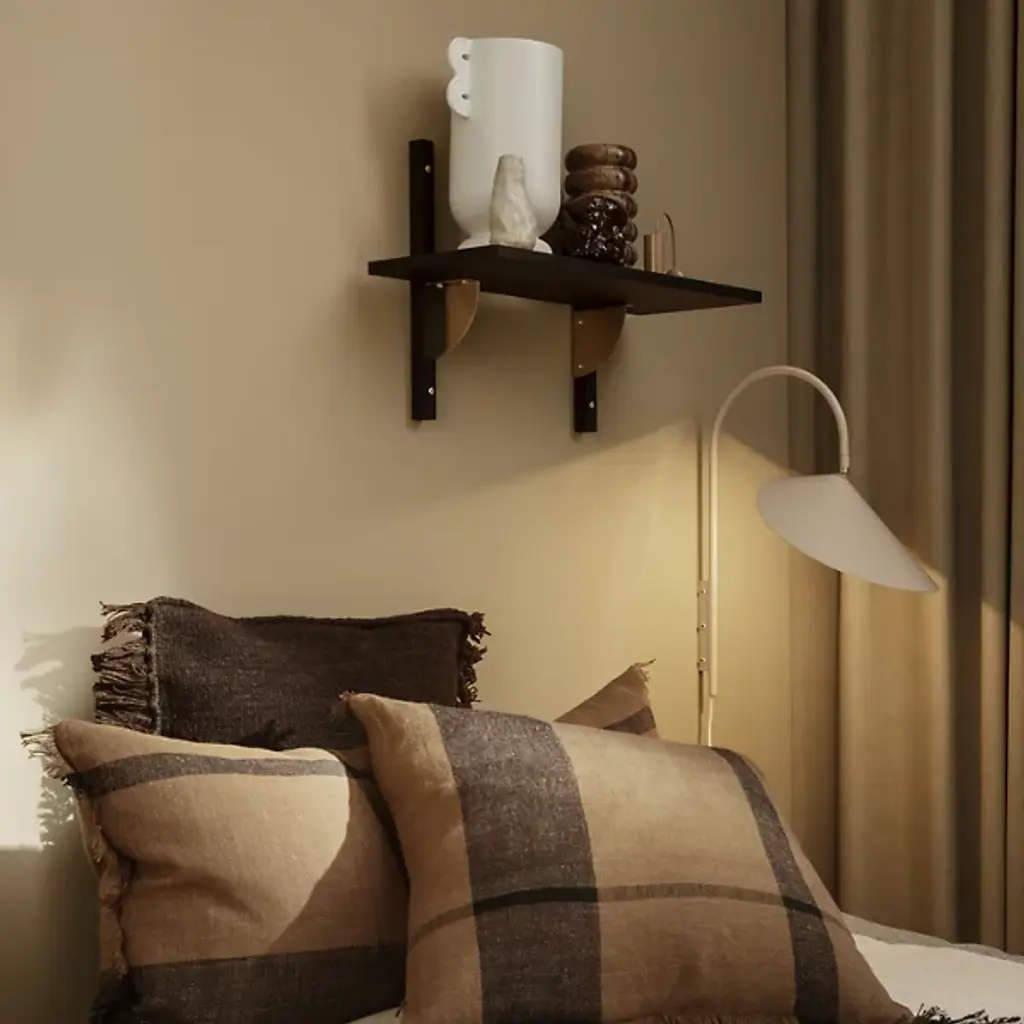 The Sector Single Wall Shelf from Ferm Living reinterprets midcentury modular shelving through exposed construction where solid ash uprights mount to the wall with visible screws. Brass brackets support the wood shelf from below, creating a three-part assembly where each component remains distinct. The design treats fasteners and structural logic as integral to the aesthetic rather than elements to conceal. The shelf can function independently as a single display surface or connect with other Sector elements to build more comprehensive wall-mounted storage systems.