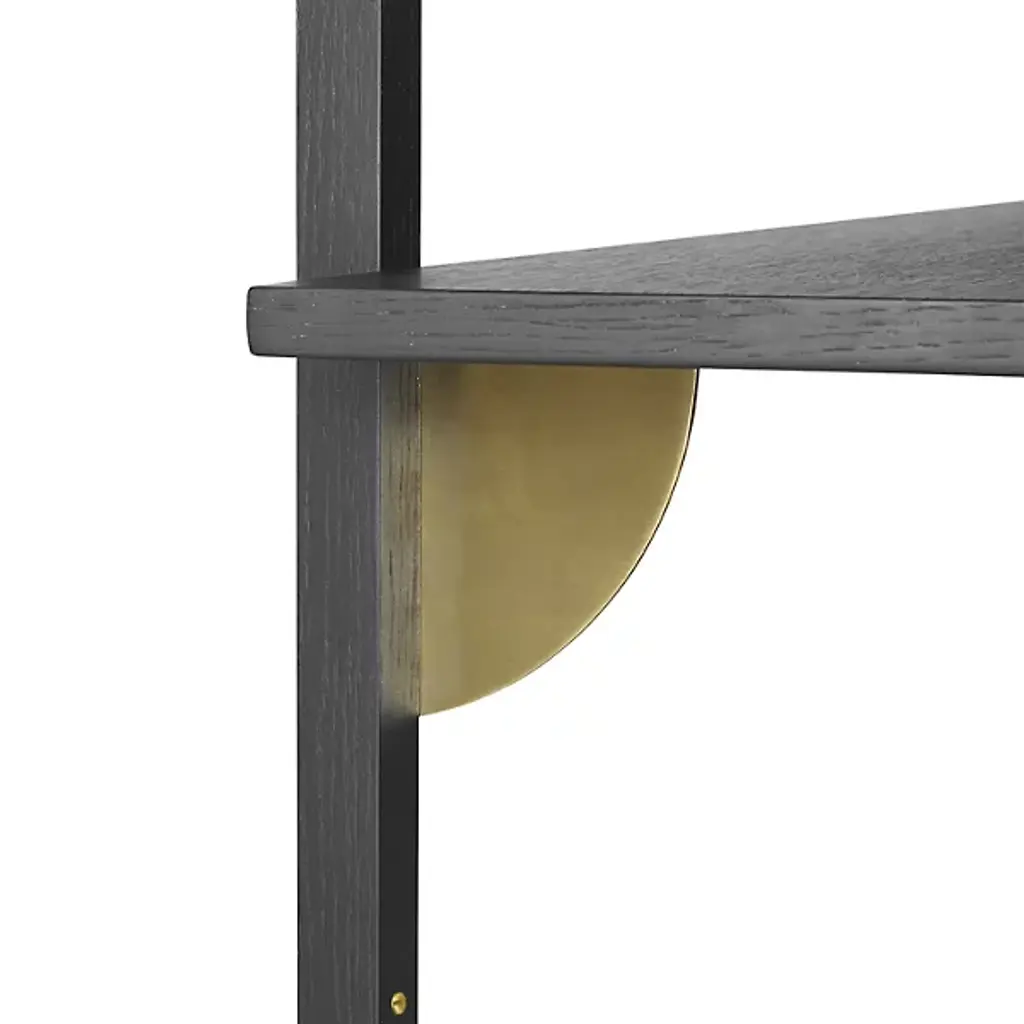 The Sector Single Wall Shelf from Ferm Living reinterprets midcentury modular shelving through exposed construction where solid ash uprights mount to the wall with visible screws. Brass brackets support the wood shelf from below, creating a three-part assembly where each component remains distinct. The design treats fasteners and structural logic as integral to the aesthetic rather than elements to conceal. The shelf can function independently as a single display surface or connect with other Sector elements to build more comprehensive wall-mounted storage systems.