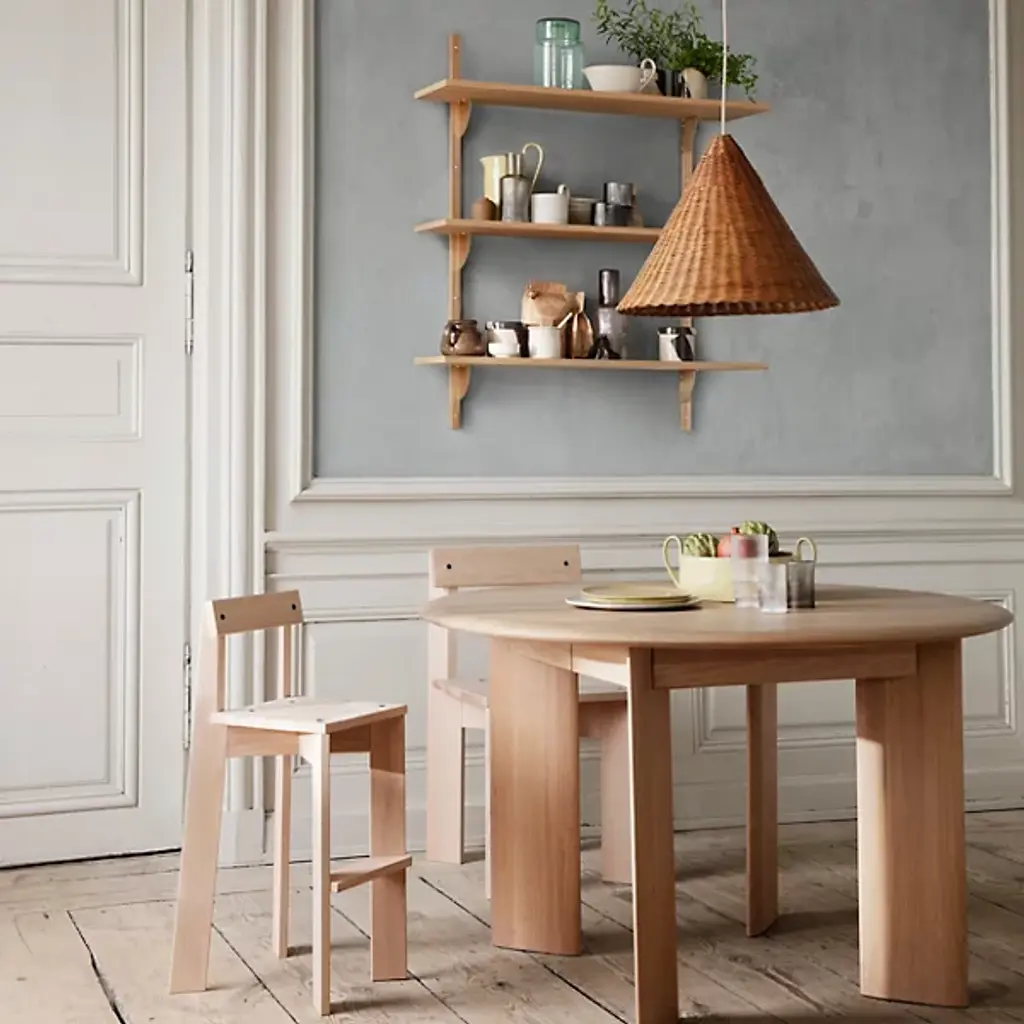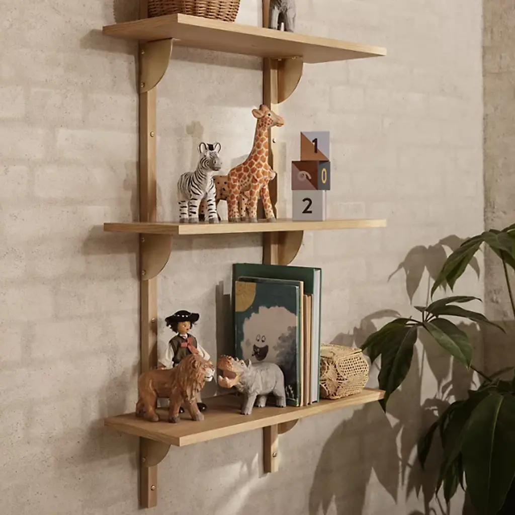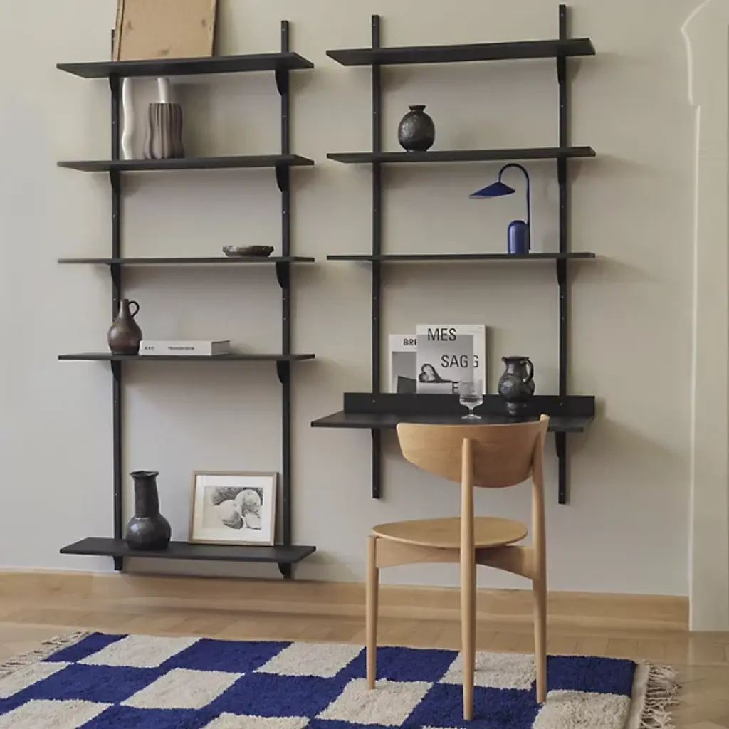 The Sector Triple Wall Shelf from Ferm Living stacks three horizontal wood shelves along continuous ash uprights that run the full height of the unit. Brass brackets support each level, creating regular intervals where metal meets wood in a repeated pattern down the wall. The vertical uprights are attached with exposed screws that become part of the design vocabulary, rather than hidden fasteners. This triple configuration multiplies storage capacity while maintaining the honest construction and material contrasts that define the Sector collection's midcentury-inspired aesthetic.
