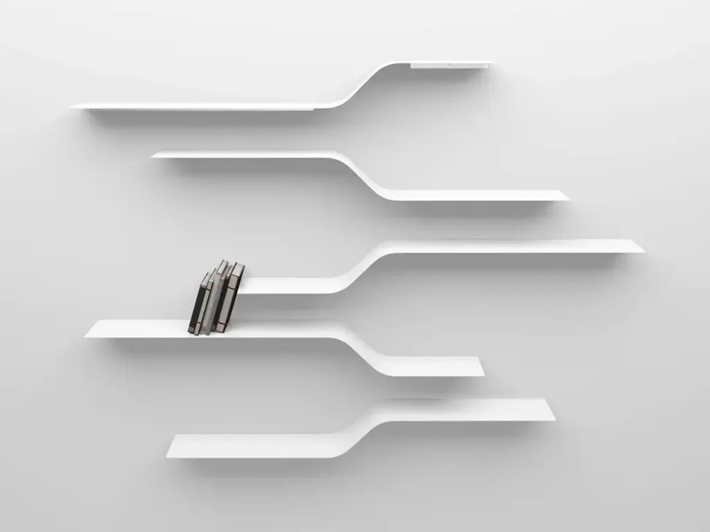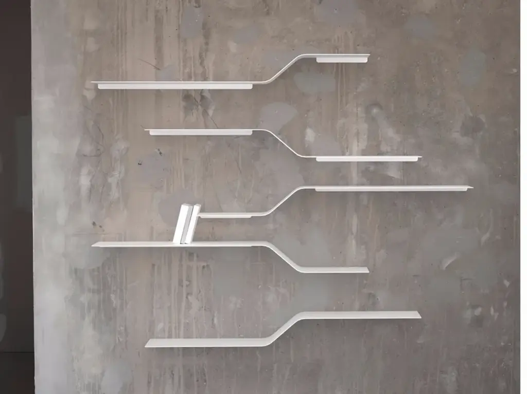 Powder-coated aluminium shelfs.Network modular shelf - Six different pieces allow a wide range of setups. The proportions are studied to let the shelves be arranged and put together. They are available in many colours and finishes. Its conception and shape gives a good resistance, it can easily hold books and objects. The provided fixings are very simple.• The six models can make infinites possibilities. Don’t hesitate to ask us different setups adapted to your wishes and your space, we make for free 3D simulations on your home photos.• Each shelf is 126cm long, 18cm wide, and 3kg. The thickness is 1,5mm.• Very strong, can easily support 30kg each. • Lacquered metal high resistance.• Each packaging contains plugs, screws, screw caps and a horizontal level tool. • Easy to fix.• The finishes are white, black, grey, red, polished stainless steel, brushed stainless steel, galvanised steel and waxed patina industrial steel. • All standard RAL colours are available on demand. • The dimensions are customizable. Don’t hesitate to contact us for any inquiry.