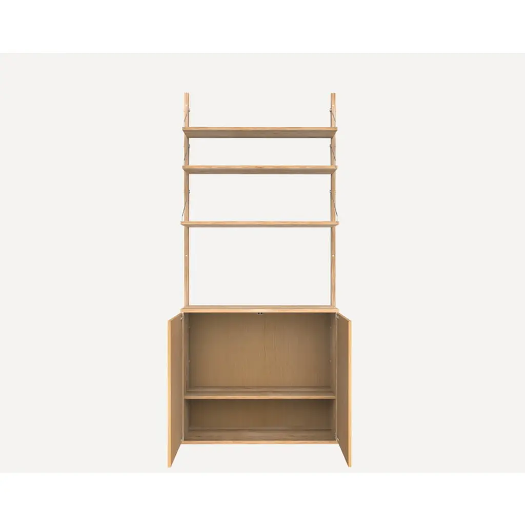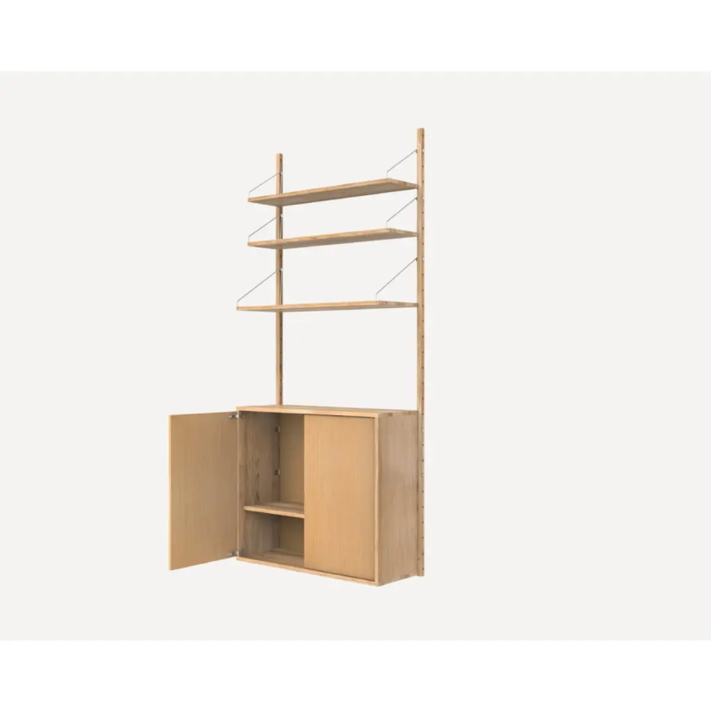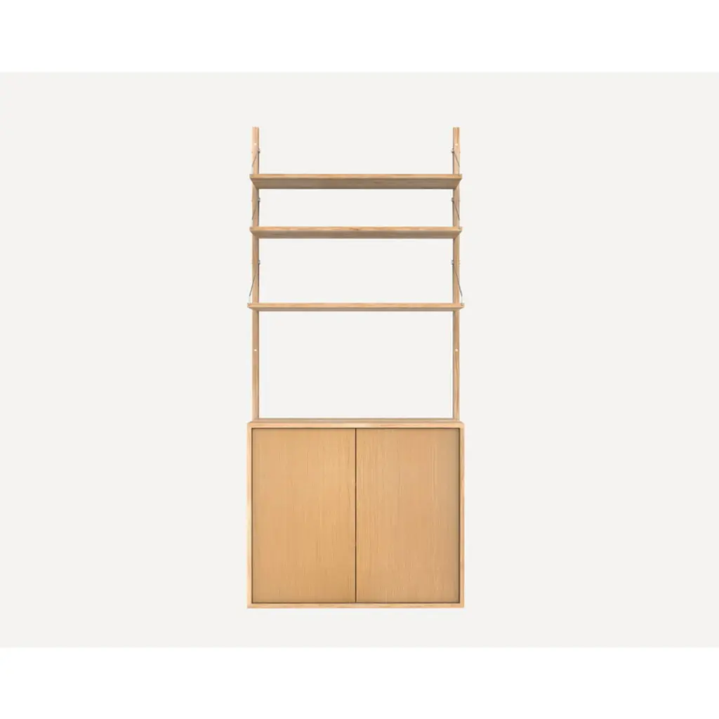 Frama's Shelf Library wall shelf consists of a solid oak cabinet and shelf that are fastened to the frame with decorative steel screws and brackets. The shelf and cabinet can be moved around and placed on the rails however you like, and the configuration can also be customized with add-ons. The cabinet has a push-opening system with one shelf hidden behind its doors. Designed by Kim Richardt, the timeless, versatile and adaptable shelf system is equally well suited for the kitchen, living room as well as the office. This shelf consists of: 2 rails (height 185,2 cm) 2 smaller shelves (20 x 80 cm) 1 deeper shelf (27 x 80 cm) 1 cabinet (27 x 68 x 80 cm) brackets for the shelves