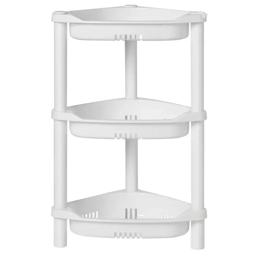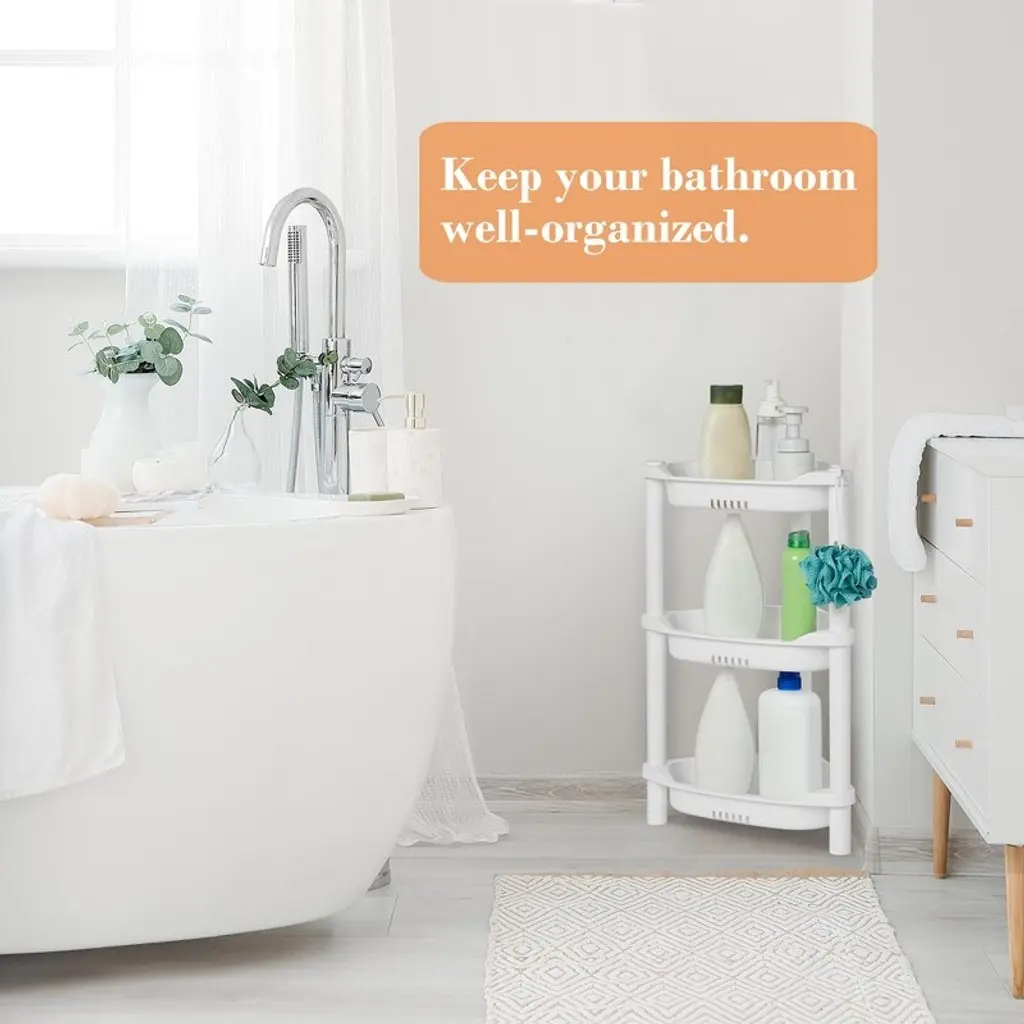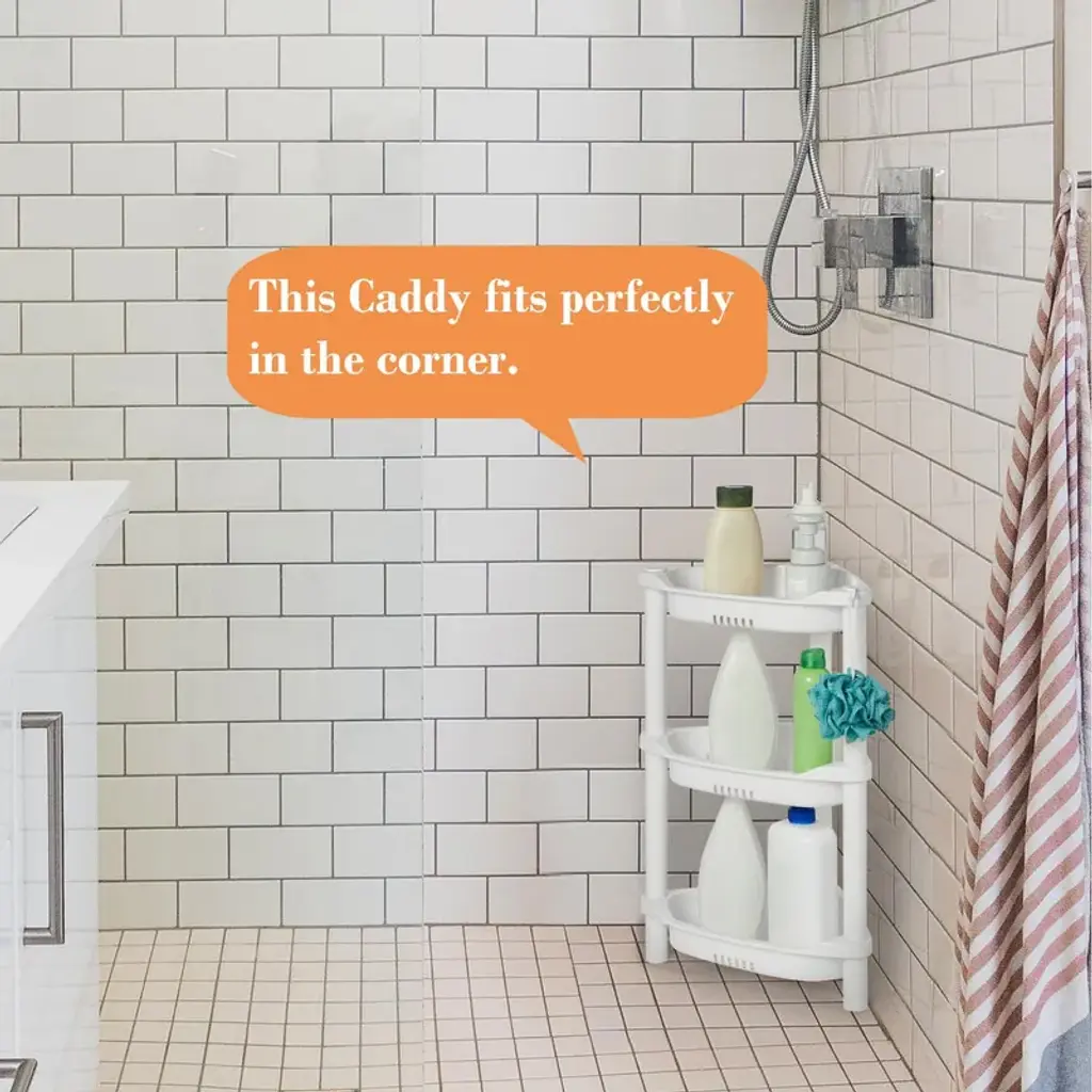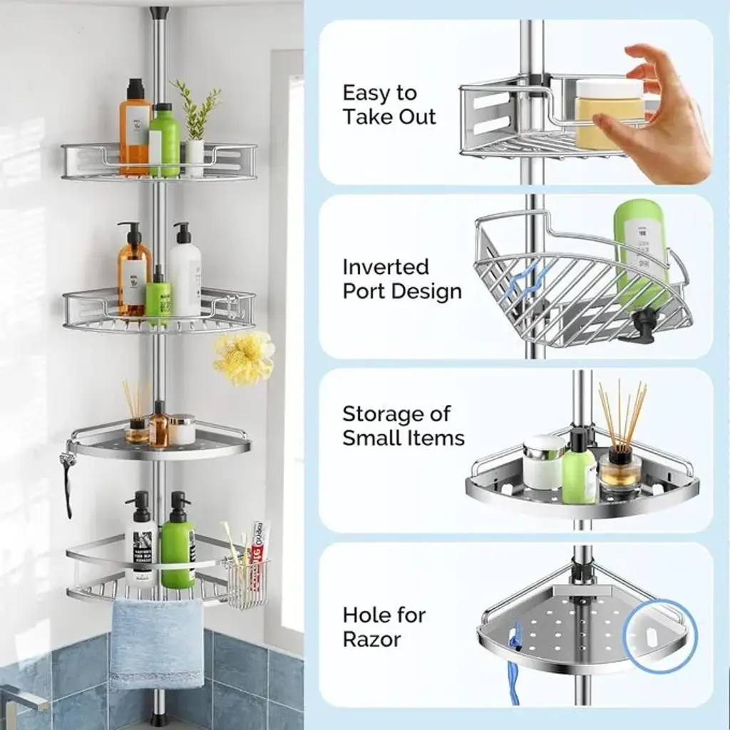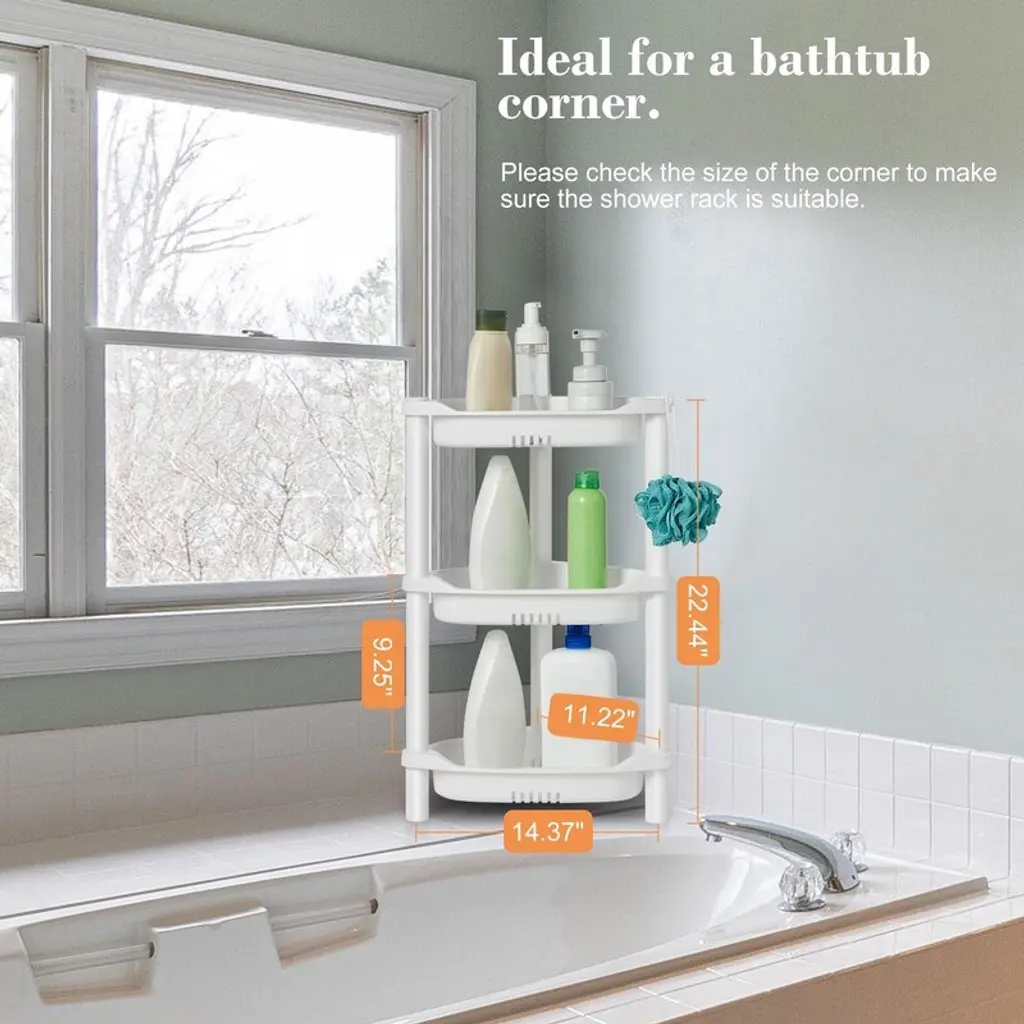 Solutions for Corners: The size of shower organizer fits well in the corner of the bath and shower area to store shower gel, shampoo, and shower cleaner. Please check dimensions before purchasing in case of not suitable for small bathtubsDrain Design: Rustproof plastic shower standing shelf will not make marks in a wet environment, extra holes on every shelves as well as the last tier locate up ground for drainage to keep water from building up on the traysEasy to Assemble: This shower tower can be put together in minutes without any tool. And it can be taken apart to be washed much as neededHeight Adjustable: You can adjust how many shelves you would like. And put two units together can create a unit with 7 shelvesHigh-quality Plastic: The corner shelf is made of very sturdy and great quality plastic, rustproof and waterproof, It has flat surfaces to prevent items from slipping from the shelf while the eaves also protect bottles from falling in bath or floor