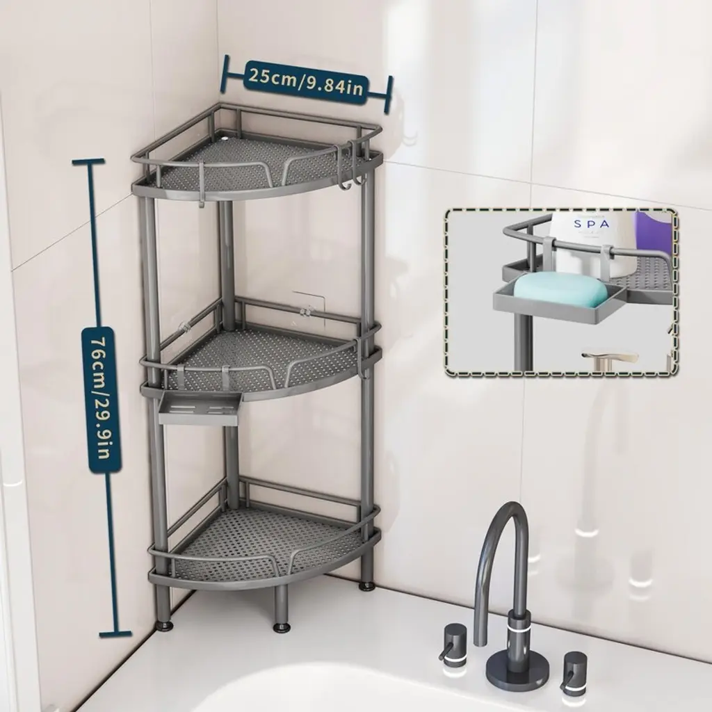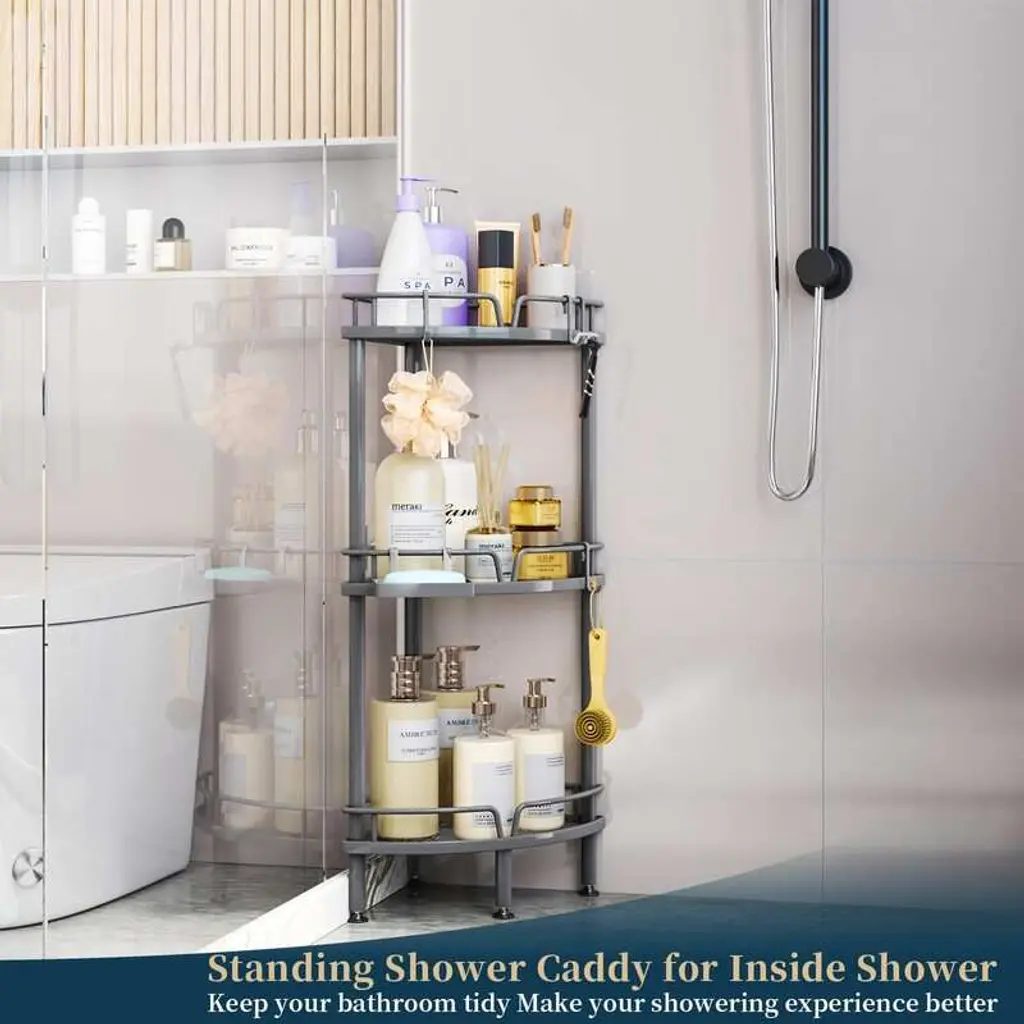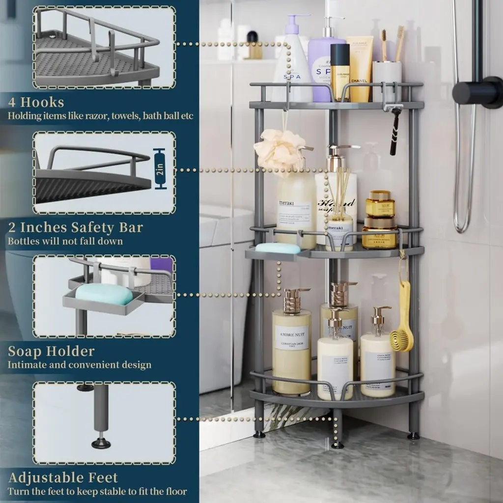 Shower Corner Shelf - 2 Tier Shower Organizer With Soap Rack, Floor Shelf, Tabletop Shelf With Adjustable Feet And Hooks - Grey - 3 Tier