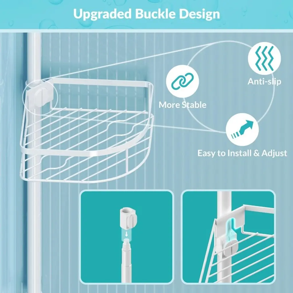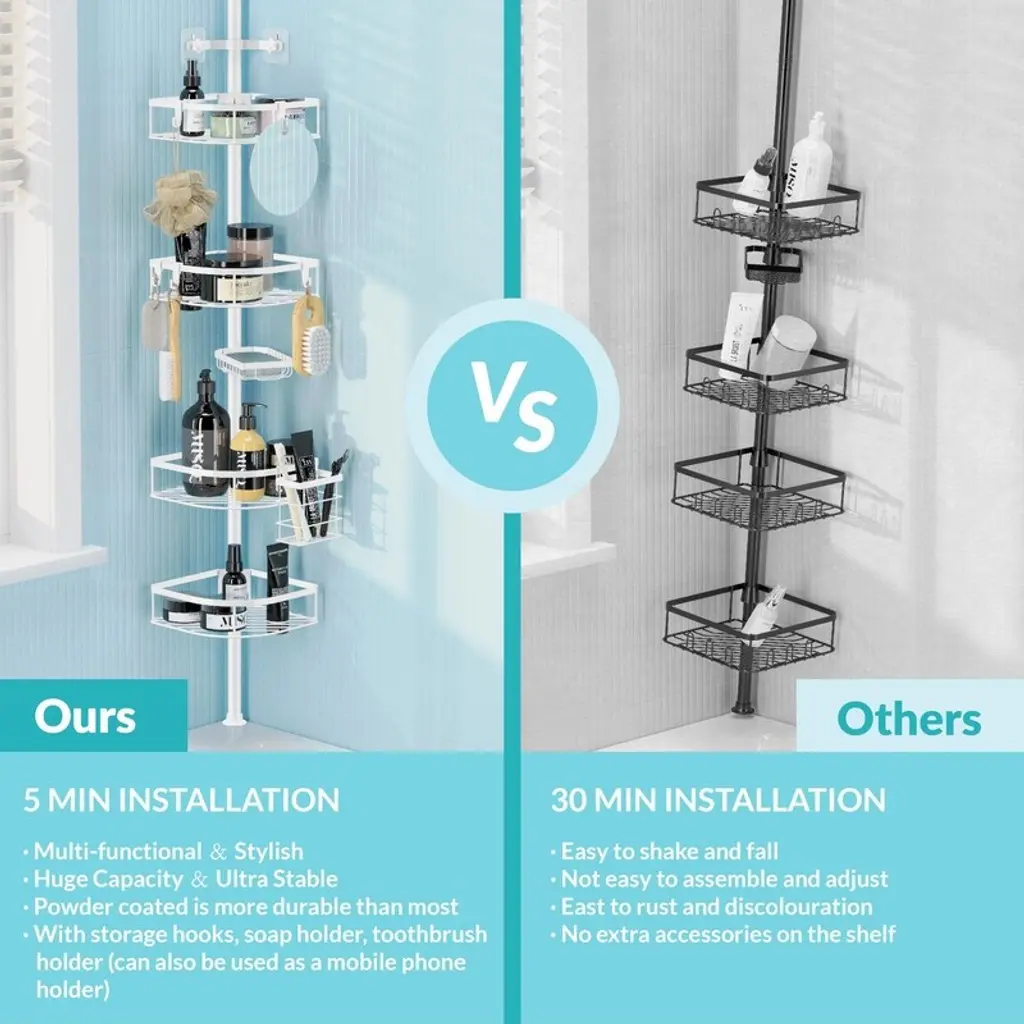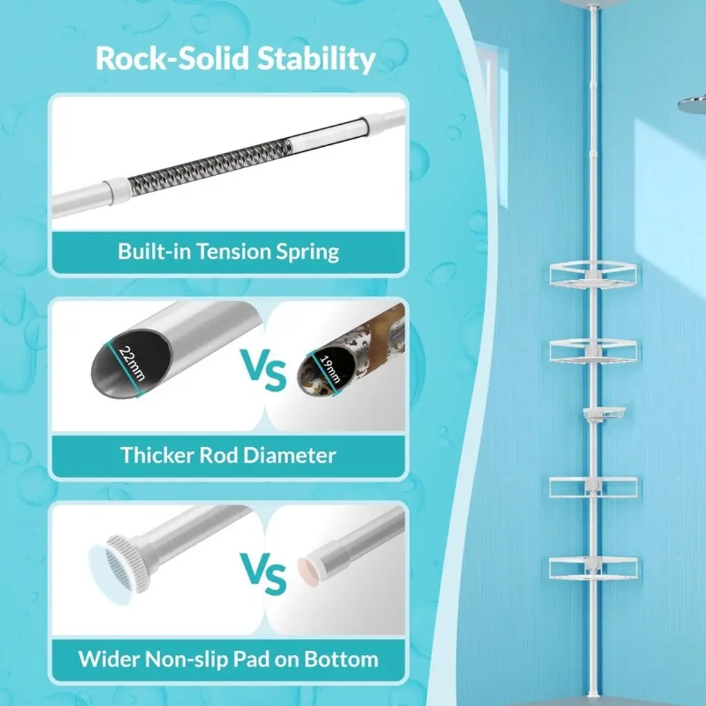 Shower Shelf Tension Bar, Rustproof Shower Shelf With 4 Shelves, No Drilling Required, Adjustable Corner Shower Stand - White