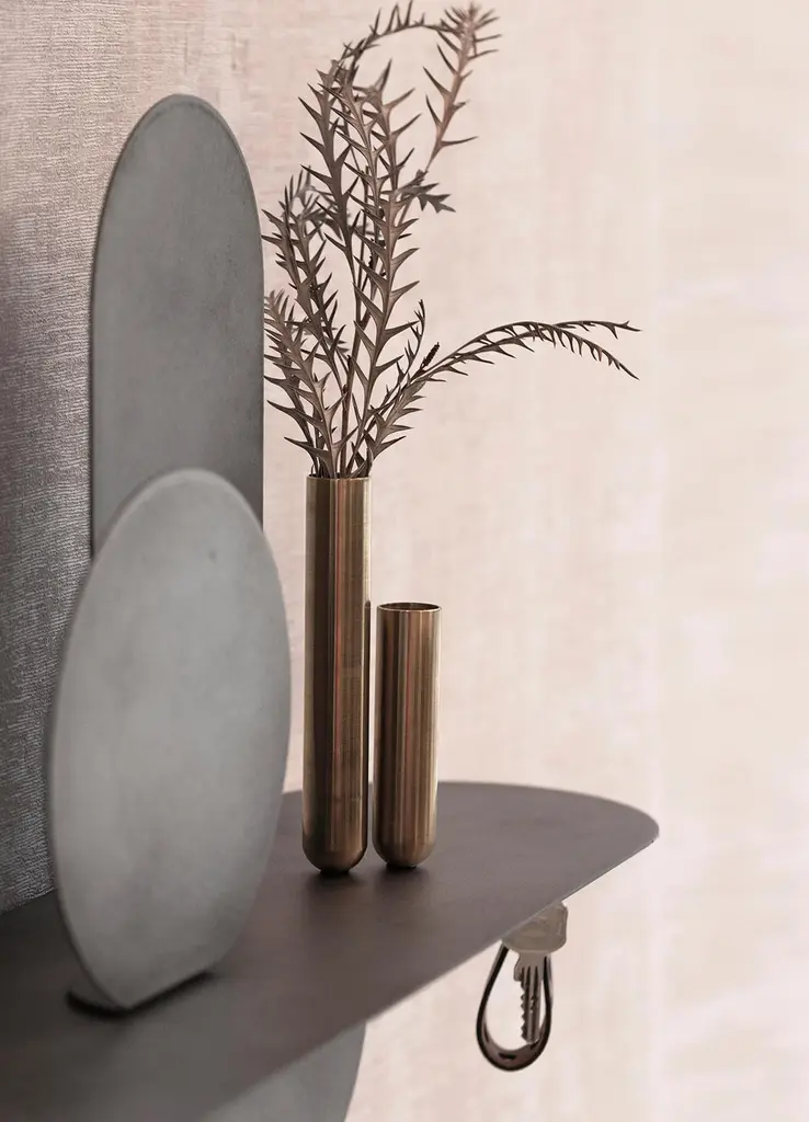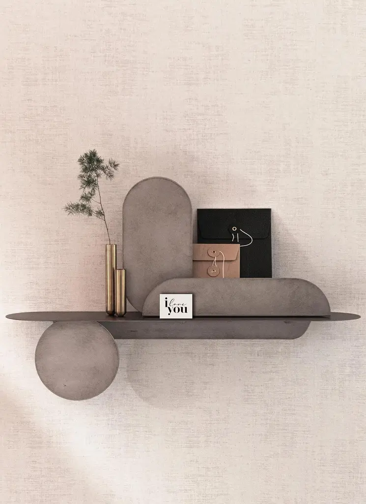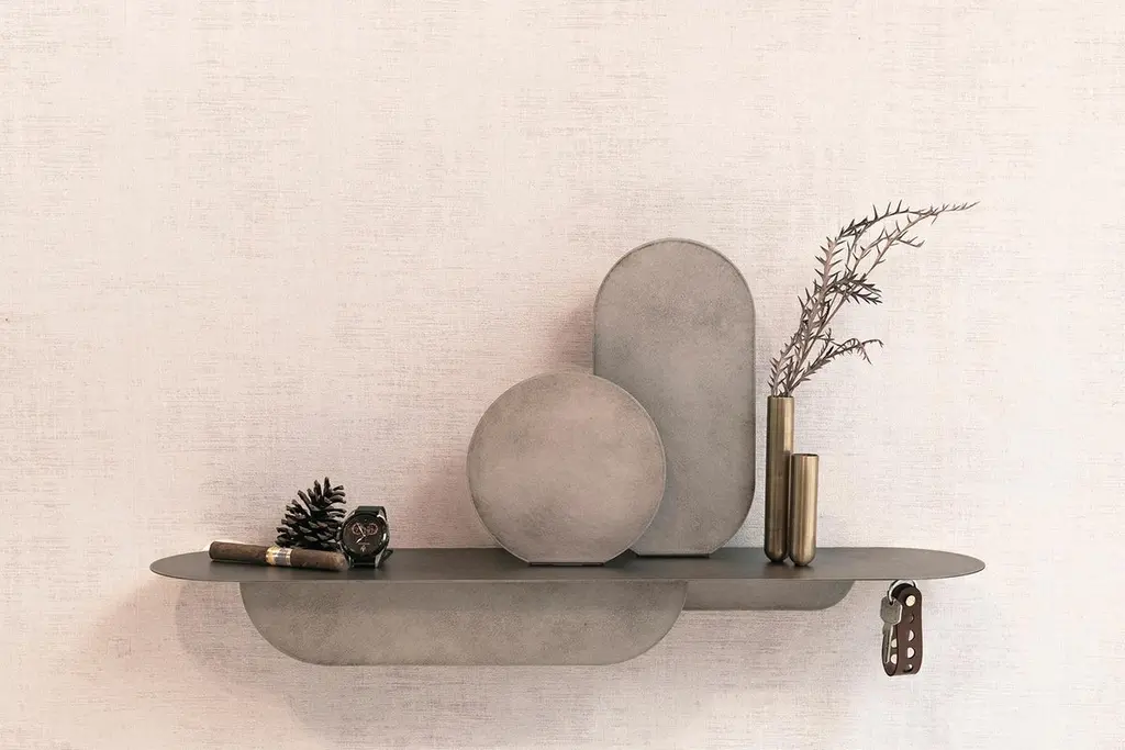 SIMPLY Foggy Shelf by Mademoiselle JoDimensions: L 76 x W 24 cm.Materials: Matte foggy steel.Available in two versions and two colors. Please contact us.Behind SIMPLY is actually a much more sophisticated object than its name suggests.Made of folded metal, SIMPLY is a thin and light shelf that can be easily attached to any type of support. The modularity of the shelf lies in the magnetization of the different elements that make it up and allow all possible variations according to the desires or needs of each person.The shelf can be placed in any room of the house to hold books, mail, make-up products, jewellery, keys, etc.The designer has designed it in two versions: a set of four pieces or a set of three pieces with a mirror; and made it available in two colours: powderedwhite for the SIMPLY White or foggy light steel for the SIMPLY Foggy version.Trained as a stylist at La Cambre, I have worked for 25 years to create trends, colours and fabrics for the world of lingerie. Architecture has always been my passion and as such, object design has become an obvious path for me.My approach is based on intuition, with a fascination for the material and the intention to offer something beautiful and different. My vision delicately intertwines heritage and technology, aiming to offer creations at the right price, designed to last and be transmitted, while trying to produce as local as possible and to highlight our know-how.A responsible commitment for a sustainable product.We offer products produced with great care in Belgium and Europe. Useful creations that make you smile, creations you pass on, objects that will have multiple usages in their different lives following the imagination of their owner.