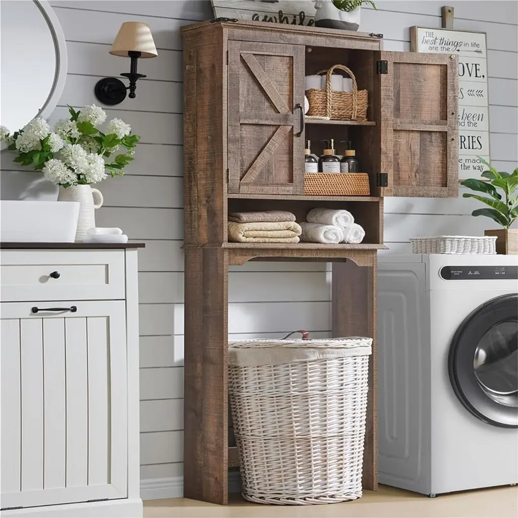 Our Farmhouse Bathroom Floor Cabinets, the perfect blend of rustic elegance and modern convenience. Designed specifically to maximize your bathroom's potential, these cabinets make the most of unused space above your toilet, transforming it into a functional and stylish storage solution.Space-Saving Masterpiece: These cabinets are a brilliant way to utilize vertical space, freeing up valuable floor area in your bathroom. By installing them above your toilet, you'll gain ample storage without compromising on comfort or aesthetics.Versatile Storage Options: Featuring two spacious doors that open to reveal adjustable shelves, you can customize the interior layout to suit your needs. Whether you're storing toiletries, cleaning supplies, or extra towels, these shelves offer the flexibility to organize your items efficiently. Additionally, the bottom of the cabinet boasts an open shelf, providing quick access to items you use daily.Effortless Assembly: We understand that setting up new furniture can be a hassle, but with our clear and concise installation instructions, assembling these cabinets is a breeze. Simply follow the step-by-step guide, and you'll have your new storage solution up and running in no time.Rustic Farmhouse Charm: Crafted from sturdy engineered wood, these cabinets bring a touch of rustic charm to your bathroom.Impressive Dimensions: Measuring 9 inches in depth, 24 inches in width, and an impressive 67 inches in height, these cabinets offer substantial storage capacity without overwhelming your bathroom's footprint. They're designed to fit seamlessly into your existing layout, providing both functionality and a beautiful focal point.