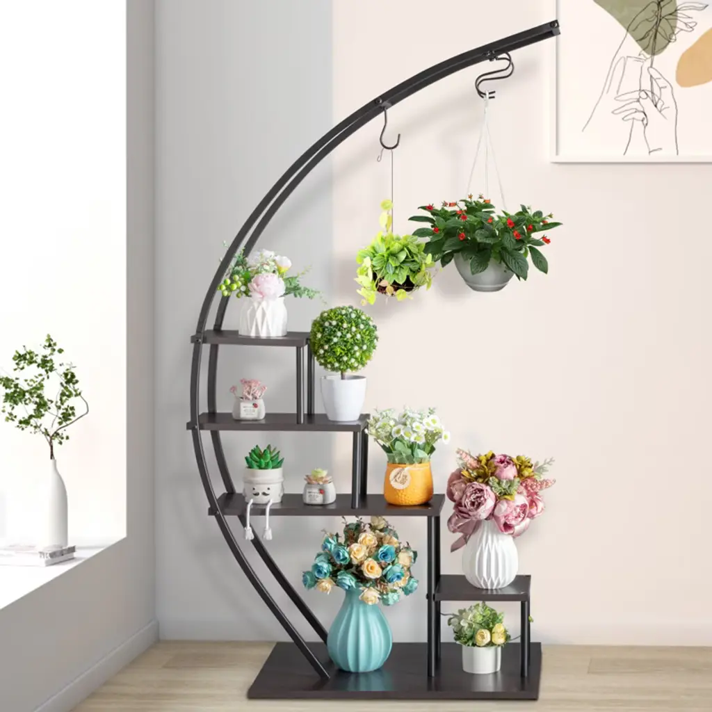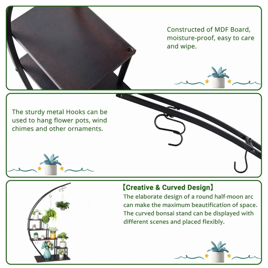 Organize and showcase your plants with this 1/2-Pack 5-Tier Semicircle Plant Display Stand. Each stand offers multiple levels to hold flower pots, herbs, or decorative items, making it perfect for living rooms, patios, balconies, bedrooms, or dining areas. The unique semicircle design adds visual interest while maximizing vertical space. Crafted with iron pipe frames and MDF shelves, these stands resist rust and provide stable support for your plants or décor. Beyond plants, they can also be used to display books, photo frames, collectibles, or other decorative items. Lightweight, sturdy, and easy to assemble, these stands bring both functionality and style to any home or garden setting.