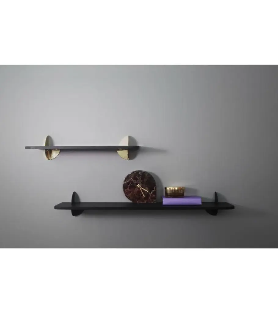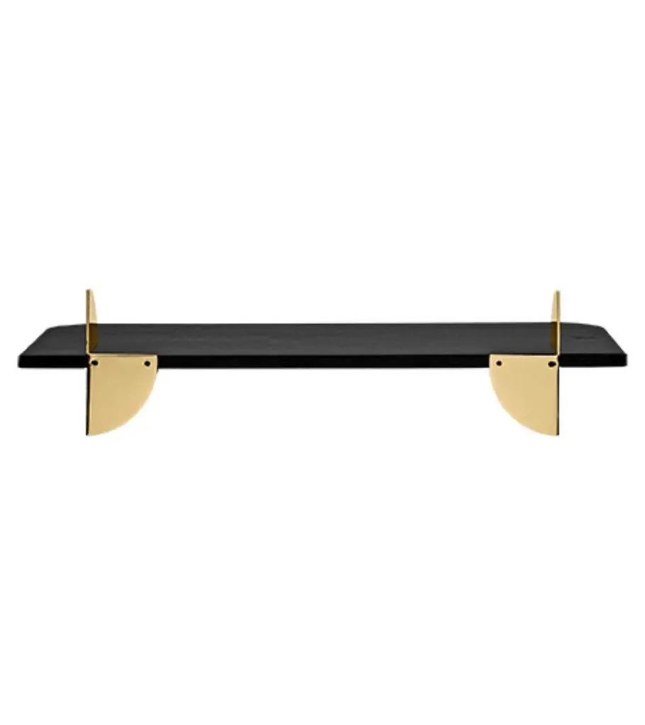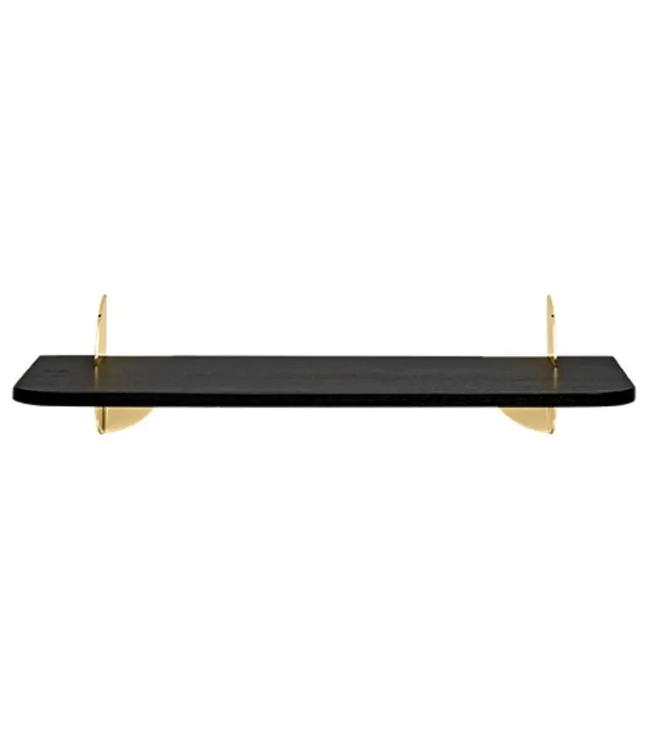 Small black and steel minimalist shelf Dimensions: L 50 x W 18 x H 12 cm Materials: Steel W. Powder Coating, Brass Plating & Black Ash MDF.Also available in Walnut and in size large.Simplicity always seems to make the most sense. The new shelf is simple but elegant with the unique detail of the brackets that makes them stand out. To elegantly display your decorative items is easily achieved with the new shelf. Choose the length and material to suit your home.