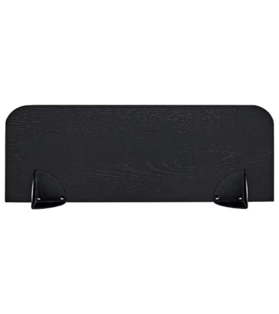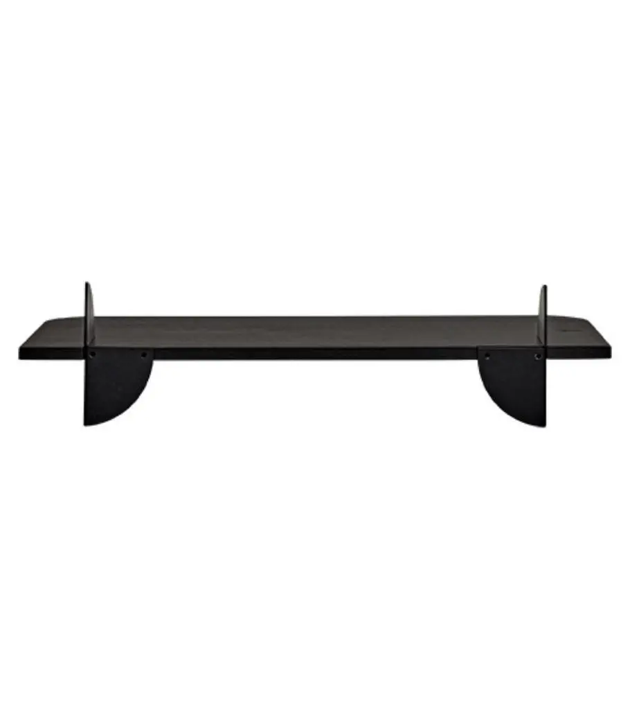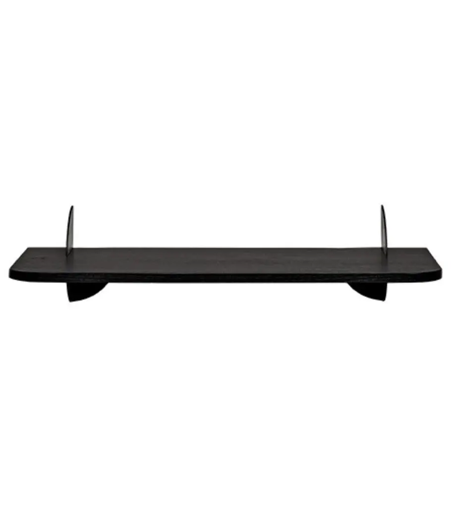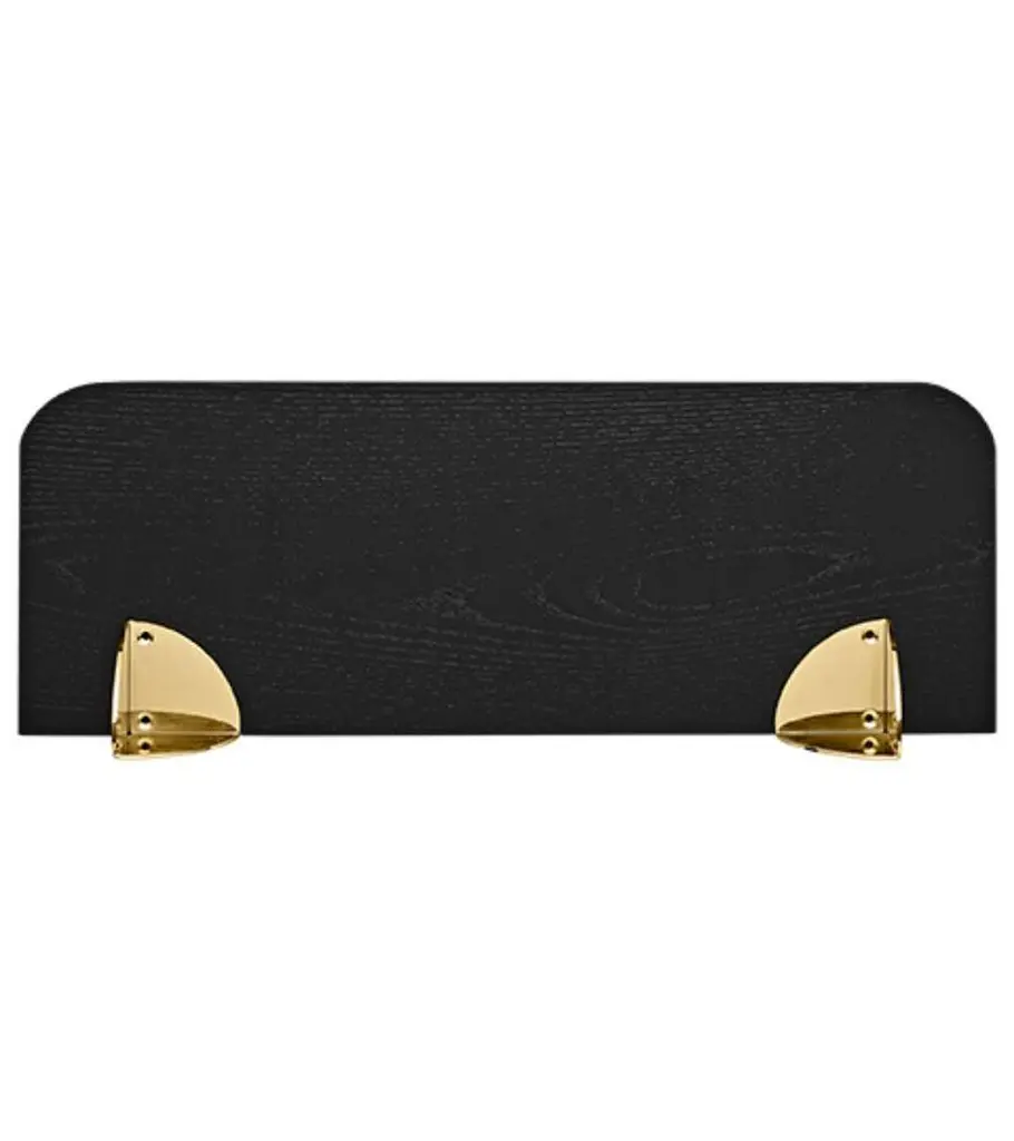 Small black and steel minimalist shelf Dimensions: L 50 x W 18 x H 12 cm Materials: Steel W. Powder Coating, Brass Plating & Black Ash MDF.Also available in Walnut and in size large.Simplicity always seems to make the most sense. The new shelf is simple but elegant with the unique detail of the brackets that makes them stand out. To elegantly display your decorative items is easily achieved with the new shelf. Choose the length and material to suit your home.
