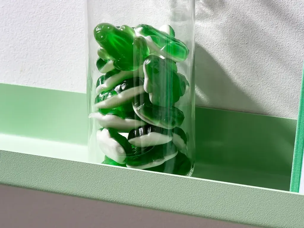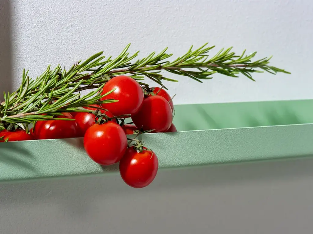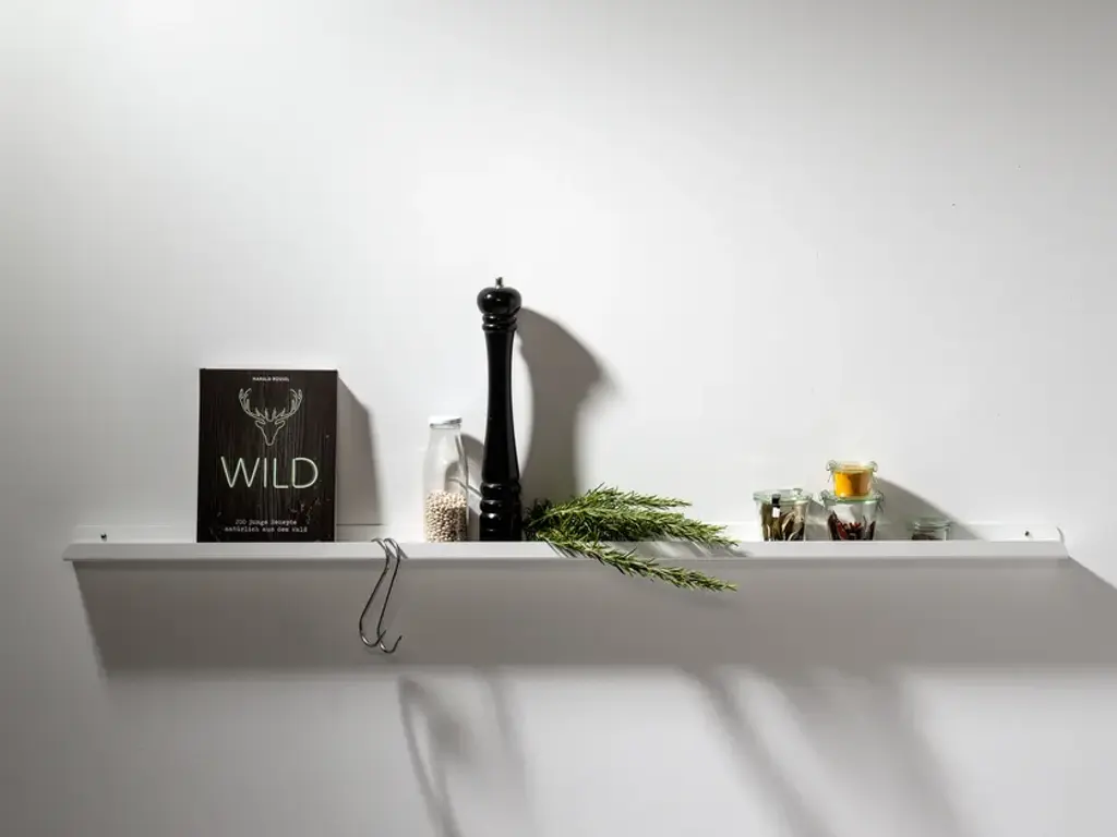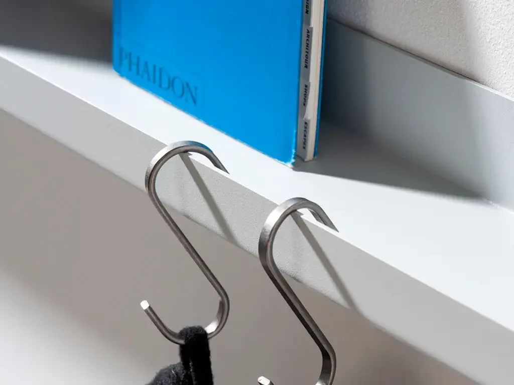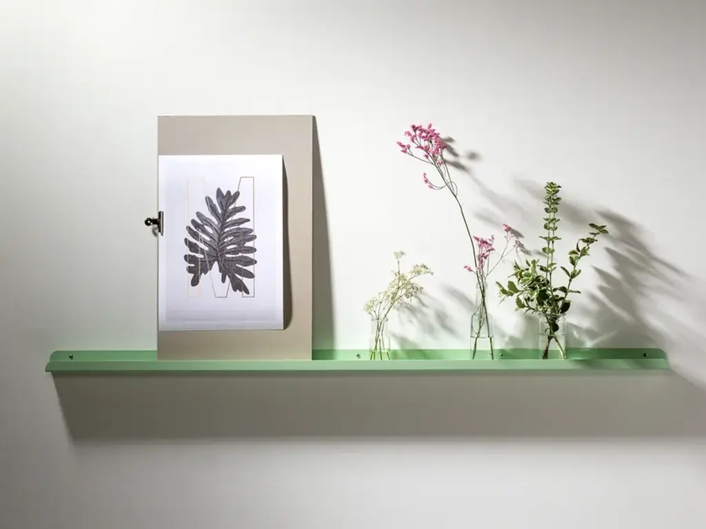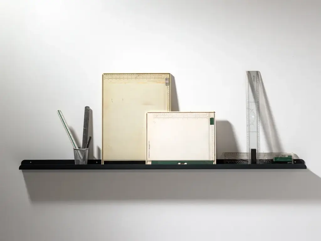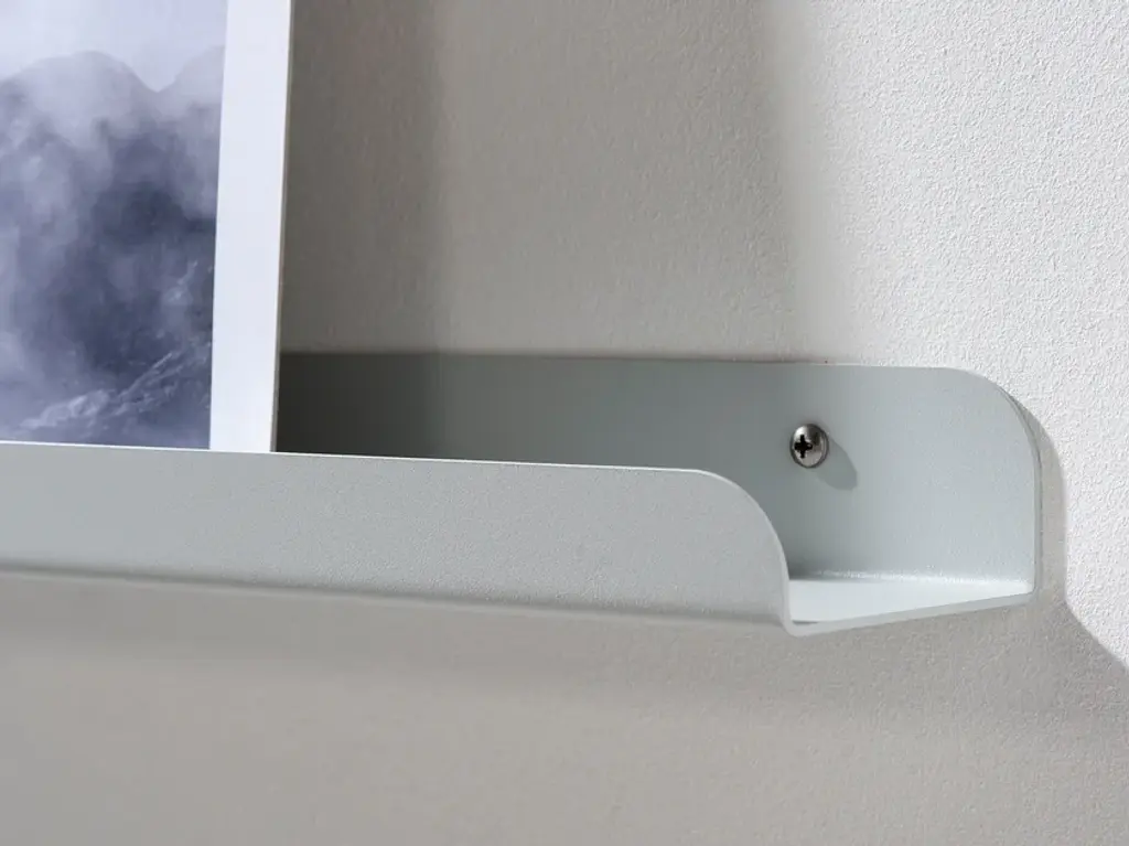With the Solid 04 Wall Shelf, storage, display, and home décor go hand in hand. The ledge offers space for knickknacks, while the upturned front edge keeps objects like picture frames in place. The front edge can accommodate S-hooks, clips, and magnets, providing a wide range of uses.In the office, the wall shelf is a handy resting place for mood boards and poster boards, which can be displayed side by side or stacked vertically behind one another. And in a child’s bedroom, it offers an ideal spot for displaying their personal collection of favorite pictures, books, or figurines.The Solid 04 Wall Shelf can hold at least four A3-size picture frames placed vertically or three placed horizontally. Alternatively, there is enough space to display one or two A2-size prints or poster boards on the ledge. Available in four colors.Material: Steel sheet with powder coatingPurchase includes: Wall shelf, mounting hardwareIn designing our Solid & Grid collection, we set out to create a style-defining, recurring graphical structure for furniture and home accessories. We were aiming for a pattern that looks light and elegant while offering sturdy durability. And we achieved this with a diagonally cut grid made of steel. After we came up with our first models featuring diagonal slits, we designed several solid versions as well. All furniture and home accessories in the Solid & Grid collection are precisely cut using a laser and covered with a durable powder coating.