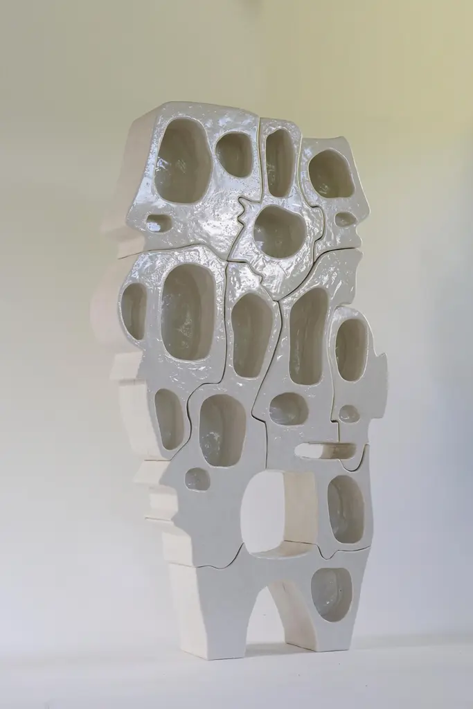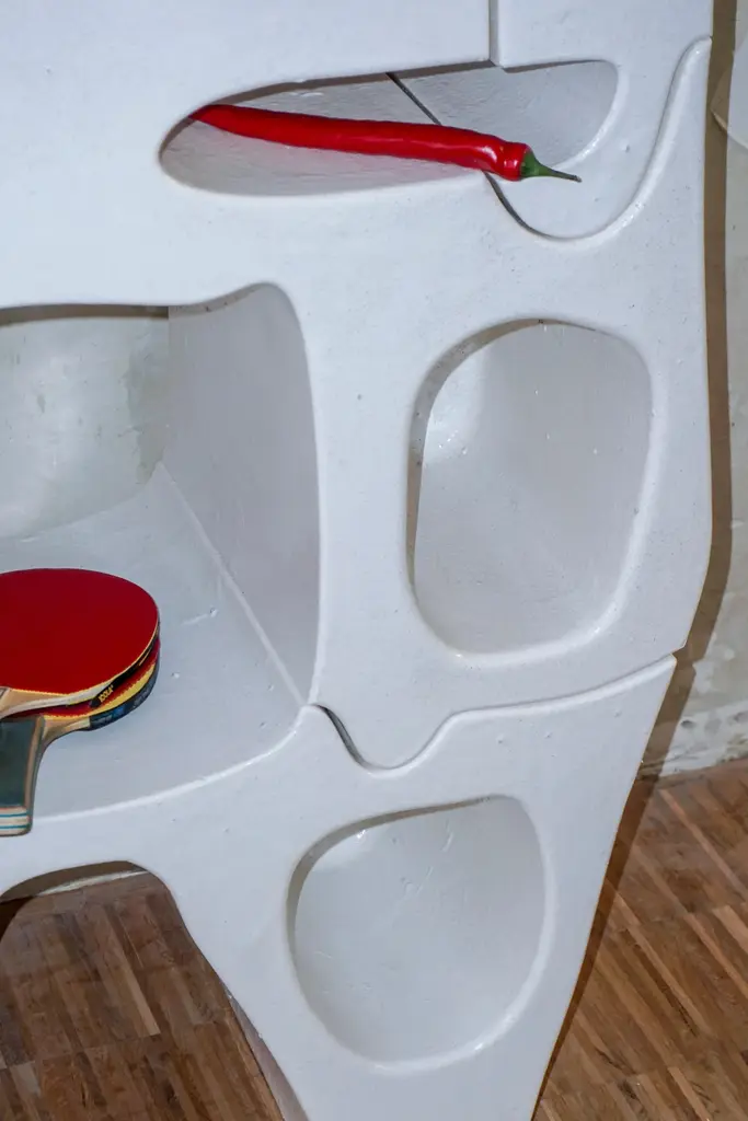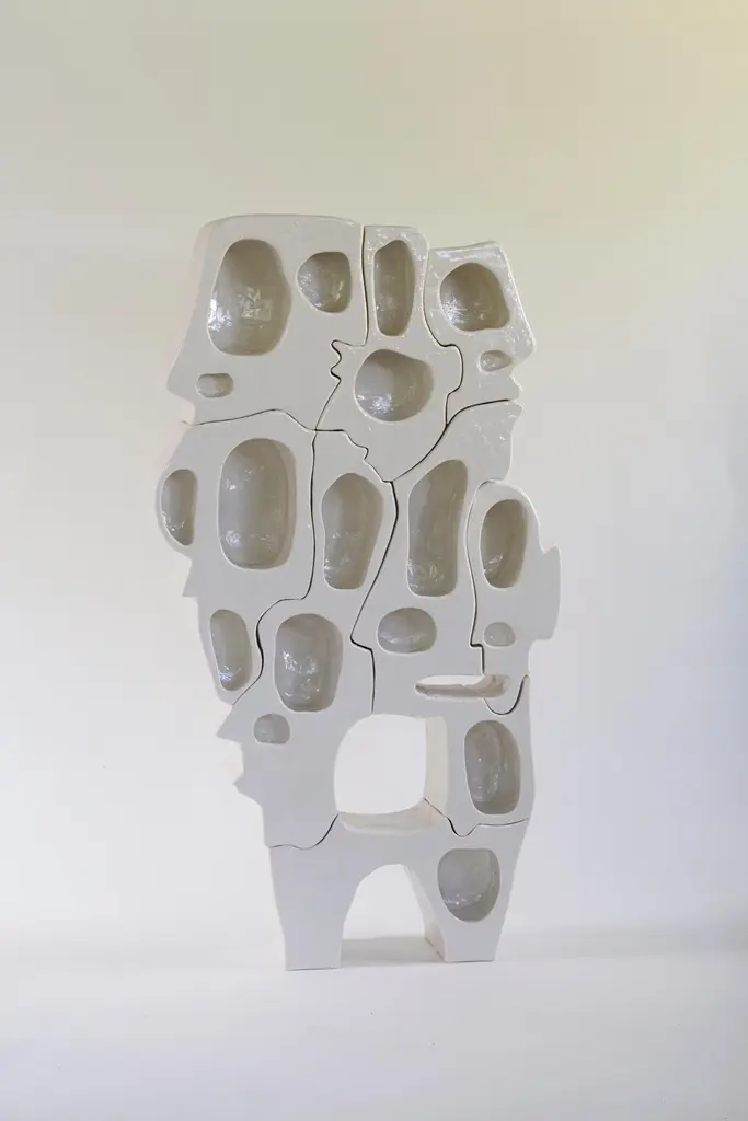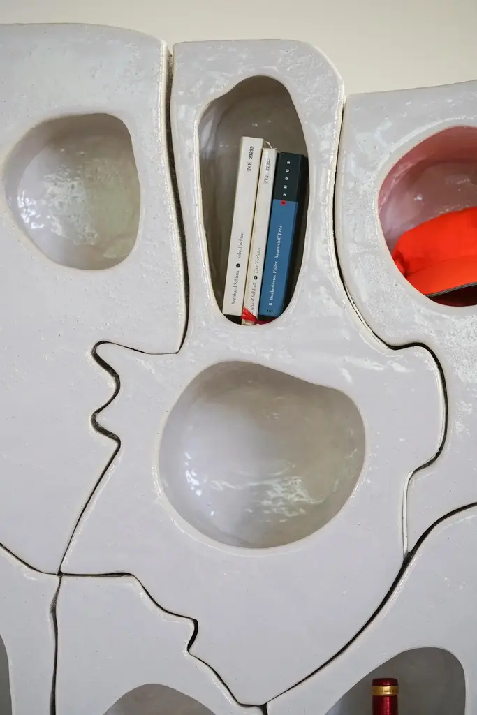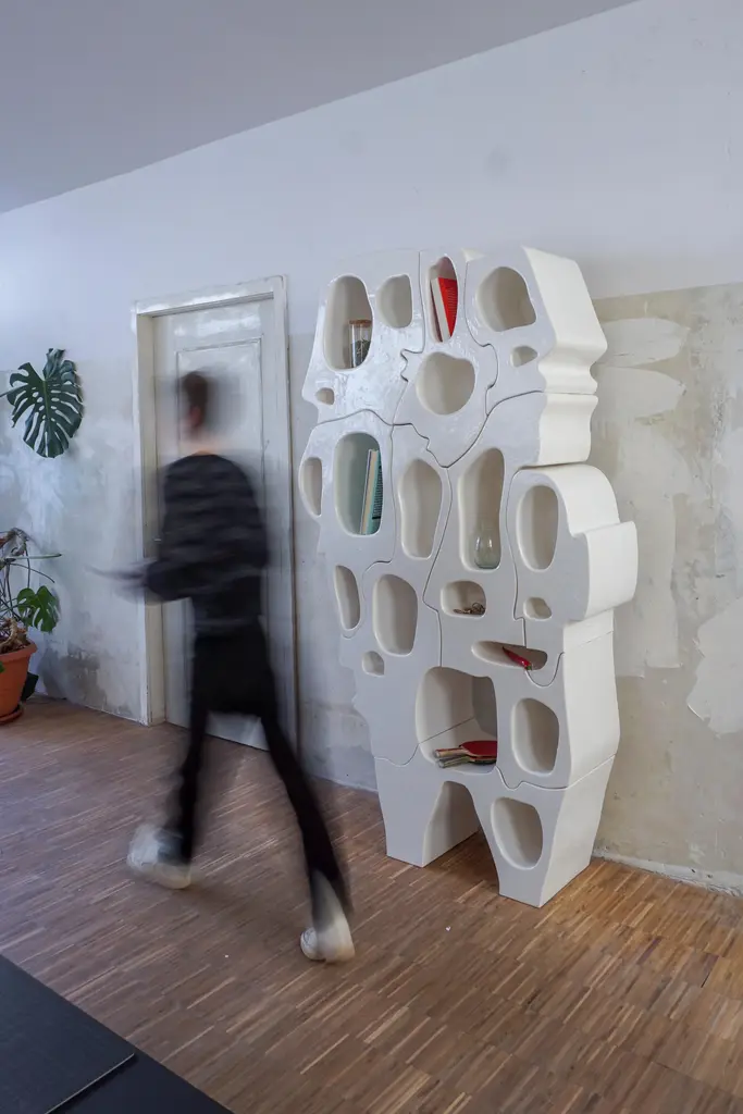 Spectator shelf by freia achenbach limited edition of 50 dimensions: d 110 x w 33 cm x h 200 cm materials: resin, sand, foam if a sensory stimulus is offered to our perception, the spirit accepts this piece and complements what is missing. The amorphly shaped shelf is not only offering storage space, but stimulates the mechanism of projection and alludes to different faces that can only be recognized at second glance. The different pieces interlock in such a way that they stabilize each other and no further connecting part is necessary. Freia achenbach is a stuttgart-based object, furniture, and spatial designer. Her approach allows movement between disciplines and playfully explores material, form, and color. In her work freia achenbach experiments with a wide variety of materials and both traditional and innovative manufacturing processes. Her objects always tell a story and bring a certain ambiguity with them. All objects are handmade and/or created in collaboration with small manufactories. She produces objects as unique pieces as well as in small series and realizes commissioned works for customers this piece is attributed to the mentioned designer/maker. It has no attribution mark and no official proof of authenticity, however it is well documented in design history. I take full responsibility for any authenticity issues arising from misattribution