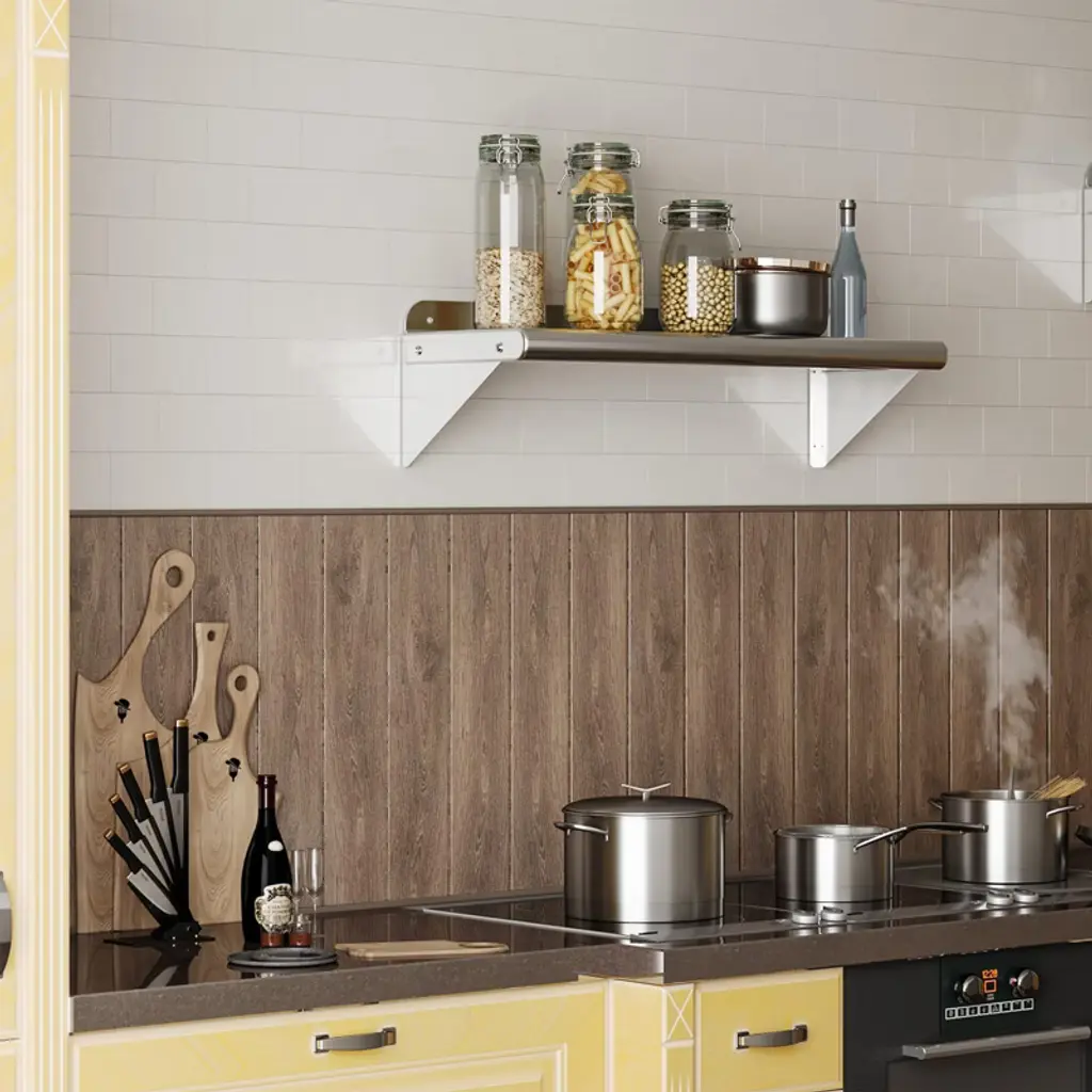 1.Sturdy & Secure Heavy-Duty Design Crafted from high-grade stainless steel, this wall-mounted shelf features a robust interlocking triangular bracket system that ensures exceptional stability. Widened anti-slip grooves on the surface keep cookware, tools, and containers firmly in place, while the patterned base prevents bottles and small items from sliding. Its advanced weight distribution design eliminates wobbling and noise, even when loaded with heavy items¡ªmaking it ideal for storing pots, cans, or garage equipment. 2.All-Environment Resistance Equipped with a micro-porous protective coating, the shelf resists corrosion, rust, and tarnishing, standing up to kitchen steam, garage humidity, and daily exposure to water or cleaning agents. Smooth, rounded edges prevent scratches during cleaning or item placement, preserving its polished, professional look for years. Whether in a busy kitchen, dusty garage, or utility room, it maintains durability and aesthetics. 3.Quick, Tool-Free Installation Designed for hassle-free setup, the shelf includes visual alignment stickers and pre-drilled templates to ensure precise mounting. A single person can complete installation in just 20 minutes on various surfaces¡ªtile, concrete, or wood walls¡ªno extra tools required. The intuitive design simplifies the process, making it accessible even for those with limited DIY experience. 4.Sleek, Space-Saving Storage With an industrial minimalist style, this floating shelf blends seamlessly into kitchens, garages, or workspaces, enhancing both functionality and decor. Its open-display layout keeps essentials within easy reach while maximizing vertical storage space, reducing clutter on countertops or floors. Perfect for organizing spices, utensils, or garage tools, it balances accessibility with efficient space usage. 5.Modular & Customizable Setup Upgrade your storage with compatible accessories (sold separately) like magnetic knife strips or foldable cutting boards, using the standardized side clip rails. The 5-angle adjustable backsplash adapts to uneven or sloped walls, ensuring a perfect fit in any space. This flexibility allows you to tailor the shelf to your specific needs, whether for culinary use, tool storage, or utility organization.