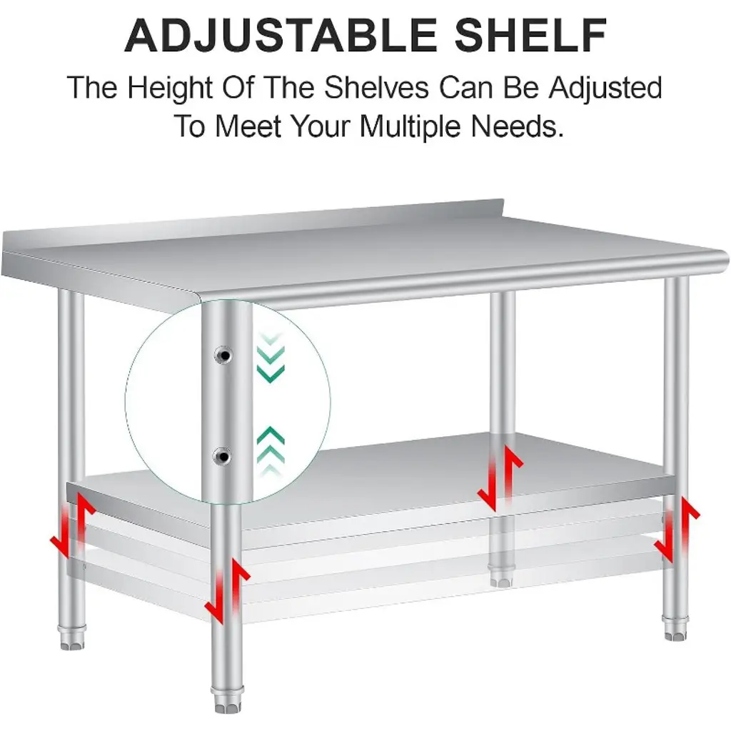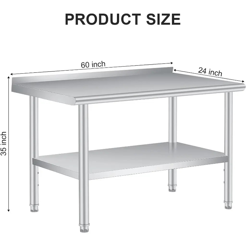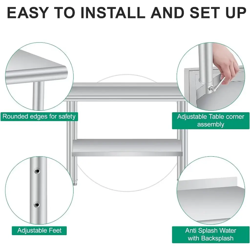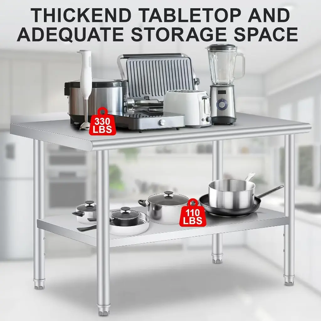【Super Thickness & Durable Stainless Steel Table】 Crafted with 0.8MM super thickened, rust-resistant heavy stainless steel, this Stainless Steel Prep Table ensures food safety compliance, effortless cleaning, and long-term durability for commercial kitchens, restaurants, and home use. 【Enhanced Safety & Organization with Stainless Steel Work Table】 This Stainless Steel Work Table features rounded edges to prevent injuries and a non-marring feet holder, maximizing workspace efficiency while keeping your area clutter-free and well organized. 【Heavy-Duty Load Capacity Stainless Steel Prep Table】 Designed to support up to 660 lbs on the top and 440 lbs on the adjustable bottom shelf with 3 height settings, this Stainless Steel Prep Table maximizes vertical storage for heavy appliances, tools, or bulk ingredients. 【Versatile Multi-Scenario Use Stainless Steel Work Table】 Perfect for food prep, garage workshops, or warehouse storage, this Stainless Steel Work Table’s scratch-resistant surface and robust design deliver reliable performance in any environment. 【Quick Assembly & Hassle-Free Setup Stainless Steel Table】 Featuring pre-drilled holes and clear instructions, this Stainless Steel Table allows for easy installation within minutes and is backed by a satisfaction guarantee for worry-free purchasing.