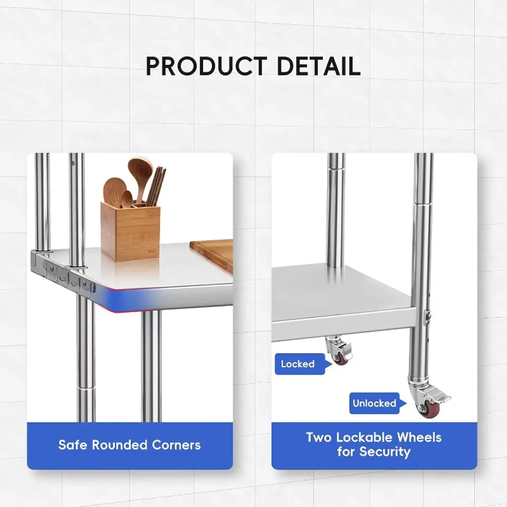 Enhanced Load Capacity: The stainless steel table boasts impressive weight capacities for both the top shelf and undershelf, ensuring that you can confidently store heavy items and equipment without compromising the table's stability or durability. Dual Removable Shelves: Featuring double-layer removable shelves, this table provides additional storage space and flexibility in organizing your items. The detachable hooks on the sides offer convenient options for hanging tools or utensils, maximizing efficiency in your workspace. Hygienic and Easy to Clean: Constructed from high-quality stainless steel, this table is resistant to corrosion and is easy to clean, making it a safe and hygienic choice for food preparation environments. The surface drawing treatment adds a protective layer, ensuring longevity even in busy settings. Generous Workspace: With ample dimensions of 36 x 24 inches, the stainless steel table offers a spacious surface for food preparation and storage needs. The adjustable undershelf allows you to customize the storage space to suit your requirements, promoting organization and easy access to essential items. Wide Range of Applications: From kitchens and gardens to workshops and hospitals, this versatile stainless steel table is designed to be adaptable to various settings. Whether you need a reliable surface for work tasks or storage solutions in different environments, this table caters to a wide range of needs, making it an indispensable addition to any workspace.
