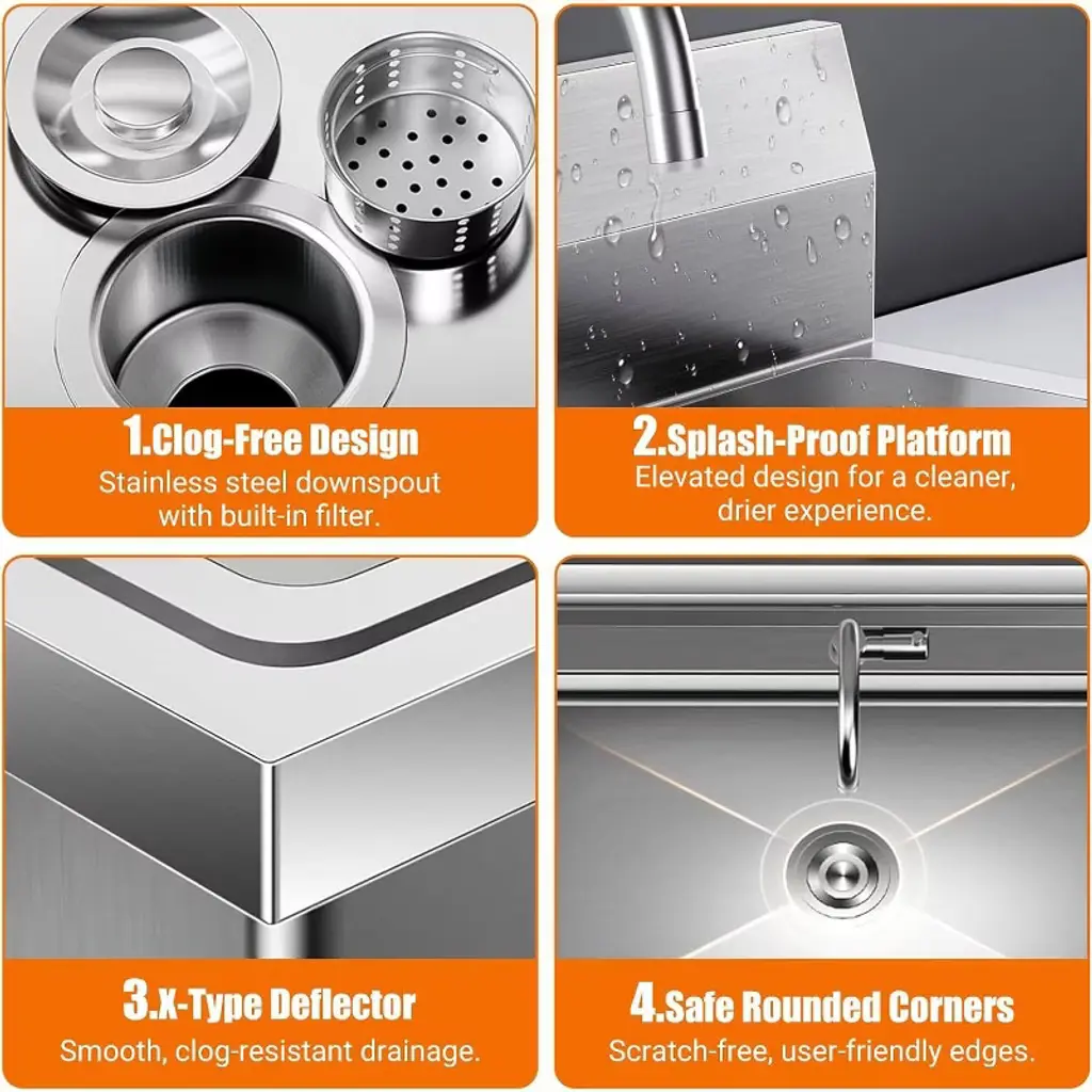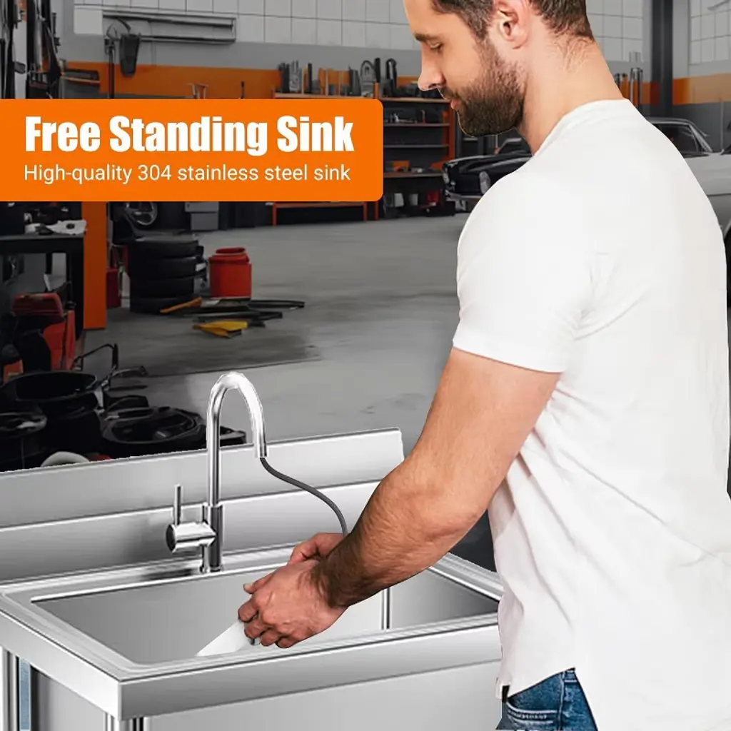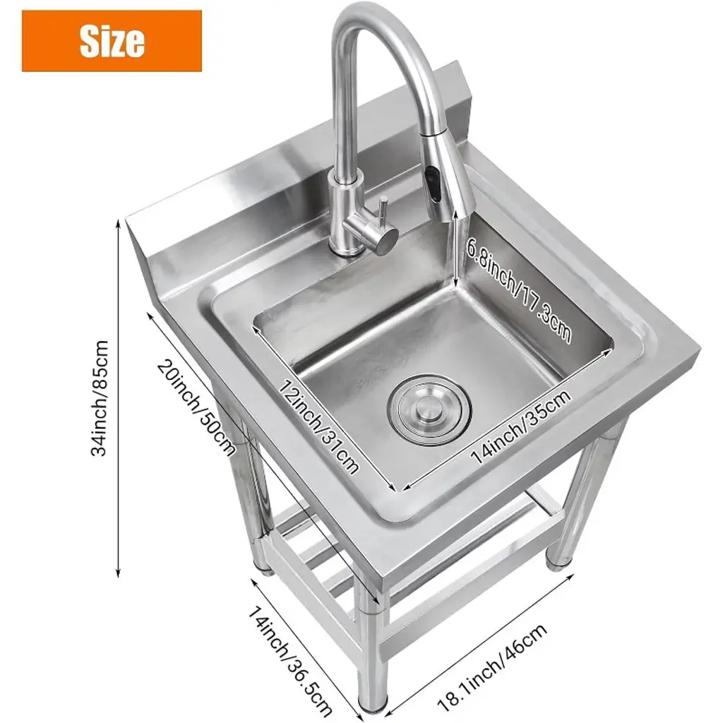 Meet your new go-to cleaning station—built tough to handle whatever the day brings. Crafted from commercial-grade stainless steel, this freestanding utility sink stands up to heavy use, indoors or out, season after season. No rust, no fuss—just a reliable spot for all those messy tasks. Its deep 20x20 inch single basin gives you plenty of room to wash garden tools, rinse off muddy boots, clean big pans, or even bathe a small pet. No more bending uncomfortably or dealing with splashes all over the floor. And since it’s freestanding, you can place it exactly where you need it—no drilling or wall-mounting required. Think garage, backyard patio, laundry room, or behind the counter in your food truck. The included faucet and handy storage shelf below keep everything organized and within reach. Stop struggling with cluttered spaces and make cleanups simpler. Whether you’re working in a busy restaurant kitchen or just need a sturdy sink for home chores, this sink brings practical, no-nonsense functionality to your routine. Easy to install and ready to work right out of the box. Give yourself one less thing to worry about.