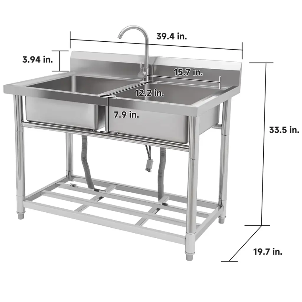 Stainless Steel Utility Sink, Commercial Prep Sink, Storage Shelf & Adjustable Legs for Kitchen, Laundry Room (Double Sink w/Faucet)